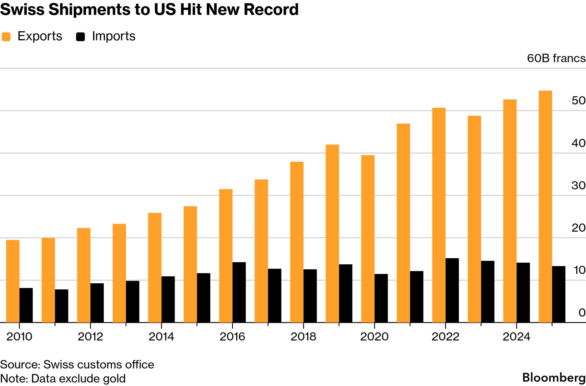 Seen and Heard on Bloomberg![]() Deutsche Bank is enjoying a "really strong start" to 2026 after it closed out a record year for profit with higher trading income and a new share buyback, according to CFO James von Moltke. The results were overshadowed by a surprise raid on its headquarters yesterday, as part of a money laundering probe looking at past dealings by staff with firms linked to Roman Abramovich. "We're cooperating as we do in each case with the prosecutor in their search," von Moltke told Bloomberg TV. Chart of the Day![]() Switzerland exported a record amount of goods to the US last year despite Trump slapping some of his highest tariffs on the country. Swiss shipments worth $71.5 billion — excluding gold — went to the world's biggest economy, a 3.9% increase from the previous year, according to official data. Coming up