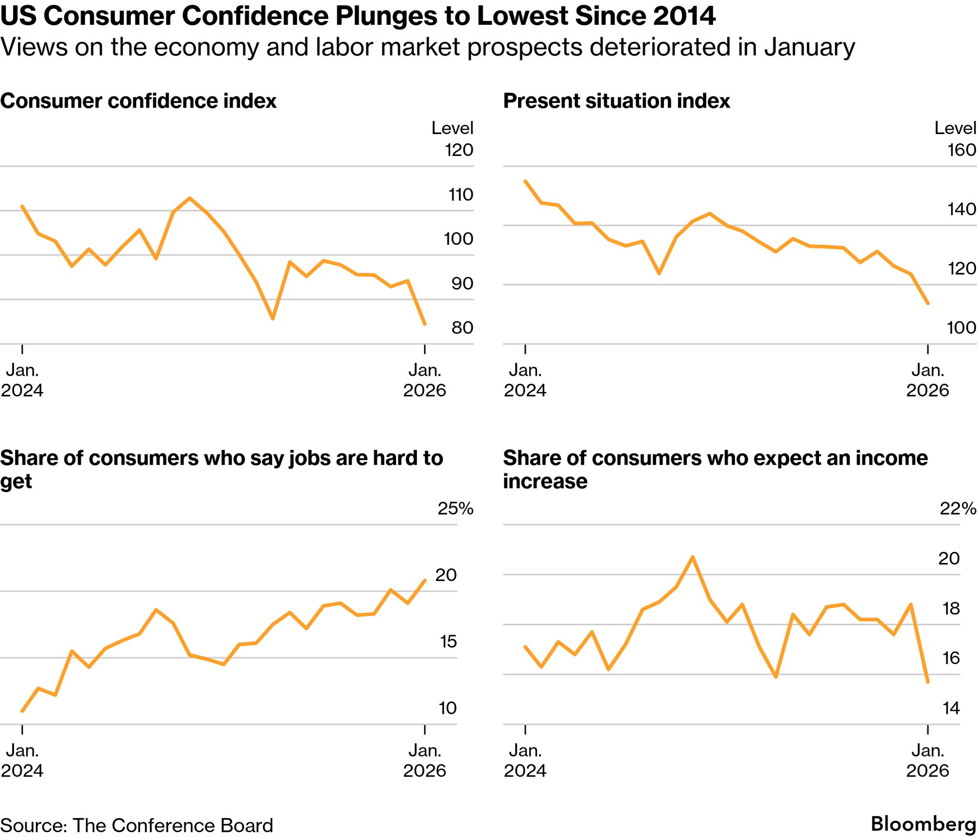 | US consumer confidence plummeted in January to the lowest level in 12 years on more pessimistic views from Americans worried about the nation's economy, inflation and a weakening labor market. The gauge by the Conference Board decreased to 84.5, from an upwardly revised 94.2 last month, data out Tuesday showed. The figure was the lowest since May 2014 and fell short of all estimates in a Bloomberg survey of economists. After a slight improvement in December, American consumer confidence resumed its downward slide. Economists project the labor market will largely remain stagnant this year, with limited job opportunities. In write-in responses to the survey, consumers often mentioned prices of oil, gas and groceries, said Dana Peterson, chief economist at the Conference Board. Mentions of politics, the labor market and health insurance also rose. The share of consumers that said jobs were currently hard to get was the highest since February 2021, while the portion saying jobs were plentiful deteriorated. Fewer Americans expect their incomes to rise in the coming months, prompting consumers to cut back on vacation plans and approach big-ticket purchases like new cars more cautiously. —Jordan Parker Erb and David E. Rovella | |