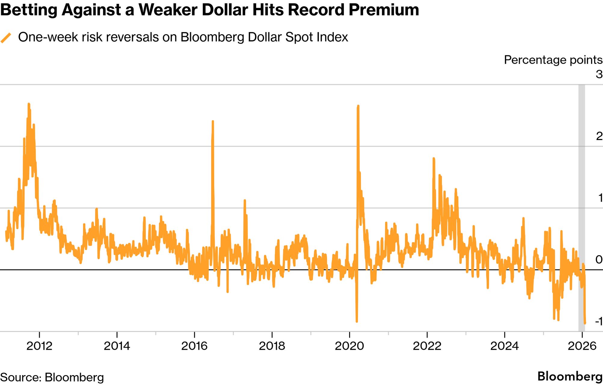 | Dollar traders are paying the most on record to bet on a deeper selloff in the greenback as an increasingly destabilized US triggers a rush into bearish hedges. The premium for short-dated options that profit from a weaker US currency has widened to the highest level since Bloomberg began compiling the data in 2011. The bearish sentiment isn't confined to the front-end—investors are the most pessimistic on the dollar's long-term outlook since at least May 2025. But for Trump on Tuesday, down was up. As the president arrived in Iowa to tout his recent attempts to address affordability issues, he was asked what he thought of the dollar's plight. He said, "I think it's great." | |