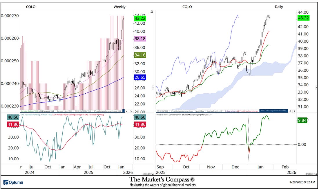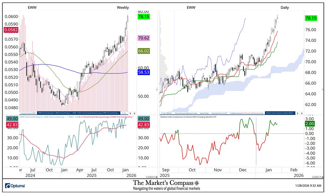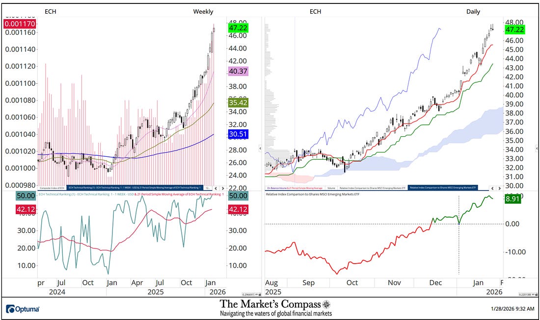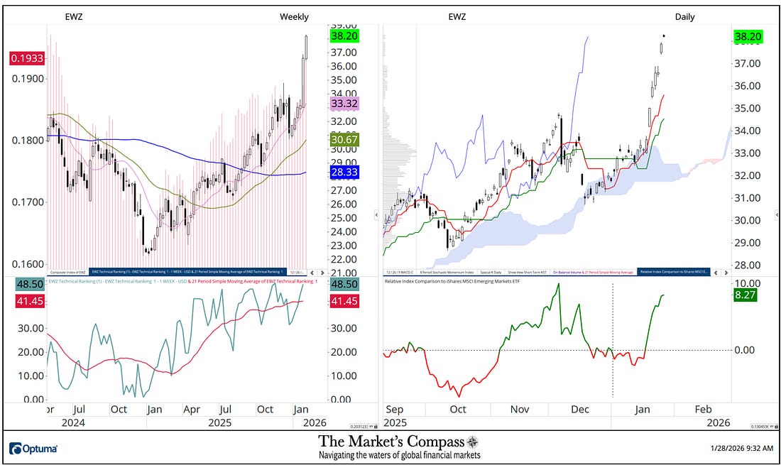 What follows are the charts of the five Lat/AM that I track in the Market’s Compass Emerging Markets Country ETF Studies that is sent to my paid subscribers. This is a “one off” that focuses on the currencies of the five ETFs that is posted on the Weekly charts as a histogram (red horizontal lines) on the left as well in the lower panel of the Weekly chart is my Objective Technical Ranking which is the backbone of the EM Studies that can range between 0 and 50. To understand the methodology used in constructing the objective EM Country ETF Individual Technical Rankings visit the Markets Compass technical indicators page at www.themarketscompass.com and select “em country etfs”. What follows is a Cliff Notes version* of the full explanation of the methodology I use… *The technical ranking system is a quantitative approach that utilizes multiple technical considerations that include but are not limited to trend, momentum, measurements of accumulation / distribution and relative strength of each individual 20 EM Country ETFs that can range between 0 and 50. To the right of the Weekly Chart is a Daily Cloud chart. In the lower panel of that chart is Relative Index Comparison Line vs. the iShares Emerging Markets ETF or EEM that highlights the outperformance vs. the EEM starting at the beginning of the year (black dashed crosshairs). Although the outperformance numbers are not shown as a % per se, the numbers to the right are the outperformance percentage. For example, the Global X Columbia ETF which is the first chart presented is up 9.84% vs. the EEM since start of the year. Of the three geographic regions that are covered in the Emerging Markets Country ETF Studies that cover 20 ETFs that represent Asia/Pacific, EMEA and Latin America, Lat/Am has by far outperformed the other two regions since the start of the year. Global X Columbia ETFiShares MSCI Chile Index Fund ETFiShares MSCI Mexico Index Fund ETFiShares MSCI Peru ETFiShares MSCI Brazil Index Fund ETFThere are three ETF Studies that include the Market’s Compass US Index and Sector (USIS) ETF Study, the Developed Markets Country (DMC) ETF Study and the Emerging Markets Country (EMC) ETF Study that in total cover 71 ETFs. The three Studies are normally published every three weeks and are sent to my paid Substack subscriber’s email. There is also a Weekly publication that is sent to paid subscribers every Sunday titled The Market’s Compass Crypto Sweet Sixteen Study that tracks the technical condition of sixteen of the larger cap Cryptocurrencies. Charts and price data are courtesy of Optuma. Any time series data including my ETF Technical Rankings can be imported, charted, and back tested in Optuma*. *Tip of the hat to Darren Hawkins at Optuma for his assistance in structuring the Relative Strength panels. The following links are an introduction and an in-depth tutorial on RRG Charts… You're currently a free subscriber to The Market's Compass Technical View. For the full experience, upgrade your subscription. |
