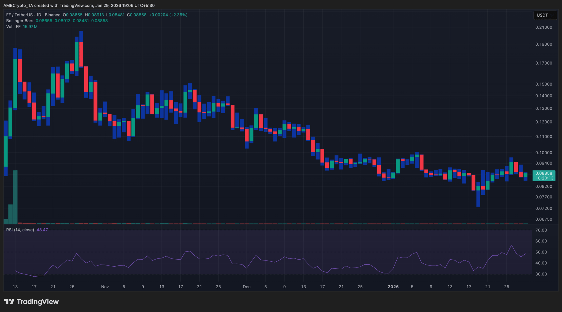 FF edged higher to $0.0885 in the latest session, posting a mild intraday gain while remaining range-bound. Price action stayed compressed within the Bollinger Bars, while RSI hovered near neutral, reflecting consolidation rather than trend strength.