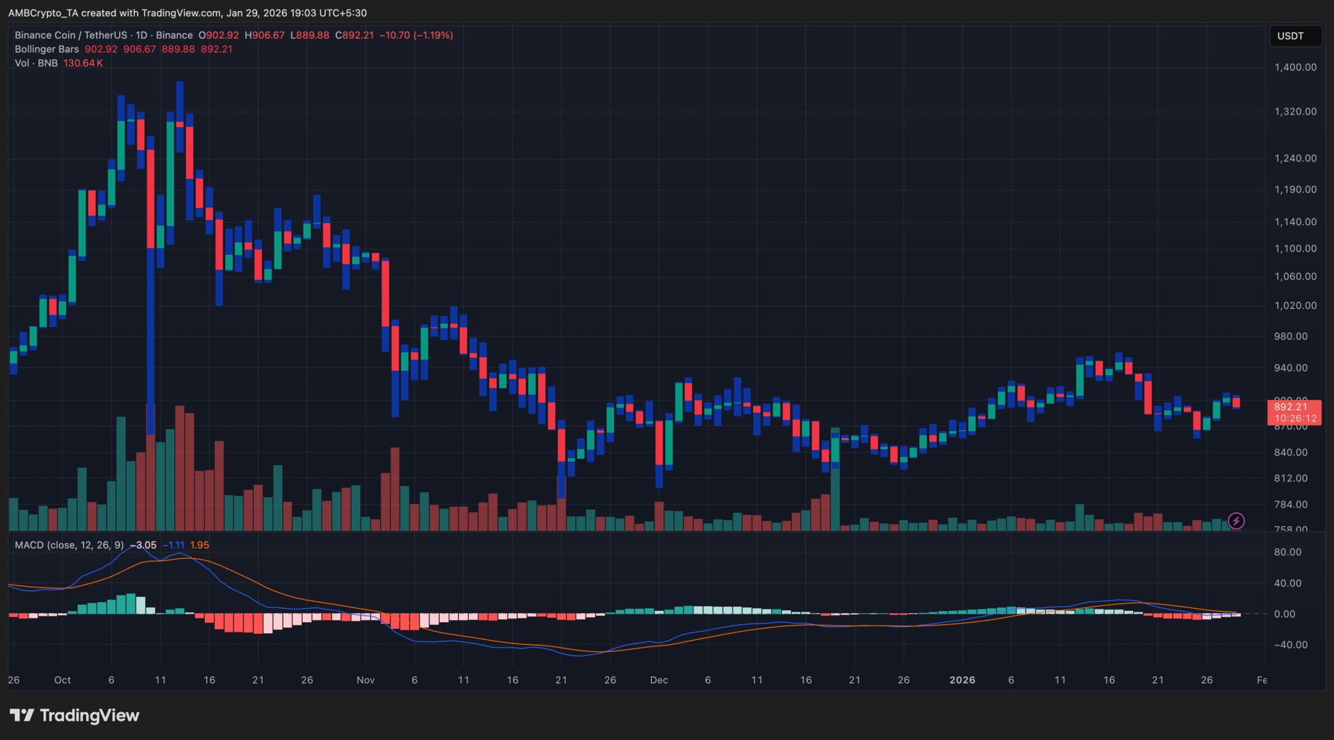 BNB's latest dip unfolded amid a broader risk-off tone across crypto markets, which weighed on large-cap assets. Price failed to build on earlier rebounds and instead consolidated after facing repeated rejection near the $920–$930 zone. Bollinger Bars stayed relatively tight, signaling subdued volatility and limited directional conviction. |