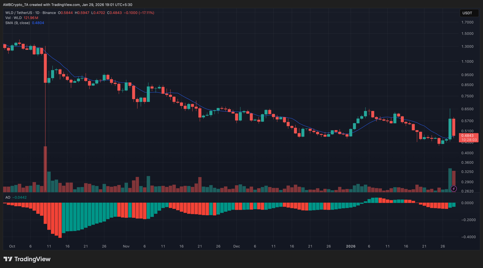 WLD rebounded to $0.4843 after defending recent lows, briefly diverging from a weaker broader market as dip buyers stepped in. Short-term momentum improved, with price reclaiming the 9-day SMA and the Awesome Oscillator printing green bars despite remaining below zero.