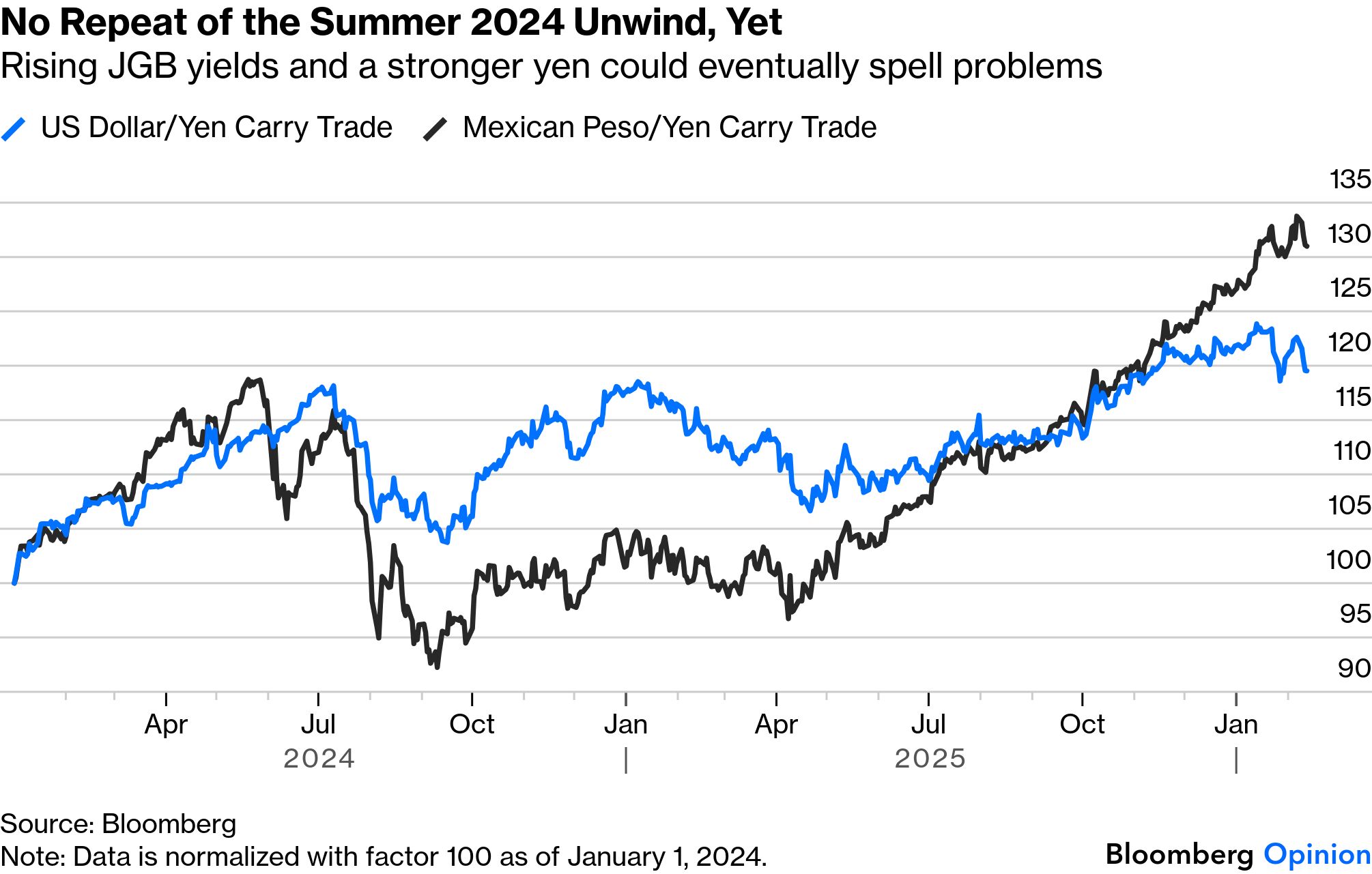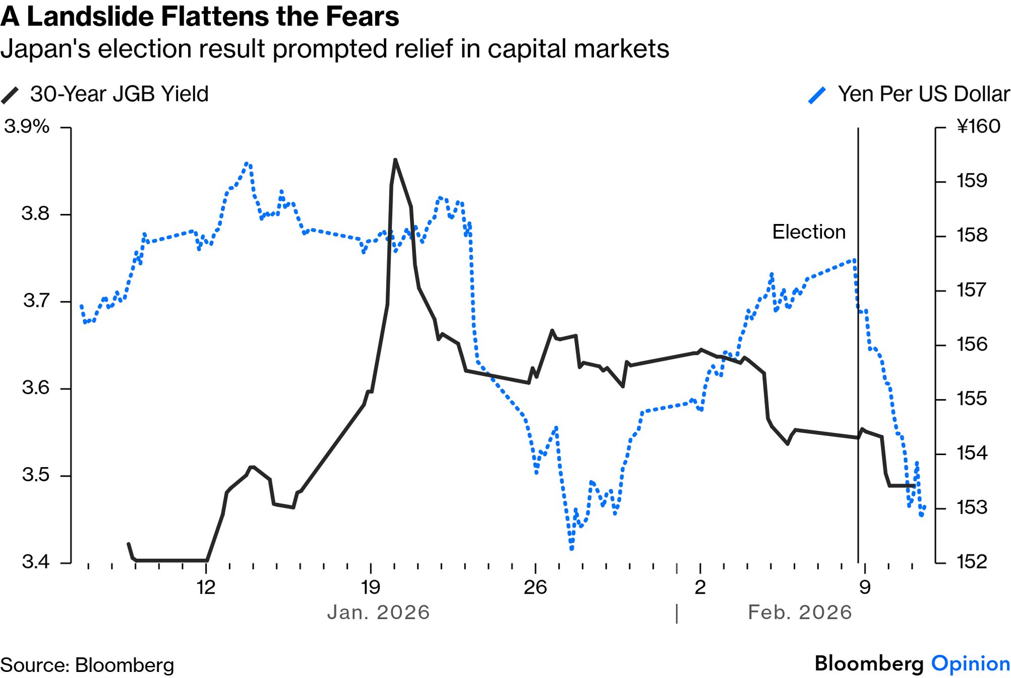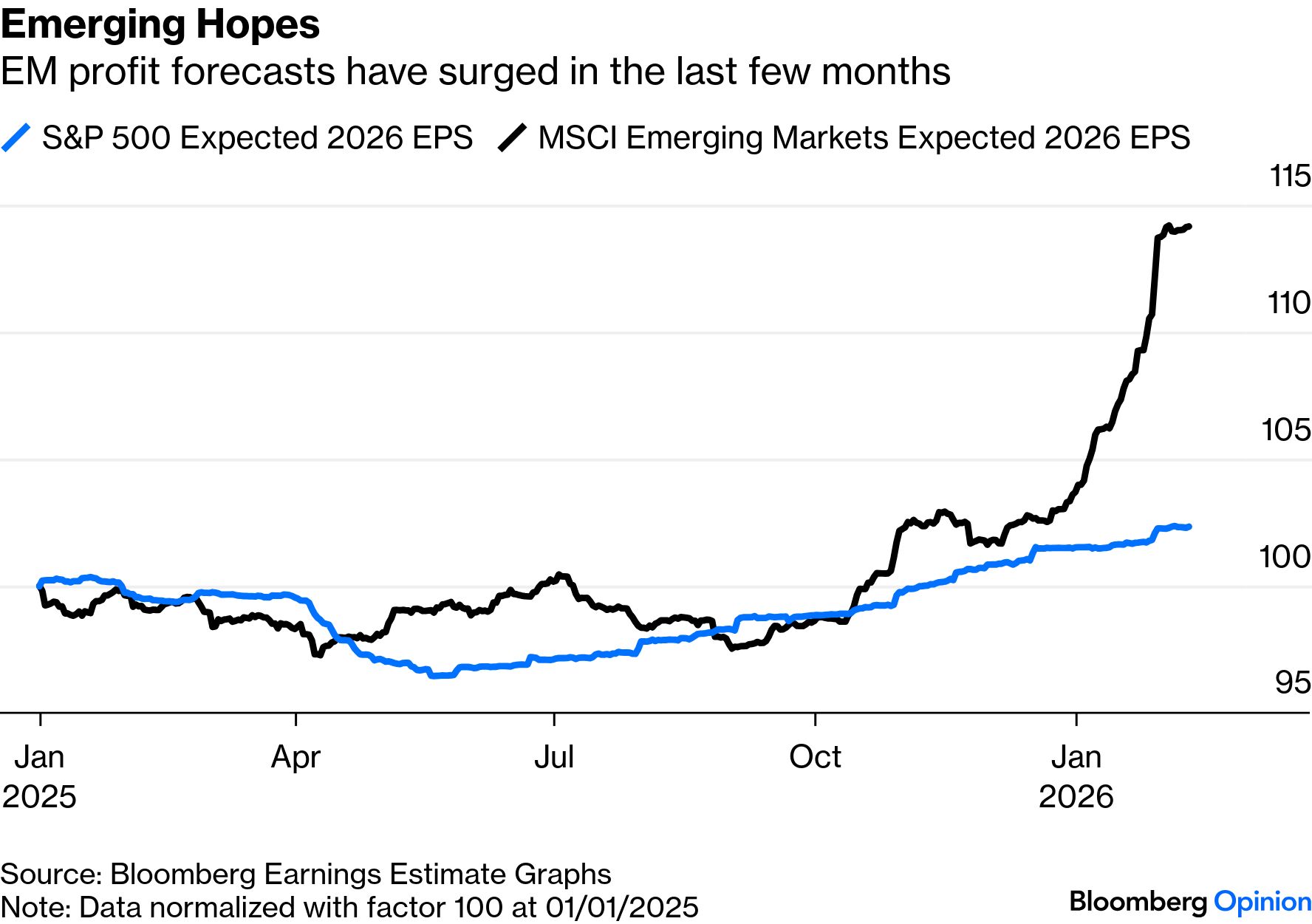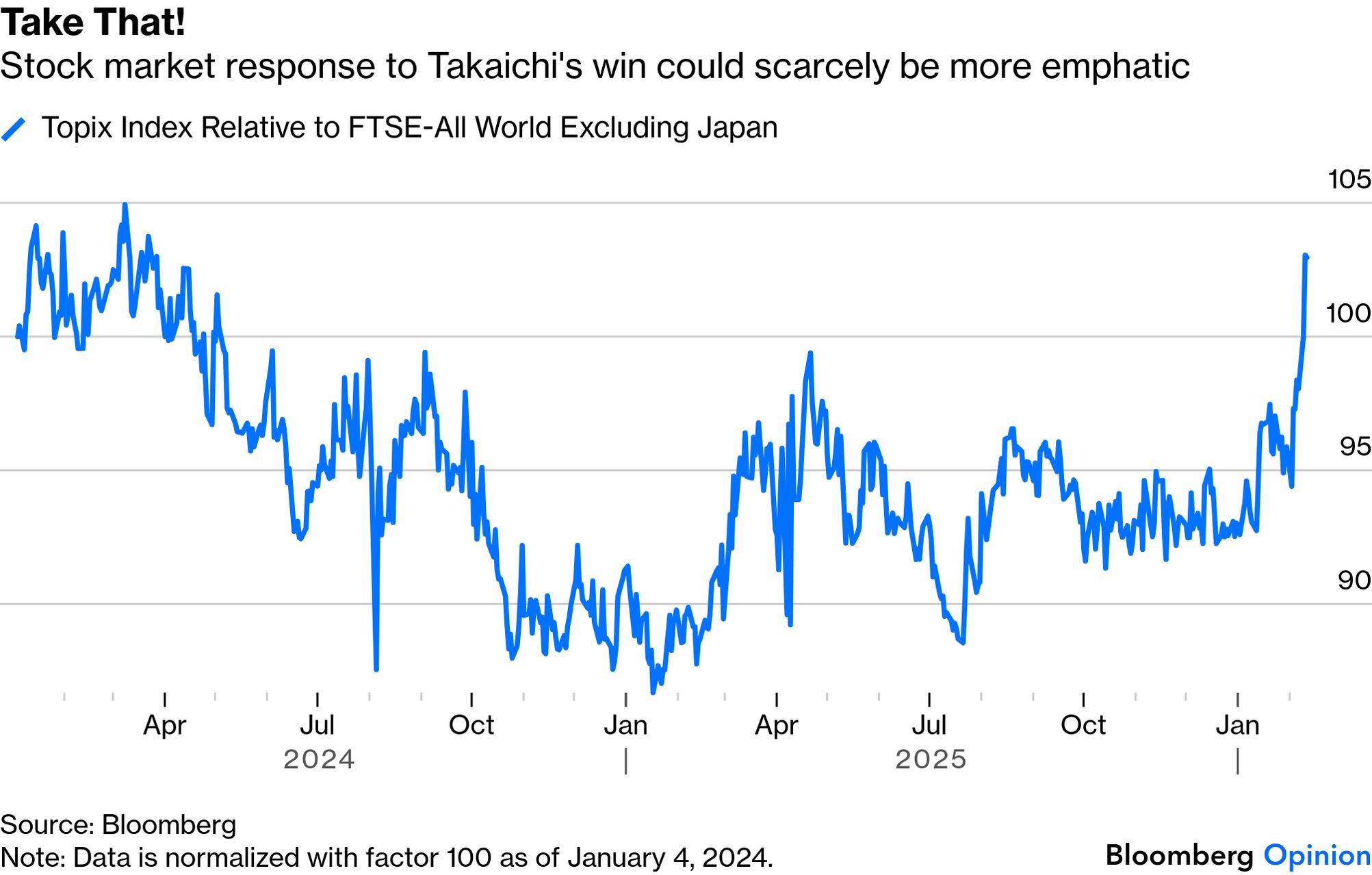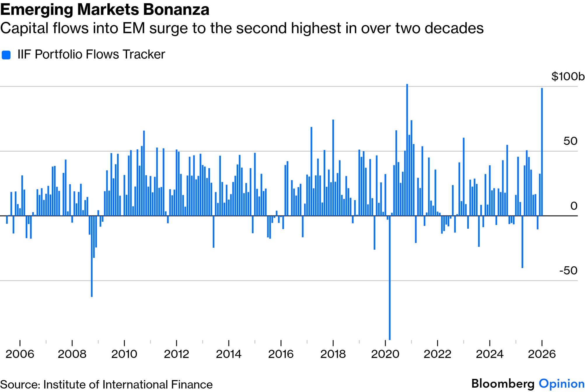 This helps explain the "K-shape" divergence between consumer sentiment and the stock market. Normally, they move together. Since the pandemic, the dispersion has been extraordinary, as demonstrated by this chart from Pictet Asset Management: It's hard to frame the biggest rise in employment in more than a year as anything other than good news. But many in the markets have managed to do it. Takaichi: So Far, So Great… | Markets are supposed to like gridlock, and dislike elections that give political leaders too much of a free hand. Except in Japan. Last month, Sanae Takaichi's campaign for prime minister prompted a sharp selloff in Japanese bonds, while the yen also fell — an ominous combination suggesting a lack of investor confidence. Then she won far more decisively than expected. The response has been a release of tension. The yen is back at ¥153, having dropped close to ¥160 last month, while 30-year yields are almost 40 basis points below their January high. What looked like a fast-unfolding crisis has been resolved, at least for now: That yen rebound has combined with a remarkable stock rally. Japan has now outpaced the rest of the world, even in dollar terms, since the start of 2024: None of this guarantees that Takaichi will fulfill all the hopes placed in her. And there are dangers in Japan's re-emergence, as demonstrated by the spasm that went through international markets the last time a yen appreciation drove an unwinding of the carry trade. So far, however, Bloomberg's index of the yen carry trades for the US dollar and the Mexican peso suggests that that effect is quite muted: By showing this degree of support, international investors are improving Takaichi's chances of success. But they are also raising the stakes for everyone should she fail to deliver. It's no accident that emerging markets have stirred back to life just as faith in US exceptionalism has wobbled. But the strength of their rally has exceeded almost all expectations, rivaling the strongest EM rebounds in history. In January, non-resident portfolio flows into EM assets, including equities and debt, climbed to nearly $100 billion. That's the second highest in the last two decades, topped only by one month post-Covid reopening in 2021, according to Institute of International Finance data. A year ago, inflows were only $16.2 billion: Previous surges were driven by a particular asset class or region. This one reflects coordinated inflows across debt and equity, China and the rest of EM (now widely considered separate due to the political issues surrounding Chinese investment): What can explain this? IIF's Jonathan Fortun credits primary market activity. Sovereign issuance was unusually front-loaded in early January, as borrowers took advantage of tight spreads and strong investor demand. That didn't crowd out investment in other assets, but recycled interest, particularly in hard-currency debt. Such broad-based appetite suggests emerging markets may finally have turned a corner. Further, this hasn't just been at the US's expense. Framing it that way would miss the idiosyncrasies of these diverse economies. Corporate USA still boasts fantastic fundamentals, and a range of dominant and innovative companies. Global X's Malcolm Dorson suggests that investors' renewed allocations into EM reflect a more nuanced calculation, as most were underweight: That doesn't mean you're necessarily dumping the US, but it probably means you're taking 3% to 5% out of the S&P 500 and putting it into emerging markets. You're still dramatically overweight the US, but taking some profits off the table. And because EM is coming from such a lower base, that capital is very meaningful and leads to market re-rating.