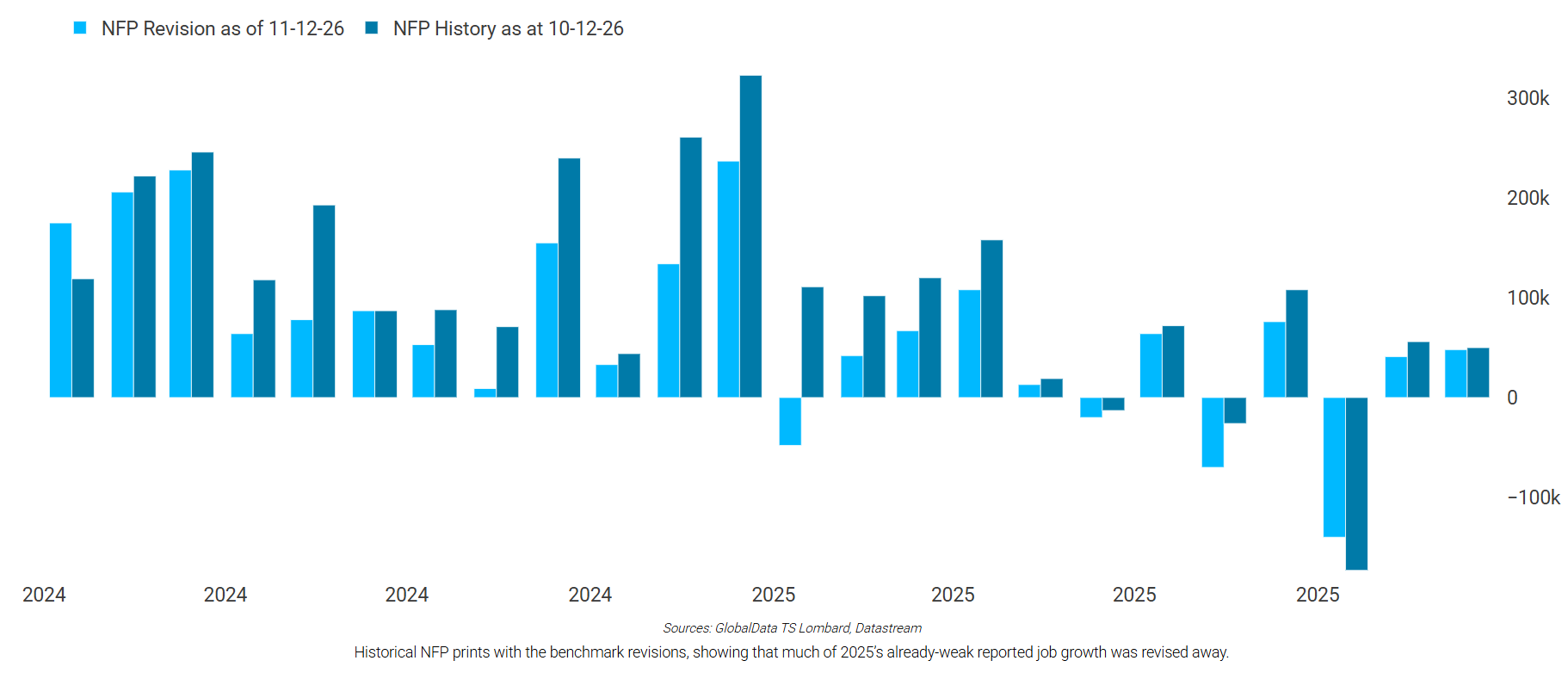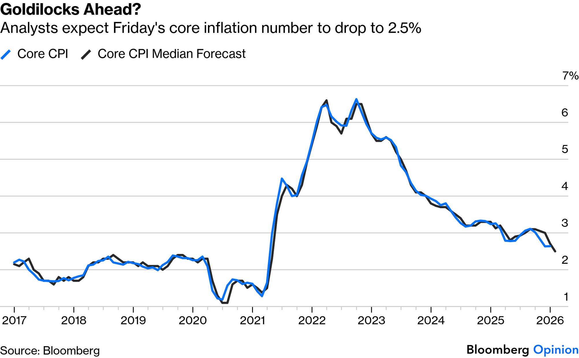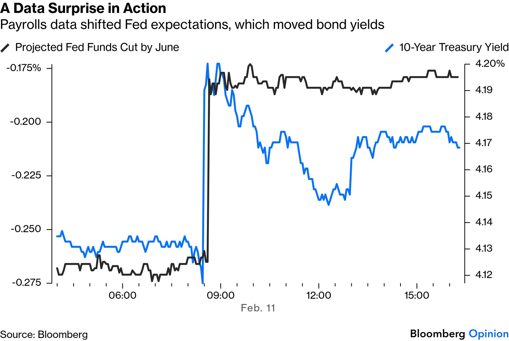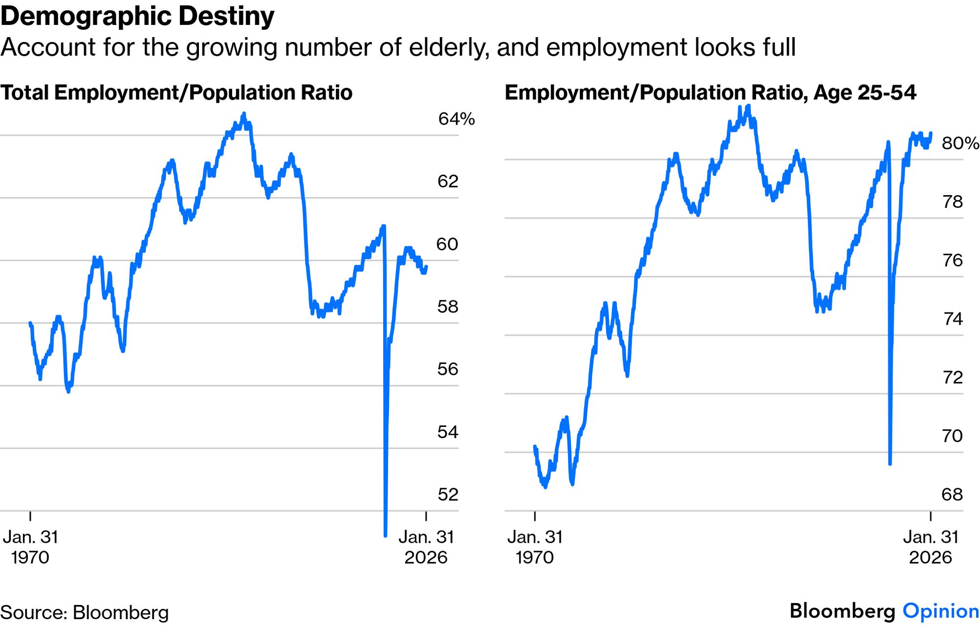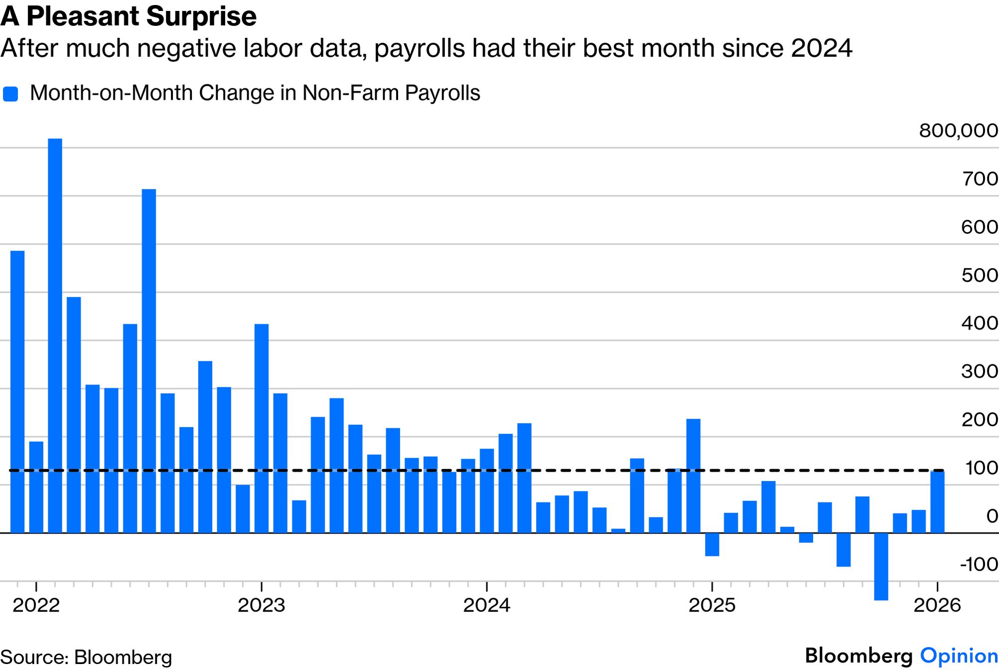 | Good economic news makes a pleasant change. Or does it? Wednesday dawned with traders braced for another decline in jobs growth. Instead, non-farm payrolls grew by 130,000 in January, better than any month of 2025, while the unemployment rate fell. That's evidently good news for the US workforce, and for those who've been arguing that the global economy is in something of a sweet spot: No news is ever unalloyedly positive, however. Strength like this in the jobs market makes further interest-rate cuts that much harder to justify. Futures pushed back the likely date of the next easing to July from June. That had a direct knock-on effect on bond yields, which rose sharply: Futures are still pricing in two cuts for the full year, but it's questionable whether that is a fair bet. The available workforce is smaller than it used to be, thanks to demographics. The ratio of those in employment to the entire population is unimpressive. But repeating that exercise for those in the prime working ages of 25 to 54 yields a very different outcome. For all practical purposes, the US appears to be close to full employment: All of this has to come with the caveat that payroll data is noisy and revision-prone at the best of times, and even more so after the shutdown forced government statisticians to down tools late last year. Freya Beamish of TS Lombard shows that much of 2025's already anaemic growth has been revised away: But she points out that the potential supply of workers has also been revised down, suggesting that the economy is still running close to capacity. The unwelcome corollary is the risk that any stimulus will be channeled into creating more inflation, still arguably the biggest political issue confronting the US. Projections in the swap market have risen a bit, but remain under control: The next big data release, taking the payroll's usual spot on Friday morning, will be January CPI. If the consensus of economists polled by Bloomberg has it right, core inflation will drop to a new post-pandemic low of 2.5%. In combination with the latest jobs numbers, that sounds almost like Goldilocks financial conditions — not too hot, not too cold — and would maintain the chance of rate cuts later this year: At the margin, however, the confidence in two cuts is beginning to look overdone, despite the president's clear expectation that Kevin Warsh, his nominee to take over the Federal Reserve chairmanship in May, will deliver at least this much easing. "The market is saying that Warsh will come in and cut twice," says Beamish. "That's certainly what he intends to do, but maybe the market won't be confident with him doing that later in the year." And there remains a more negative way to view the labor market. This is not a dynamic US economy and inequality is intensifying. Viktor Shvets of Macquarie Capital points to continuing low wage growth (with average hourly earnings now up 3.7% year-on-year), while gains flow mostly to those who already own assets: These factors are key to reconciling depressed surveys with strong output: People know they are falling behind, absolutely and relatively, and it is unlikely that middle-class jobs will ever come back. The immigration crackdown is making things worse, as immigrants are mostly complements not substitutes for local labor.