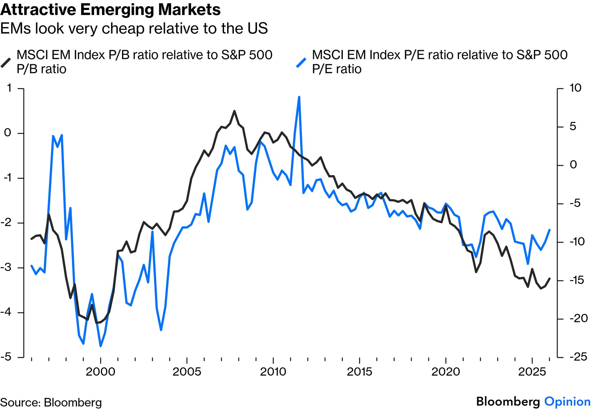 The weaker dollar enhances emerging markets' appeal, lifting carry-adjusted returns and supporting allocations to both local- and hard-currency debt. That helps explain the outperformance since the start of last year. This Global X chart illustrates the inverse relationship: Additionally, emerging markets valuations are relatively cheaper than the US. Historically, that wouldn't be enough to spark sustained outperformance. But combined with cyclical tailwinds, a weaker dollar, and growing scrutiny of US exceptionalism, the case for investors seeking diversification looks more compelling: That said, in absolute terms, the developing world is no longer convincingly cheap. Compared to book values, EM shares have only previously been more expensive during the 2007 rally that culminated in the Global Financial Crisis: Can this exceptional performance continue? It might just happen. Many emerging economies are well into easing cycles, and are benefiting from the trickledown effects of US Big Tech group's immense capital expenditures. That has driven an increase in earnings optimism. Pictet's Luca Paolini argues that faster earnings growth should make for a persuasive investment opportunity: As the AI rally broadens, Paolini identifies EM technology and communication services in markets such as Korea, Taiwan and China as best placed to profit from strong demand for hardware and semiconductors. None of this comes without risks. A bigger correction or bear market in the developed world would be a problem, and Paolini points to stretched US valuations. Renewed inflationary pressure could also strengthen the dollar and stall the momentum. For now, though, the strong earnings outlook and ample liquidity should allow the rally to carry on a bit longer. -- Richard Abbey |