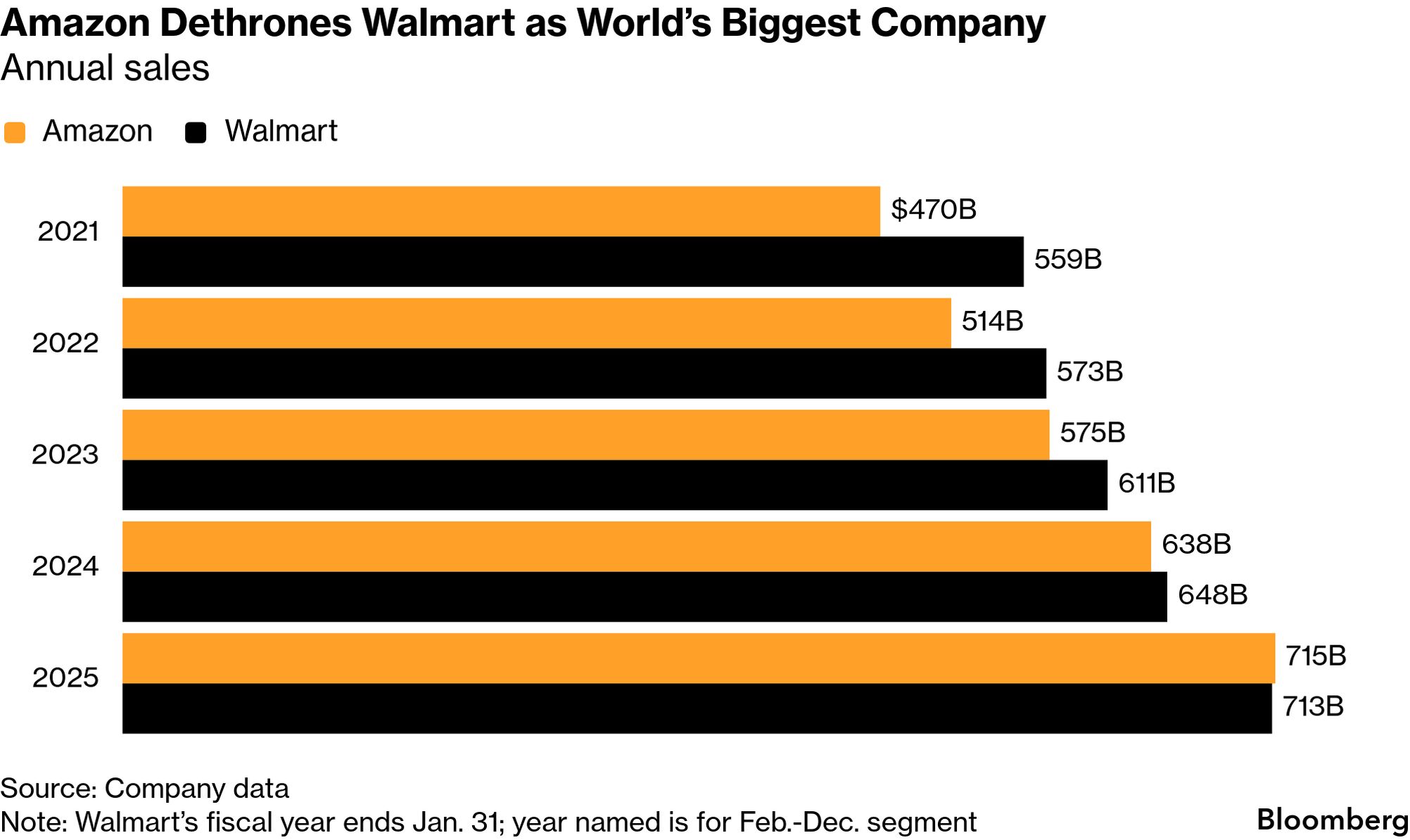 | The world's largest company measured by revenue is now Amazon. Spencer Soper covers the company and writes about why this milestone passed quietly on Wall Street. Plus: Five Below is where kids want to spend their allowances. If this email was forwarded to you, click here to sign up. Amazon.com Inc. shocked investors this month when it announced plans to spend $200 billion in 2026 on data centers, chips and similar indulgences, intensifying fears that the tech industry's investments in artificial intelligence infrastructure are so colossal, they may never be fully recouped. The pledge followed other big-spending commitments from Alphabet, Meta Platforms and Microsoft. Wall Street's obsession with AI appears to have buried the lead, though. While analysts and investors were poring over the details of the company's tech strategies and what they might mean for the broader AI market, many seem to have missed an important detail: Amazon has dethroned Walmart Inc. as the world's biggest company by revenue. The retailing giant this morning reported sales of $713 billion for the fiscal year that ended Jan. 31, below Amazon's $717 billion in sales for calendar year 2025. Leading the world's companies in sales is seen more as a measure of global scale and consumer reach than overall value and profitability, but it's still worth some bragging rights. Walmart had been on that perch for more than a decade, joining a rarefied club that includes the likes of Exxon Mobil Corp. and General Motors Co. Amazon's ascendance is only partly attributable to its strength in retail and shouldn't be viewed as an imminent threat to Walmart's grip on the US consumer. Instead, the shift highlights the importance of cloud computing in the modern economy. Amazon is the world's biggest data center owner, a business that's growing faster than the web store most people know. Its revenue without cloud computing was $588 billion—huge by any yardstick, but more than $100 billion shy of Walmart's overall sales. And the IRL behemoth's annual e-commerce sales in the US are expected to grow nearly three times as quickly as Amazon's this year, indicating it's gaining market share, according to EMarketer Inc. The retail fight between Amazon and Walmart will likely play out for years to come, with Walmart refining its thousands of stores as mini e-commerce distribution hubs and Amazon pushing deeper into rural America for more sales, where the competition from Walmart will be toughest. But Wall Street is barely paying attention to that fight. On recent Amazon earnings calls, analysts have narrowly focused on what the company is spending on its data centers and how fast its cloud-computing revenue is growing. If the cost of the expansion outpaces sales growth, investors get skittish. It's a familiar pattern for veteran Amazon observers. The company's push into a national warehouse network, which played out largely from 2007 to 2015, was fraught with tension between founder Jeff Bezos and shareholders, who accused him of operating a "nonprofit." Bezos reinvested in the company's growth at the expense of profit margins, and it took years for him to get investors fully on board. Today, Bezos' successor as CEO, Andy Jassy, finds himself in a similar tussle, but this time it's about data centers rather than warehouses. And just like Bezos, Wall Street is more focused on how much he's spending than on how much he's bringing in. That's as good an explanation as any as to why Amazon seizing the revenue crown from Walmart has generated such scant interest among investors. Previously in Businessweek: Walmart Wants to Be Something for Everyone in a Divided America |