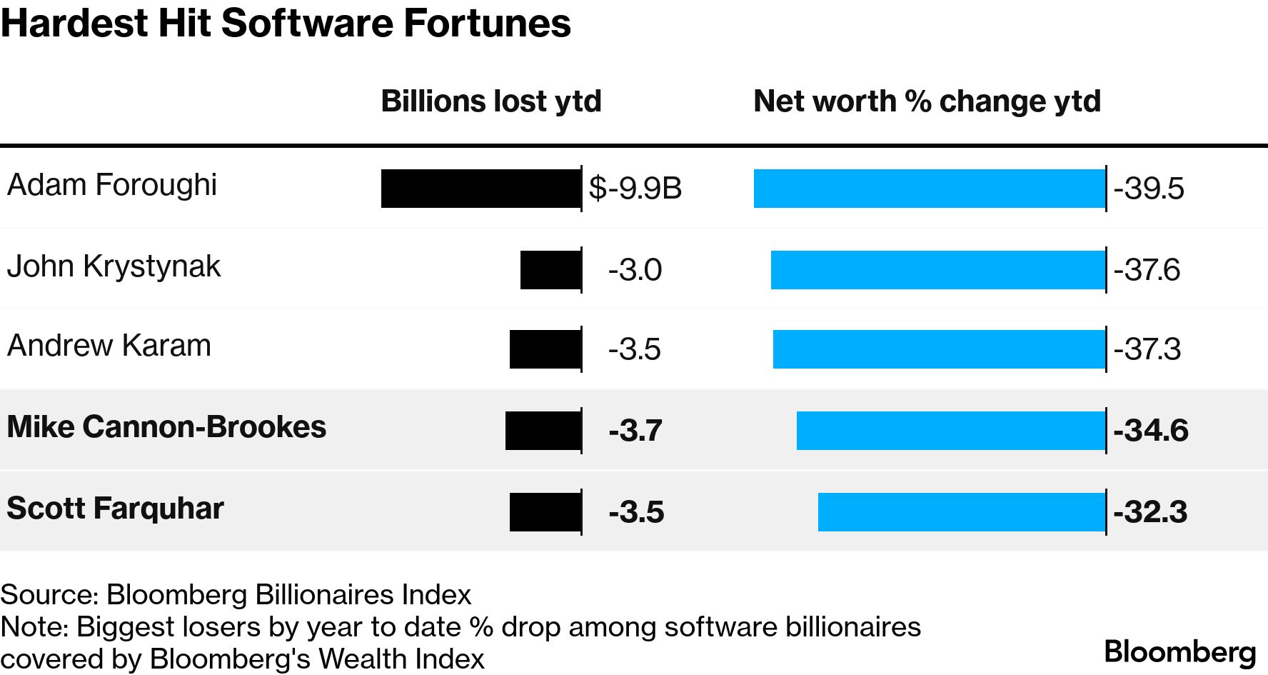 ![]() Spare a thought for two of our young tech billionaires. As the global tech rout hits our shores, Atlassian's Mike Cannon-Brookes and Scott Farquhar have lost a third of their wealth this year, or about a combined $7.2 billion. That makes them some of the entrepreneurs hardest hit by the selloff, caused by fears of AI's impact on software. Elsewhere, the RBA's looking justified in its decision to raise interest rates after unemployment came in lower than expected on Thursday, hinting at a stronger economy that could keep inflation higher for longer. And that inflation pressure is coming through in earnings, with Wesfarmers CEO Rob Scott telling Bloomberg TV that people were spending less as cost-of-living concerns grow. — Ben Westcott, Asia Agriculture Reporter What's happening nowCannon-Brookes became one of Australia's richest tech executives with Atlassian's initial public offering just over a decade ago. Now, along with co-founder Farquhar, he's at the sharp end of a global rout in stocks that are seen as threatened by artificial intelligence. Both have been nudged out of the Bloomberg Billionaires Index of the world's 500 richest people. ![]() Rio Tinto reported a doubling of copper profits last year after expanding its flagship mine and as prices surged, as part of its full-year profits on Wednesday. However improvements in copper and aluminum failed to offset a combination of one-time restructuring costs, US tariffs and China's drag on its key iron ore unit. In other earnings results, Wesfarmers shares dropped the most since October after the first-half performance of its key retail units fell short of analyst expectations. Meanwhile, Australian payment company Zip saw dropped the most in more than a decade after forecasting flat cash earnings growth in the second half of the financial year. ![]() Rob Scott, chief executive officer of Wesfarmers Ltd. Photographer: Philip Gostelow/Bloomberg Australian unemployment stayed low in January and hiring remained strong, validating the RBA's view that the economy can withstand tighter monetary policy without a sharp rise in layoffs. Across the Tasman, New Zealand's central bank is in the unusual position this year of expecting a strong economic recovery without triggering inflation pressures, Assistant Governor Karen Silk said in an interview. Sydney is one of the least dense major cities in the developed world. The government is trying to change that but in the affluent suburb of Woollahra, residents are pushing back against a plan to revive a long-abandoned incomplete train station and build 10,000 new homes nearby. Bloomberg's Swati Pandey and Aradhana Aravindan join the podcast to unpack what's at stake — from property prices and lifestyle trade-offs to productivity, inflation and the Reserve Bank. Listen and follow The Bloomberg Australia Podcast on Apple, Spotify, on YouTube, or wherever you get your podcasts. ![]() What happened overnightHere's what my colleague, market strategist Mike "Willo" Wilson says happened while we were sleeping… Oil settled at its highest level since August on concerns that the US and Iran are inching closer to a fresh conflict as the former continues its military build up in the region. The sour backdrop hit stocks while gold held near $5,000. The dollar edged higher on strong jobless claims data while Aussie and kiwi held gains made in Asia. Treasuries rose as haven demand outweighed oil-fueled inflation concerns. Australia has some activity gauges due and RBNZ Governor Anna Breman is scheduled to speak. ASX futures speak to a soft opening for local equities. Andrew Mountbatten-Windsor, the brother of the UK's King Charles, was released under investigation on Thursday after being arrested on suspicion of misconduct in public office. The king issued a statement outlining his "deepest concern" about the matter and promising Buckingham Palace's "full and wholehearted support and co-operation." ![]() Andrew Mountbatten-Windsor Photographer: Jordan Pettitt/Pool/Getty Images Former South Korean President Yoon Suk Yeol faces life in prison after being found guilty of leading an insurrection with his 2024 martial law declaration, a move that shocked the nation and triggered the country's most severe political crisis in decades. The US military is stationing a vast array of forces in the Middle East, including two aircraft carriers, fighter jets and refueling tankers, with President Donald Trump saying that Iran had 10 to 15 days at most to strike a deal over its nuclear program. Since the dawn of retail, merchants' primary job has been to tempt human shoppers to part with their cash. Now they have a new customer to woo: the bots, writes Bloomberg Opinion's Andrea Felsted. What to watchAll times Sydney: One more thing...Do you have a young person (or slightly older person) who won't stop belting out Golden at the top of their lungs? Are they waiting with bated breath for more of their favorite, Kpop Demon Hunters? Well, they might have to be patient. Fans of the Netflix animated film which has taken the world by storm are in for "a long wait" for the sequel, creator Maggie Kang said in an interview with Bloomberg. ![]() KPop Demon Hunters