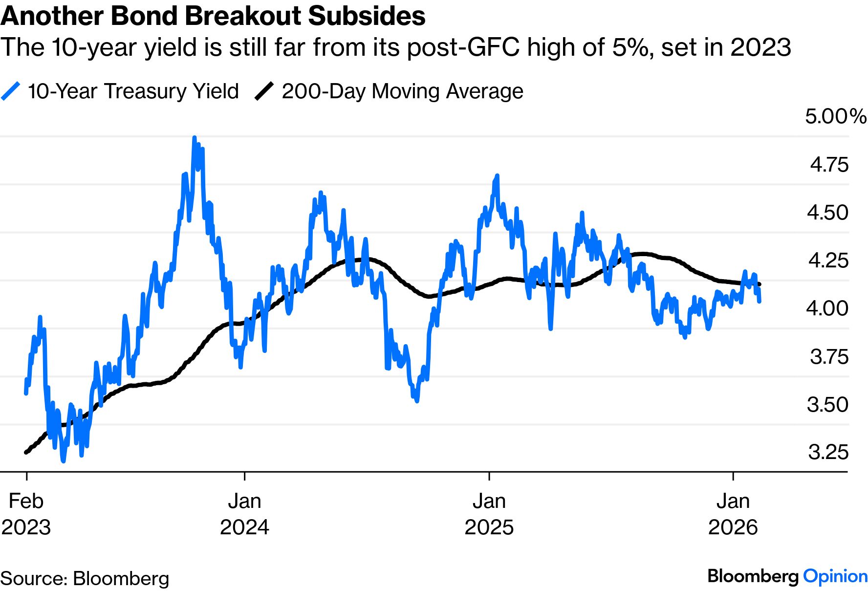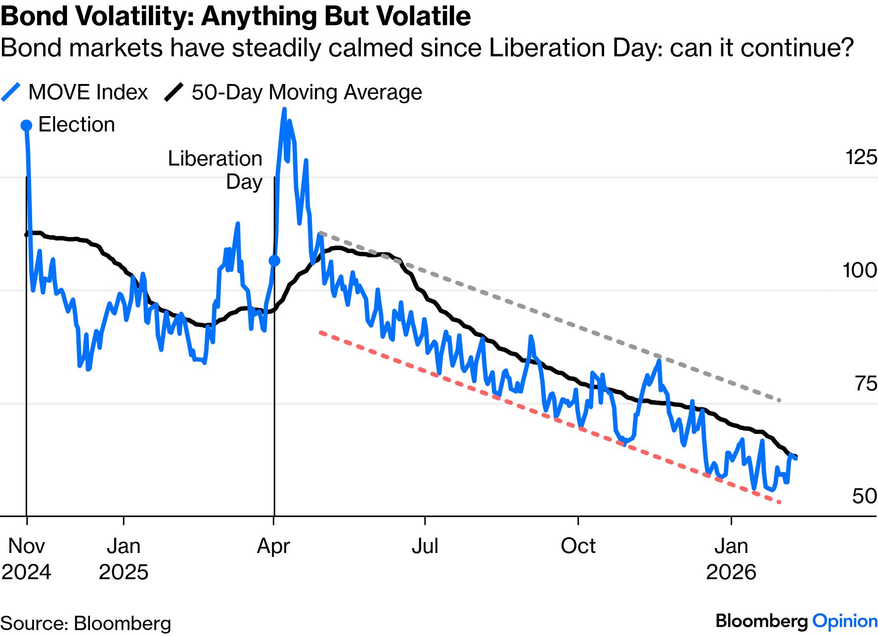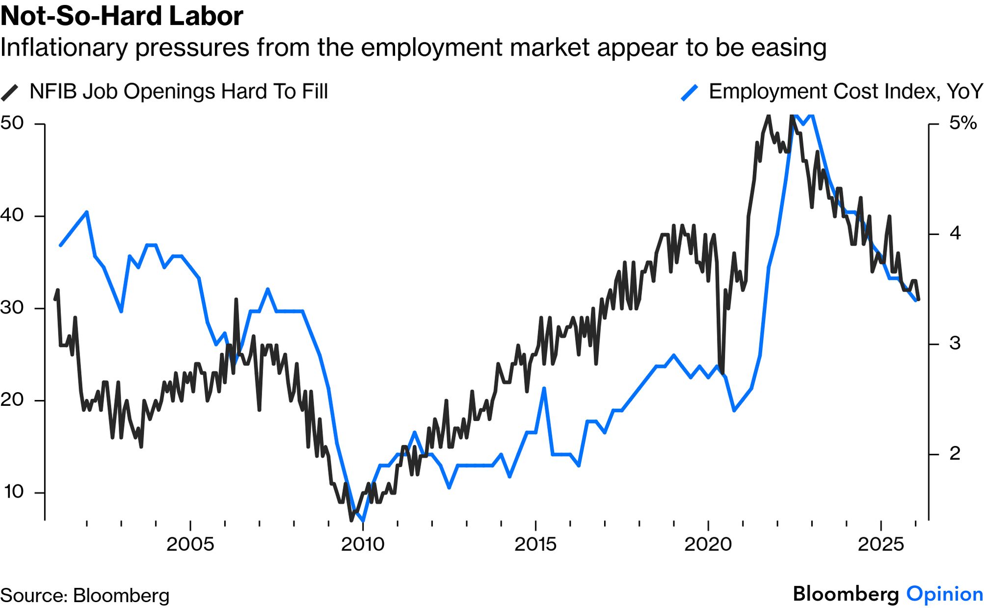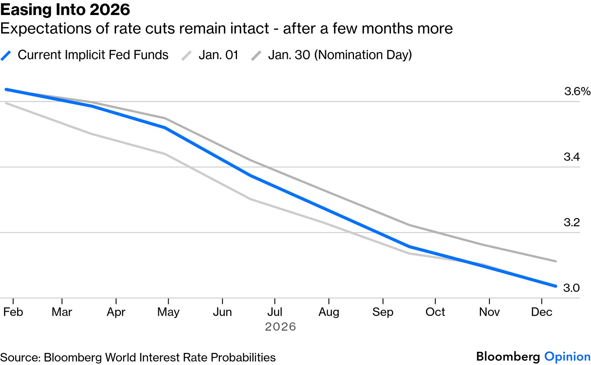 Meanwhile, the weak dollar also had an impact. John Butters of FactSet points out that S&P 500 exporters that gain most of their revenue outside the US are reporting higher earnings and revenue growth: Butters explains that this is largely because of Nvidia Corp., which reports later this month. It's the single largest contributor to both earnings and revenue growth among S&P 500 firms with predominantly international exposure. Strip it out, and blended earnings growth would fall to 12.0% from 17.7%, while revenue growth would slow to 9.9% from 11.9%. Capital Economics' Thomas Mathews argues that the rally depends "quite heavily on the business models of a small handful of companies." In these circumstances, idiosyncratic developments at one or more of them, or "perceived missteps in the AI race," could drag on the whole market. But greater dispersion among the mega-caps in the last few months hasn't taken the overall market far down from all-time highs. And the rotation is driven less by problems for the behemoths than by the cyclical factors that have improved earnings for everyone else. -- Richard Abbey An extremely unusual Non-Farm Payrolls Wednesday is in prospect, after the brief shutdown forced the postponement of last Friday's unemployment data. It appears that the heat is continuing to ebb (taking with it the justification for tighter money). The National Federation of Independent Business' monthly survey of small company managers found the proportion finding job openings hard to fill dropped to its lowest since the pandemic, while the quarterly employment cost index (which includes benefits and bonuses as well as salary) also continued to slow down: In combination with surprisingly low US retail sales for December, this contributed to a shift in expectations for the Federal Reserve under its next chairman. President Donald Trump's nominee Kevin Warsh is seen as less likely than some of his competitors would have been to pursue rate cuts at all costs. The Jan. 30 announcement saw the implicit fed funds rate for the rest of this year drift upward. That has now moved back — with data like this, traders expect the Warsh Fed will need to cut twice this year: This also helped a good day in the Treasury market, where worries that the economy could be overheating had been pushing yields up. There are still plenty of buyers for US government debt. The benchmark 10-year yield dropped six basis points on the economic news, bringing it back below its 200-day moving average. Its brief post-pandemic peak of 5% is now more than two years in the past: A key point in keeping liquidity flowing easily is the ongoing reduction in bond volatility. As measured by the MOVE index, it suggests a stunningly reliable decline ever since the shock surrounding the Liberation Day tariffs last April: This is a very strange state of affairs at a time when the market has dealt with a series of geopolitical shocks, and must also contend with fears of an investor revolt against fiscal over-stimulus. But as with equities, it may be driven by the economic cycle, which is currently at a point of expanding. Chris Watling of Longview Economics argued: "If you are in the middle of the economic cycle, why wouldn't you have low bond volatility?" He added that the MOVE index showed that fears of a fiscal crisis were not prevalent. But even if the economic and corporate profits cycles are in a healthy place, it doesn't necessarily follow that the financial liquidity cycle will continue to support them. This is the contention of Michael Howell of Global Liquidity Indexes, who suggests that Warsh's well-known intent to shrink the Fed's balance sheet could be a problem: Strong economies don't always have strong financial markets. History shows that strong economies can falter in weak markets when liquidity is withdrawn. While we question the wisdom and practicality of aggressively draining liquidity now, the direction is clear: The era of expanding US Fed liquidity injections is over.