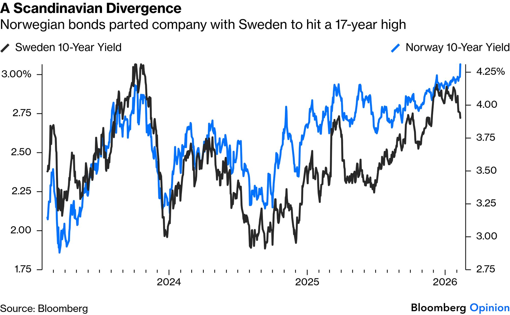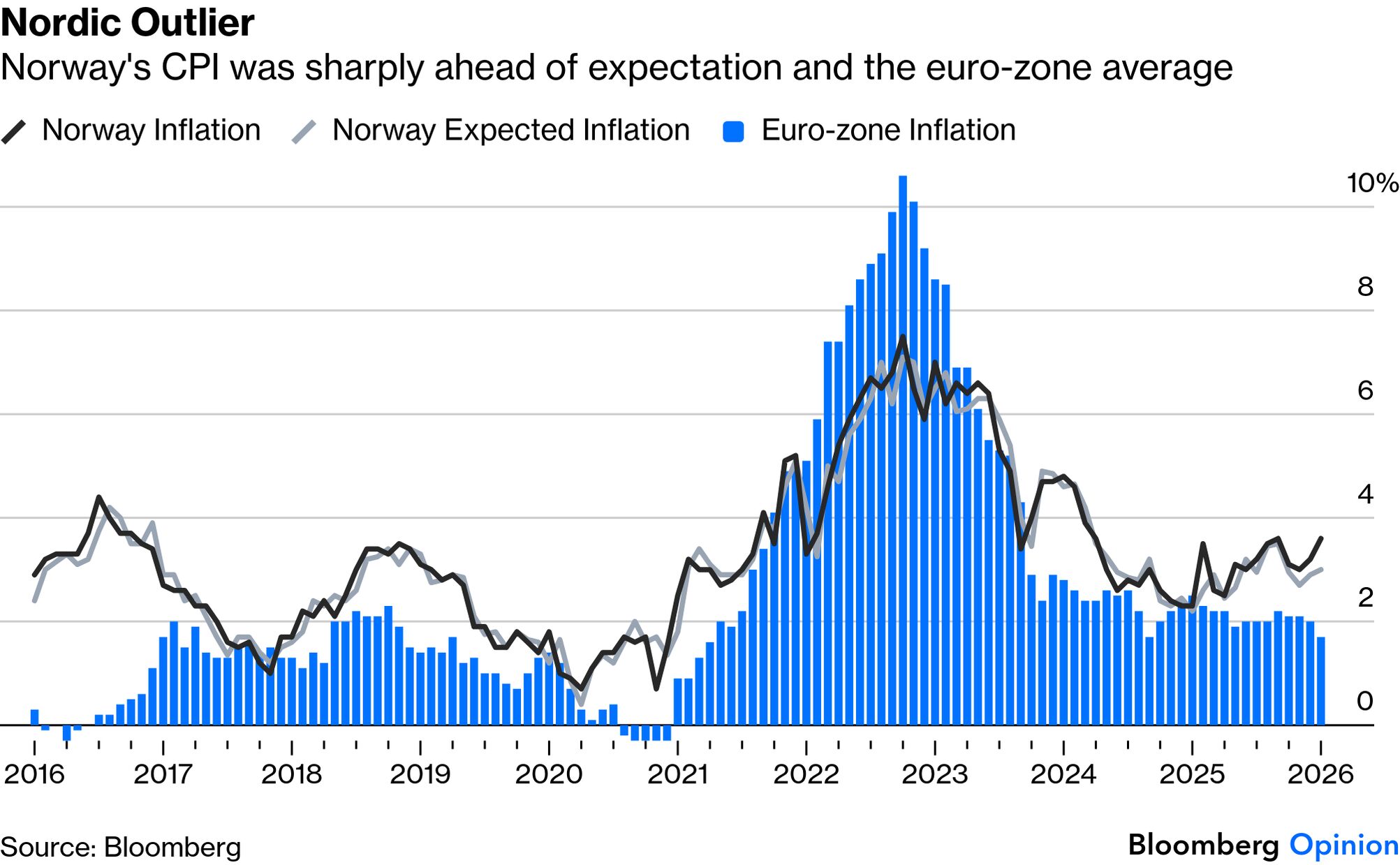 Howell argues that we are at "an inflection point, moving from a cycle phase dominated by monetary stimulus to one where liquidity is drying up." If he is right, then heightened volatility and a re-pricing of speculative assets will follow. "The free money that lifted all boats is being withdrawn. We appear to be at the early stages of a downswing. Watch the data closely." For now, however, we remain in the sweet spot. At least until we get the delayed unemployment numbers, shortly after you receive this. Norway is famous for its blue parrots (and its soccer commentators). Is it also offering a canary in the coalmine? The country's January inflation came in sharply ahead of expectation, and also far ahead of the rate of price rises in the rest of Europe: That prompted quite a market reaction, with Norwegian 10-year yields rising steeply to a level not reached since early 2009. Norway's bonds regularly trade at a higher yield than neighboring Sweden's, but the divergence between the two is now particularly stark: This has fed into speculation that the Norges Bank, like the Reserve Bank of Australia earlier this month, will be required to move against the trend for declining rates in the developed world and opt for a hike. Norway's is now expected to do so in March. In both cases, overnight index swaps show that expectations for rate cuts have whittled away steadily over the last few months: How alarming is this? Norway is a sufficiently unusual economy, with far greater reliance on energy than other European countries and a history of erratic inflation forecasts, that it needn't prefigure problems elsewhere. It undershot the euro zone's inflation during the worst of the post-pandemic price spike; it's not necessarily alarming that it's overshooting now. As yields fell across the euro zone Tuesday, that's how the market is interpreting it. But it's a reminder that different economies can diverge further as the global Covid shock disappears into the rear mirror. |