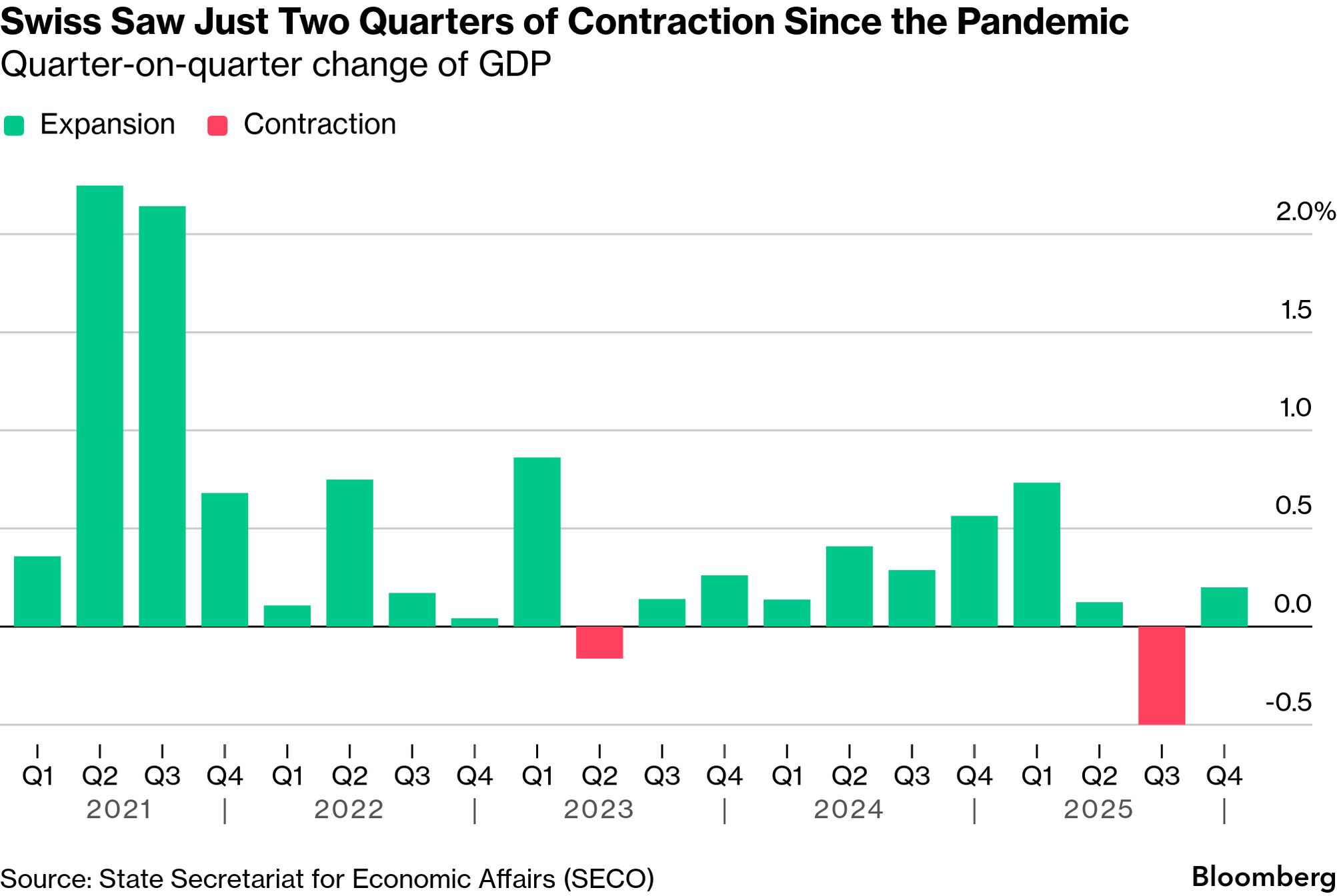 Seen and Heard on Bloomberg![]() Europe is in a better position after receiving the message from the US to take responsibility for its security, according to Alice Rufo, a deputy defense minister in France and close ally of President Emmanuel Macron. "We made a lot of progress in Europe, so we've been criticized but we delivered," she told Bloomberg TV on the sidelines of the Munich Security Conference. She also said that the government is ready to throw its weight behind the Franco-German fighter jet project known as FCAS, despite multiple reports highlighting Berlin's skepticism. Chart of the Day![]() Switzerland's economy rebounded at the end of last year, partially shaking off the impact of outsized tariffs inflicted by US President Donald Trump. GDP adjusted for large sport events rose 0.2% in the fourth quarter from the previous three months, when it dropped by 0.5%. The result is just below the 0.3% median prediction of economists in a Bloomberg survey. Coming up
