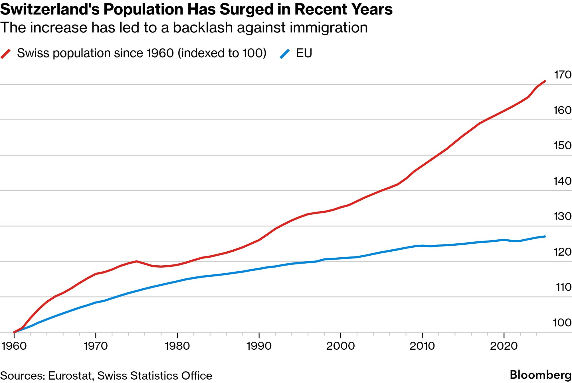 Seen and Heard on Bloomberg![]() Commerzbank AG Chief Executive Officer Bettina Orlopp said current European proposals for reducing the regulatory burden on banks don't go far enough, adding urgency to the debate about the bloc's declining competitiveness a day before leaders meet to discuss the topic. "We are clearly a strong supporter, not only to think about simplification, but also deregulation," Orlopp said Wednesday on Bloomberg TV. "We also clearly advocate to rethink that," given efforts in the US and the UK to roll back rules and capital levels. Chart of the Day![]() Switzerland will vote in June on whether to cap its population at 10 million after a proposal — backed by the right-wing People's Party, or SVP — gathered enough signatures under Switzerland's direct democracy system. Both the government and parliament are against the so-called "sustainability initiative" to cap the population, largely shutting out immigrants when the 10-million number is reached. Still, it has the support of about 48% of voters, according to a poll in December. Coming up