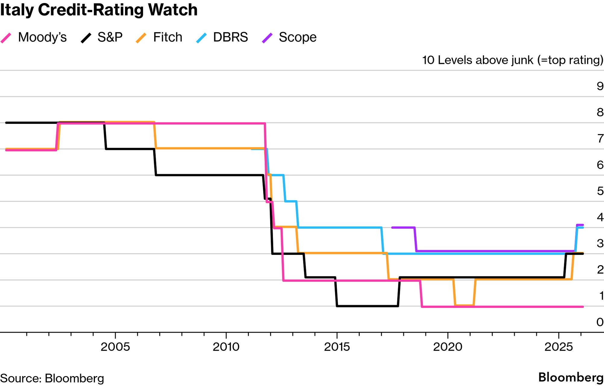 Seen and Heard on Bloomberg![]() Maxim Timchenko, CEO of DTEK, Ukraine's biggest private energy company, addressed the recent blackouts in Ukraine's biggest cities in an interview with Bloomberg TV. ''We are in a difficult situation, we are at survival mode now," he said, adding that he was grateful to US President Donald Trump for calling on Russian President Vladimir Putin to halt attacks on Kyiv and energy infrastructure for a few days to create favorable conditions for talks. Chart of the Day![]() Italy's credit rating outlook was raised to positive from stable by S&P Global Ratings last week, the latest victory for Prime Minister Giorgia Meloni, as the country "has demonstrated resilience in the face of trade and tariff uncertainty." The longest-serving premier since Silvio Berlusconi exited in 2011, Meloni has overseen an improvement in Italy's fiscal outlook. This has led to a slew of improved credit assessments, with November's move from Moody's Ratings — the first upgrade from that company in more than 23 years — probably the most significant. Coming up
