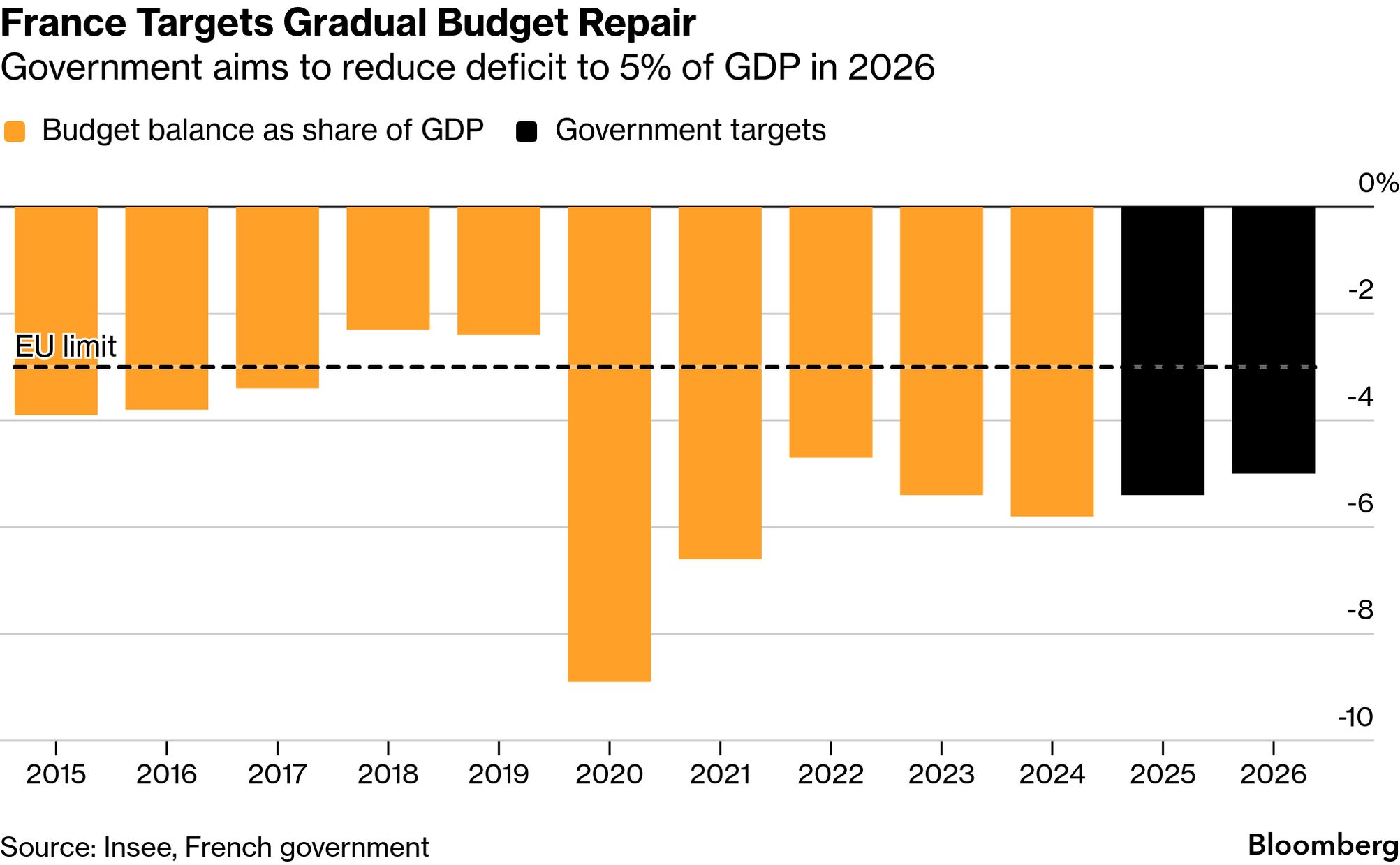 Seen and Heard on Bloomberg![]() Speaking to Bloomberg TV in his first interview in the role, Renault CEO François Provost said: "What I want to do during the next five years is really to deliver a very steady and robust performance in a difficult environment." The French automaker reported today that it expects profitability to decline this year as it rolls out lower-priced electric models and grapples with rising competition in Europe. Chart of the Day![]() France's strategy to reduce its budget deficit this year remains "very uncertain," even after the government set less ambitious targets, according to the country's audit court. The French parliament adopted a delayed fiscal plan this month that aims to trim the shortfall to 5% of economic output from an expected 5.4% in 2025. Coming up