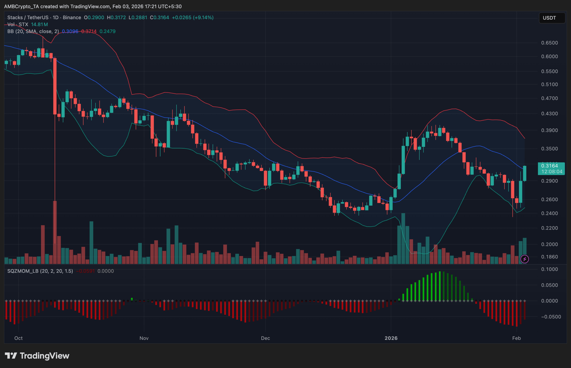 STX advanced toward $0.32 after breaking out of a multi-week compression range, with price nearing the upper Bollinger Band rather than decisively breaking beyond it. The Squeeze Momentum Indicator showed bearish pressure easing lately, while volume expanded sharply during the move, hinting at speculative participation alongside spot demand.