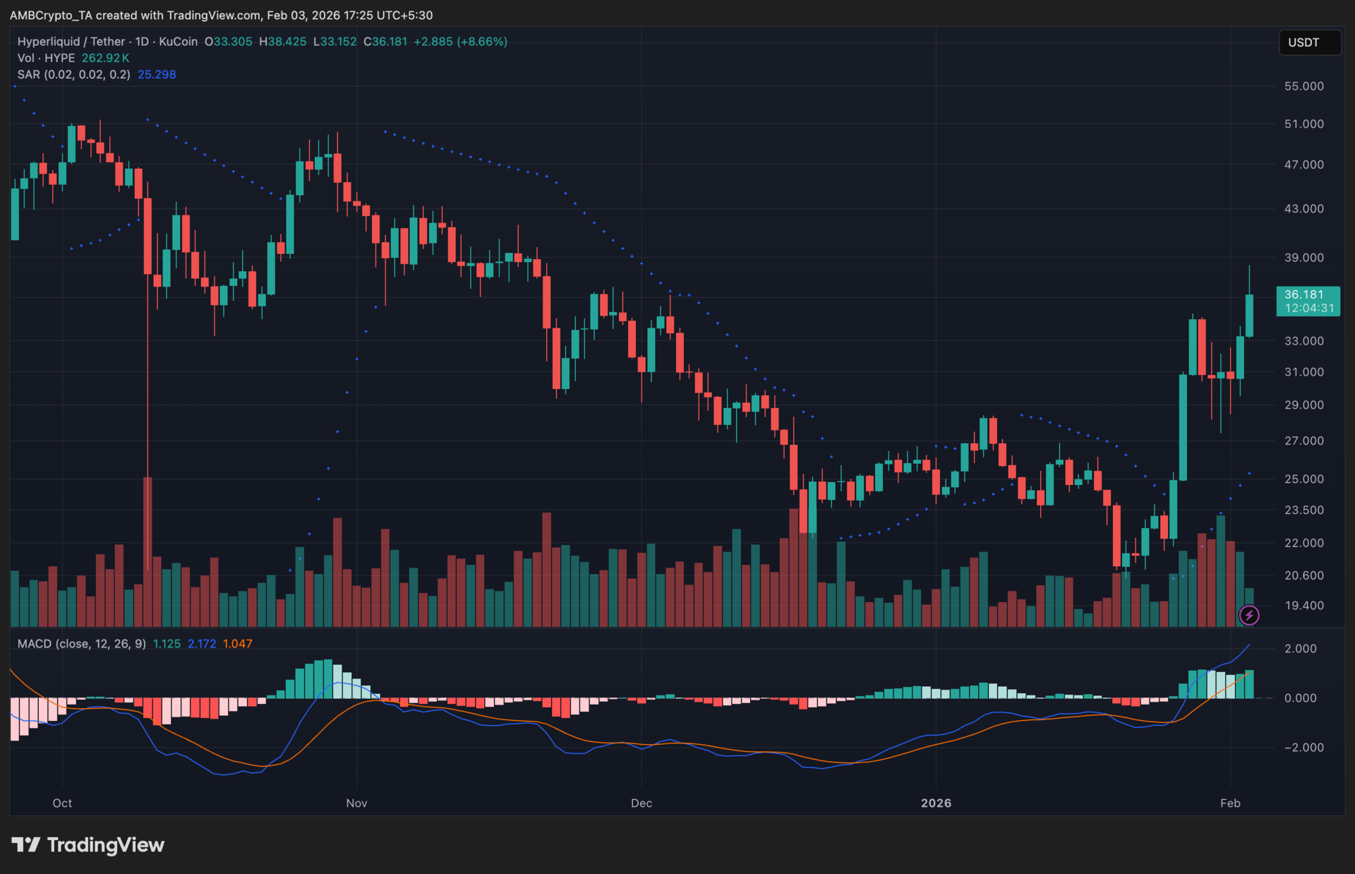 HYPE extended its rally toward $36 after reversing sharply from the $20 to $22 base, with price strength sustained rather than fading after the initial breakout. Parabolic SAR flipped below the candles and stayed there, while the MACD crossover strengthened alongside rising volume, reinforcing the shift in momentum.
