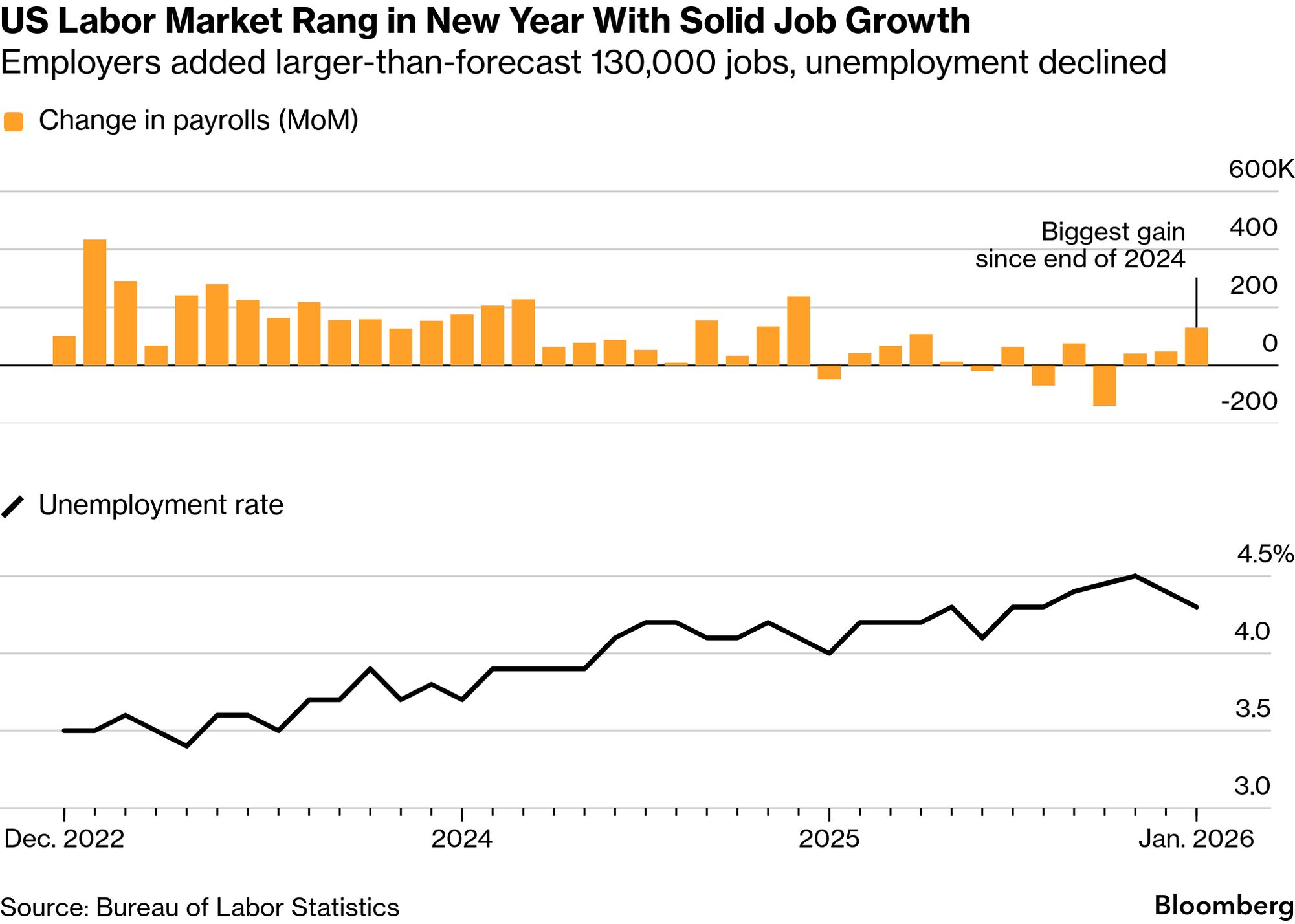 | This morning was unusual for data watchers, as the US reported its monthly jobs figures for January a few days late, after a partial government shutdown last week. Federal Reserve reporter Enda Curran writes about the ups and downs in the charts. Plus: Drug cartels are embracing crypto and freelance money launderers, and Americans have a growing appetite for fiber. If this email was forwarded to you, click here to sign up. The AI jobs apocalypse is on hold, at least for now. US companies hired at a surprisingly brisk pace in January, according to the Bureau of Labor Statistics, with the 130,000 jump in payrolls the most in more than a year. The unemployment rate unexpectedly fell, calming fears that employers are about to let workers go in favor of bots. While hiring continues to be dominated by sectors such as health care and education, there were green shoots in other areas as well. Manufacturing added 8,000 roles after months of shedding jobs. Brian Coulton, chief economist at Fitch Ratings, noted that in the past three months payroll gains averaged 73,000, which he described as a pretty healthy number. "This contrasts with some recent lurid headlines following other data points on job cuts and falling vacancies," he said. "The downside risks to the labor market the Fed was fretting about late last year have not evaporated, but they definitely look to be receding." President Donald Trump was quick to agree. In a social media post after the data was released, Trump hailed the "GREAT JOBS NUMBERS" and said the US should be paying the lowest interest rates globally. What Trump didn't say is that the jobs data represents good news on the economy but bad news on rates, given there will be less pressure for the Federal Reserve to ease borrowing costs if people are holding on to their jobs. The Fed in January held interest rates steady, partly because it thought the labor market was stabilizing—a call that now looks good. Still, there was plenty of caution from economists about reading too much into one month's print. Revisions to last year's data showed a marked slowdown in hiring. Job gains averaged just 15,000 a month last year, down from the 49,000 pace that was initially reported. A separate revision showed that almost 900,000 fewer jobs were added from March 2024 to March 2025 than initially reported. That means last year saw the weakest increase in US payrolls outside of a recession since 2003, when the job market was still recovering from the dot-com bust. For the moment, the picture looks slightly more upbeat, said Seema Shah, chief global strategist at Principal Asset Management. "Against a backdrop of powerful structural forces that are suppressing headline job creation—retirements, shifting immigration dynamics and AI-driven productivity gains—the payrolls figure points to a labor market that remains firmly intact," she said. Related: CBO Boosts US Deficit Call by $1.4 Trillion on Trump Policies |