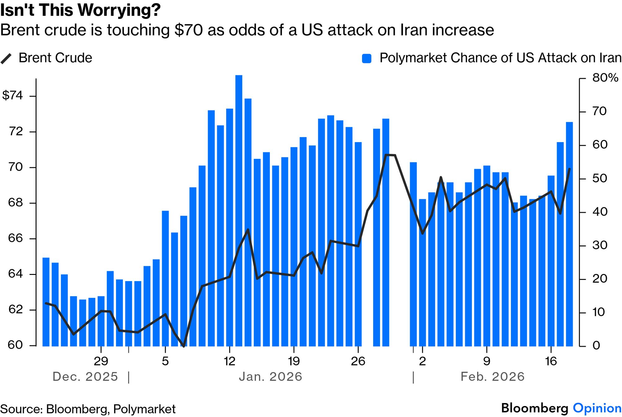 | This is a crammed news schedule. Often it's best not to try to react to every twist and turn of an emerging story, particularly if it concerns an extreme but low-probability risk. That said, there continues to be something very strange about the ongoing calm with which the world is treating the situation in Iran. According to a Bloomberg News Trends count of all stories from all sources on the terminal, the number mentioning the country is elevated at present, but far below the high last summer when the US attacked nuclear facilities with a bunker-buster bomb. It's also down significantly from the peak of the street protests earlier this year: This grows harder to explain when the sheer grimness of the latest Iran news is taken into account. President Donald Trump says the US is "ready, willing, and able to rapidly fulfill its mission, with speed and violence, if necessary." In response, Iran says it will "defend itself and respond like never before." These are just words, but the Iranian government plainly does have its back against the wall and may be getting desperate, while the US military buildup in the region is immense. Prediction market bettors now put the odds of a US attack at around 70%, while crude oil prices are rising. Brent surged 4.3% on Wednesday to top $70 once more: US Vice President JD Vance said of this week's latest round of talks on Iran's nuclear program: "In some ways it went well." But he added that Iranian representatives were still unwilling to acknowledge red lines that had been set for them, and so the possibility of conflict in a matter of weeks remains very much open. In anything like normal times, the US-Iranian saga would have dominated the news bulletins since the turn of the year, and markets would turn on it. The country's ability to administer a major oil supply shock, and its willingness to do so if attacked, are not in doubt — even if the long-term consequences of a new regime might well be very positive. As it is, the situation is only having a clear effect on oil (where supply is plentiful and prices start from a low base) and among prediction market bettors. In some ways, it's positive that broader markets feel able to ignore Middle Eastern brinkmanship. But this does intensify the risk of a major financial accident if worse comes to worst on the ground. Reality Check or Hallucinations? | If there's one question that has put US stocks through a bizarre start to 2026, it's this: "Who wins and who loses from AI?" The possibilities of artificial intelligence have driven markets since ChatGPT launched on the scene in November 2022, but careful consideration of whether the immense sums being spent will ever pay off, and who will lose out if they do, has only come recently. This chart shows the performance of Goldman Sachs' "AI At Risk" index of companies it fears stands to lose, and that of the Korean KOSPI, starting on ChatGPT's launch date: Not all those committing billions to AI infrastructure will reap returns. That holds true even for the Magnificent Seven, until now treated as inevitable AI winners. Now, as Barclays' Alex Altmann points out, they have derated back to much the same multiple as the rest of the market, thanks to concerns about their huge expenditures and the continuing opacity of their hopes to make a return on the investment. The needle may have moved too far: The near-term path of the hyperscalers and the AI narrative attached to them is the most-debated topic by investors at present given they are still delivering best-in-class earnings growth and now the least crowded versus the market in over 15 years.