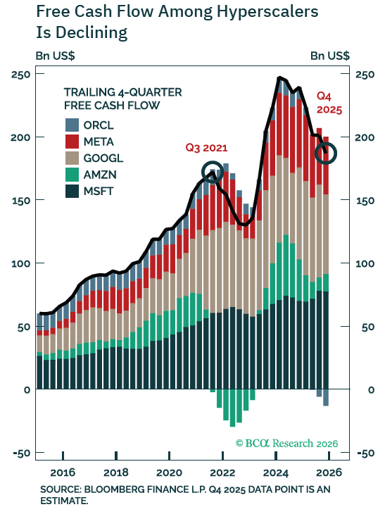 Spending such large sums carries risks, evidently. The hyperscalers have long been "capital-light," an advantage over old-line industrial companies; that is no longer the case. Also, as this chart from BCA Research shows, a direct consequence is to leave them with less free cash flow. BCA Research's Peter Berezin points out that free cash flow still exceeds capex for most of the hyperscalers, so they don't have to rely on external financing. But it understandably stirs a a perception of overinvestment, as noted by the majority of money managers in the most recent Bank of America fund managers survey. These concerns may miss a crucial point — that this capex is necessary because current infrastructure is inadequate to carry all the hoped-for advances. A recent Bloomberg Intelligence report found that only 35% of global cloud computing infrastructure is optimized for AI workloads. That suggests hyperscalers' increasing capex is justified if they want to be able to turn a profit: BI projects that the shift from central processing units (CPUs) to graphics processing units (GPUs) could help expand the market for advanced chips to about $600 billion by 2033, from $116 billion in 2024. Other estimates suggest this is conservative. Deloitte projects that AI chip sales will top $1 trillion by 2030: Predictions like this explain why hyperscalers don't want to take their foot off the gas. But still, Meta Platforms' recent earnings underscore a key reality — investors are more willing to tolerate costly buildouts when companies can prove that earlier spending is already feeding through to profits. How do companies that still need to make substantial investment avoid investors' wrath? Berezin argues they may ultimately scale back their spending to appease shareholders. That would bring the AI capex narrative close to breaking point — but such a pragmatic response wouldn't deal with the fundamental problem that the current computing infrastructure is inherently constrained. Alpine Macro's Noah Ramos cites recent earnings from Microsoft and Amazon to show that tech groups should stay the course. Both demonstrated that they badly needed the extra capacity the capex would buy for them. Microsoft said that over 40% of its cloud business was going to OpenAI, which the market hated due to concentration risk, while Amazon's cloud business has a backlog, forcing it to turn away business: For a hyperscaler to not build out the infrastructure, they're deferring revenue further and won't be able to capture it. The risk of not building out in the short term due to having a market pullback does not outweigh the long run.