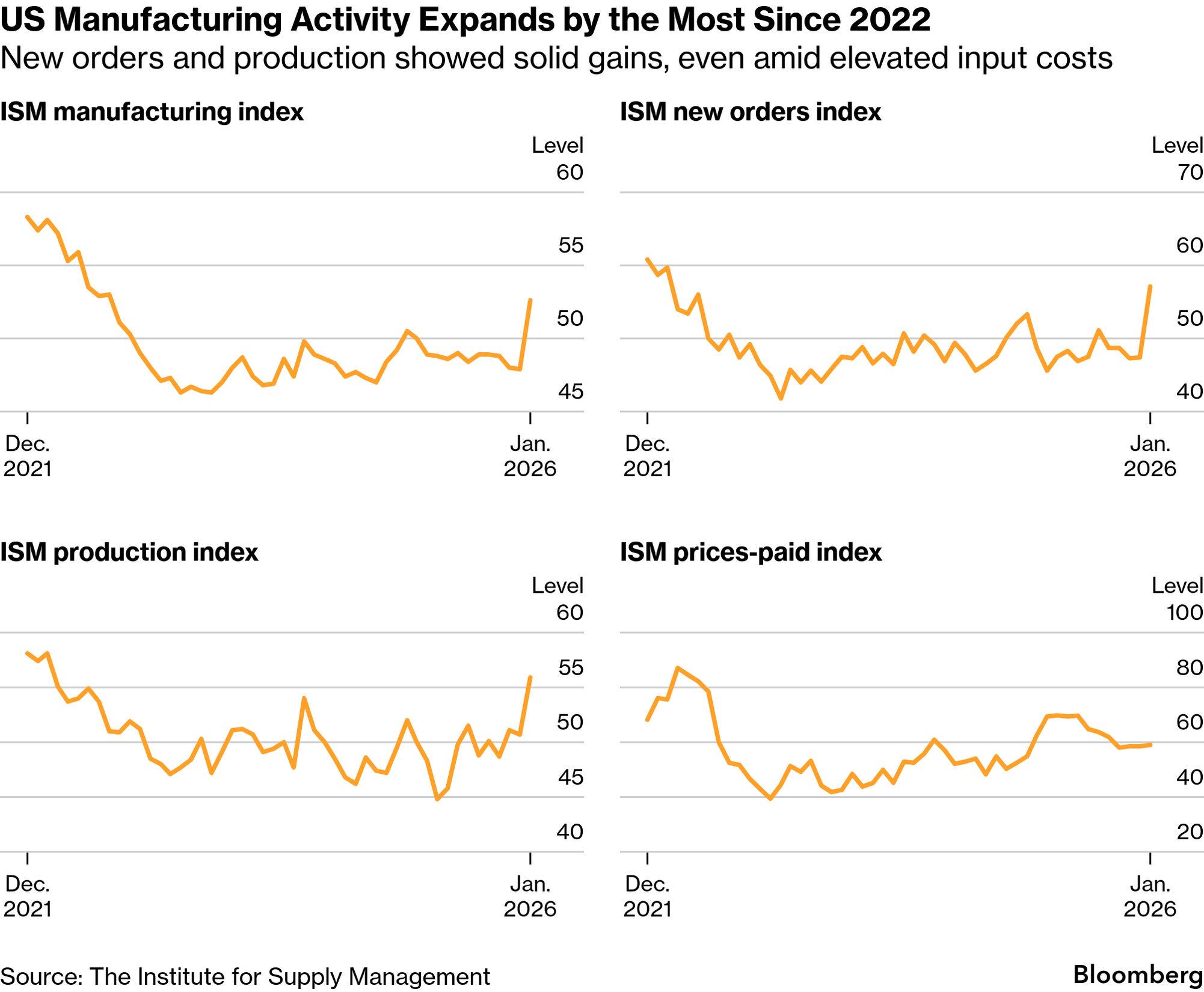 | US manufacturing activity unexpectedly expanded in January at the fastest pace since 2022, according to the Institute for Supply Management, a non-governmental supply management association. The groups's manufacturing index rose to 52.6 from 47.9, according to data released Monday. Readings greater than 50 indicate expansion, and the latest figure topped all projections in a Bloomberg survey of economists. The strength in demand reflected in part a decline in a measure of customer inventories, which contracted by the most since mid-2022. Lean customer stockpiles have the potential of providing more of a tailwind for factory orders and production in the coming months. | |