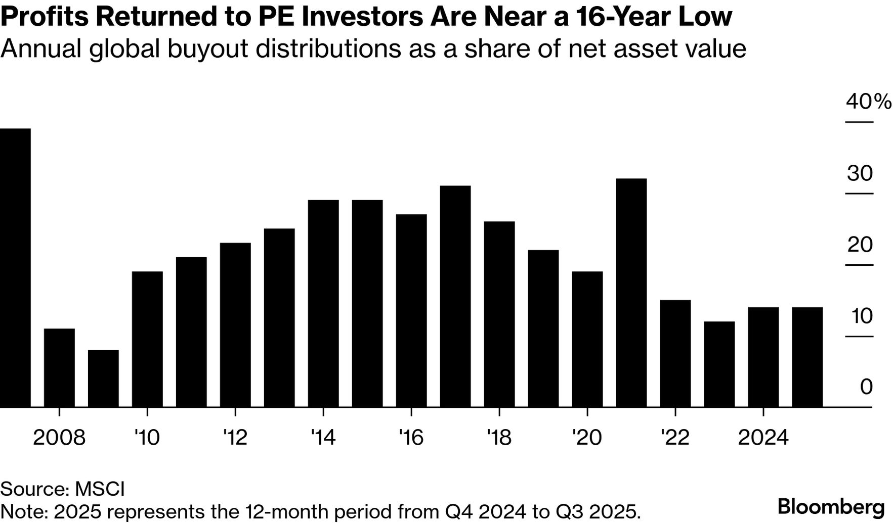 | Four lean years. Well, relatively—we are talking about private equity. But still, the sector has managed to return even fewer profits to investors for a fourth straight year as it sat on $3.8 trillion of unsold assets while struggling to raise money for new funds. Distributions as a percentage of net asset value remained at 14% last year—the second-lowest level since the depths of the 2008 financial crisis, according to a new report from Bain & Co. And the duration of the rut is even more severe than what private equity firms faced back then. So what's going on? | |