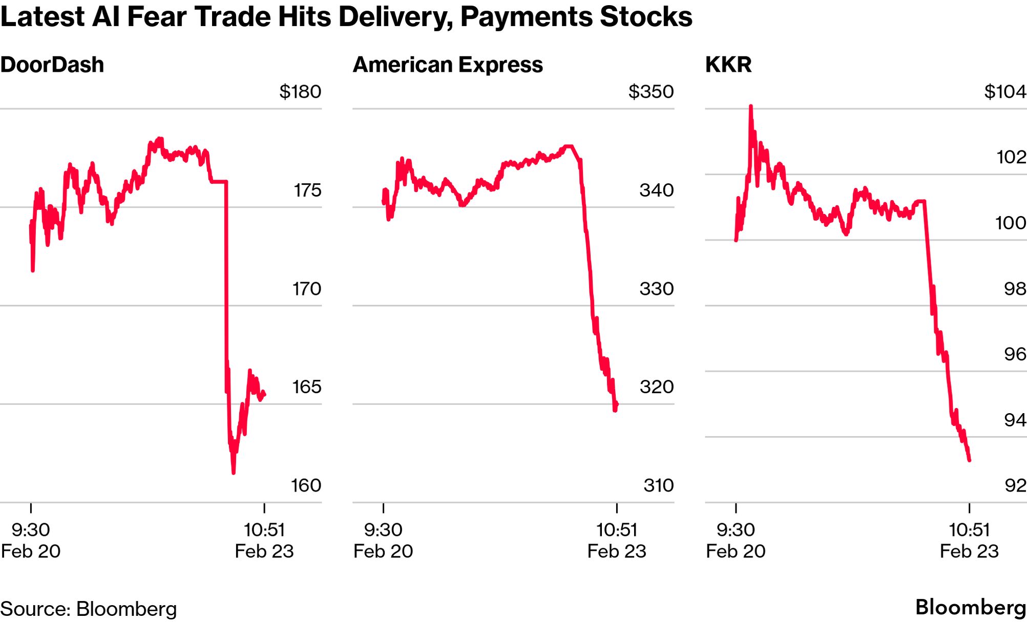 | It's time for some more AI "scare trades." Delivery, payments and (again) software stocks slid sharply Monday after a report laying out the potential risks that artificial intelligence could pose to various segments of the global economy. DoorDash, American Express, KKR and Blackstone all slumped more than 8%. Shares of other companies name-checked in the writeup, including Uber, Mastercard, Visa, Capital One and Apollo Global Management were all lower by at least 3%. Citrini Research presented a hypothetical scenario set a little more than two years from now, one where AI's disruption has caused mass unemployment for white collar workers, declining consumer spending, software-backed loan defaults and economic contraction. While the report notes it's a "scenario, not a prediction," some investors took it to heart. | |