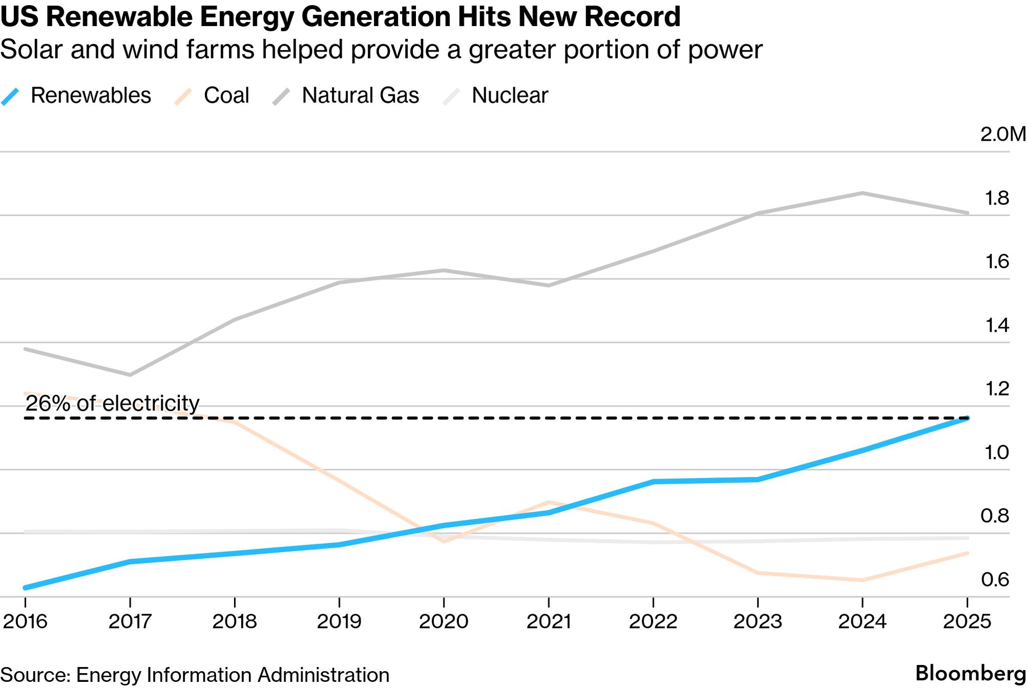 ![]() Policy-wise, 2025 was a tough year for renewables in the US. But that still didn't stop them from setting records for power generation. Today's newsletter breaks down what new data shows us. Plus, Washington, DC, isn't the only global capital with a sewage spill problem. Wellington, New Zealand, is also contending with what its mayor called a "catastrophic failure." But that didn't stop him from taking a dip in the affected waters. With that, let's dive in (to the newsletter)! Powering upBy Kyle Stock US utilities generated a record amount of energy from renewable sources last year, even as the Trump administration implemented a range of policies to stymie green energy. Some 1,162 terrawatt-hours of the country's electricity was generated from renewable sources in 2025, a 10% increase over the prior year, according to federal data released this week. That represents 26% of all US electricity made — enough to power about 108 million US homes for a year. Some months were even greener; in March, for example, renewables generated nearly one in three of the country's electrons. ![]() That stands in contrast to the Trump administration slashing incentives for wind and solar while gutting clean air regulations in a bid to help fossil fuels. The economics of renewables, though, have helped them generate a greater share of energy. "Renewables continue to grow, as much as headlines point to natural gas being king right now," said Patrick Finn, principal analyst at Wood Mackenzie, an energy research company. "Even though there's plenty of hurdles for renewables coming out of DC, we're coming out of four years where there weren't a lot of hurdles." While it was a good year for renewables, the surge in energy demand from data centers, electric vehicles and industry also boosted power generated from fossil fuels. That includes a 13% increase in electricity generated from coal. The Trump administration has also supported fossil fuel production and use with grants and orders to delay plant closures. However, renewables are outpacing those gains, driven by the falling cost of photovoltaic cells, wind turbines and giant batteries. Even without subsidies, renewable installations are now cheaper to build than alternatives in most scenarios, according to Lazard. Amanda Levin, director of policy analysis at the Natural Resources Defense Council, said the pace of green energy construction may actually accelerate as utilities race to beat deadlines for expiring federal incentives. ![]() The government estimates that 93% of new generation capacity expected to be added to the grid this year will come from wind, solar and batteries. That sets renewables up to generate an increasingly large percentage of all US power. Wood Mackenzie expects renewables, including hydroelectric power, to account for nearly one in three US electrons by 2030. "The only technologies to be deployed today at scale and at cost are wind, solar and battery storage," Levin said. "No matter what Trump tries to do, he's not going to see this resurgence of fossil fuels." Read the full story. You can subscribe to Bloomberg News for the latest on the energy transition and climate policy. Winds of change12.7 The number of gigawatts of wind power in the pipeline for 2027, according to Wood Mackenzie and the American Clean Power Association. The outlook for wind dims after that, though, as Trump's policies take their toll. Transition talk"The second part of the energy transition, and the one that's most frequently forgotten, particularly in the West, actually, is electrification. You have to electrify everything." Kingsmill Bond Strategist, Ember The first step, of course, is winding down the use of fossil fuels. Eww ZealandBy Ainsley Thomson About 70 million liters a day have been discharged since an incident Mayor Andrew Little has called a "catastrophic failure" on Feb. 4 at the city's main wastewater treatment plant, which serves about 180,000 residents. Strong winds and swells have threatened to whip the effluent closer to the shoreline, while residents have been enduring a sulfurous odor. It's been a surprising environmental hiccup in a country better known for its pristine natural beauty, and one that so far remains unexplained. An initial assessment has shown 80% of equipment at the Moa Point wastewater plant has been irretrievably damaged, and there's no timeframe yet on when the site will be operational again. While similar breakdowns are often linked to aging infrastructure, Little noted the Moa facility is less than 30 years old, well within its expected lifespan. "There's something else that has happened," he said. "We still need to get to the bottom of that." ![]() Wellington Mayor Andrew Little. Source: Office of the Mayor of Wellington New Zealand's government is setting up an independent review to work out what caused the failure. A spokesman for Veolia Environnement SA, which has a contract to operate the facility, declined to comment. In the meantime, beaches have reopened and Little is attempting to assure residents that the spill no longer poses risks to public health, with contamination well within safety standards. On Wednesday, he even took a dip himself at Lyall Bay, one of the impacted locations. "I don't want to give the impression that discharging millions of liters of untreated sewage into the sea is ok. It never is," Little said. "But we've got to be realistic with Wellingtonians too. If the testing is showing there's no real risk, we can't credibly keep saying to people to stay away from the beach." More from GreenFirefighters in southwest Florida are battling an expansive blaze on a federal nature preserve as an unusually intense winter drought grips the state. The National Fire has burned more than 25,700 acres — an area larger than Manhattan — since Sunday in the Big Cypress National Preserve south of Naples. The region is a popular tourist destination known as "Alligator Alley" for its plentiful wildlife