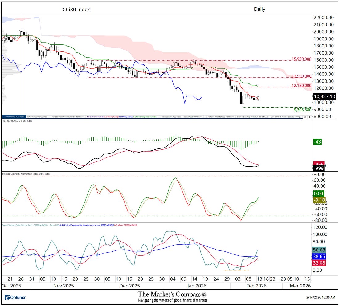 What follows is an excerpt from tomorrow’s Market’s Compass Crypto Sweet Sixteen Study that will be sent to my paid subscribers in the AM. The Daily Candlestick Price chart reflects the tight sideways trading pattern over the past week that produced the Weekly Doji seen on the previous chart. Thus far, the week ago last Friday’s lows at 9.305.38 have not been revisited. MACD has been tracking sideways with price and is stabilizing and is only one or two days away from crossing above its signal line if prices will cooperate and leave the current sideways trading pattern to the upside. The shorter-term Stochastic Momentum Index has turned higher from oversold territory and is tracking higher above its signal line. When prices fell to new lows my Sweet Sixteen Daily Momentum / Breadth Oscillator did not (yellow dashed line) and has turned high and is back above both the short-term 5-Day Moving Average (red line) and the longer-term 45 Exponential Moving Average (blue line) for the first time since mid-January when fell below both after the Oscillator did not confirm the January 14th stab above resistance at 15,950.00. I am now marking first price resistance at the Kijun Plot and price resistance at 12,180.00. Key support is at a week ago, last Fridy’s intraday low at 9,305.38. For readers who are unfamiliar with the technical terms or tools referred to in the comments on the technical condition of the SPX can avail themselves of a brief tutorial titled, Tools of Technical Analysis and an in-depth comprehensive lesson on Pitchforks is available on my website… Charts are courtesy of Optuma whose charting software allows the Technical Rankings to be calculated and back tested. To receive a 30-day trial of Optuma charting software go to… |