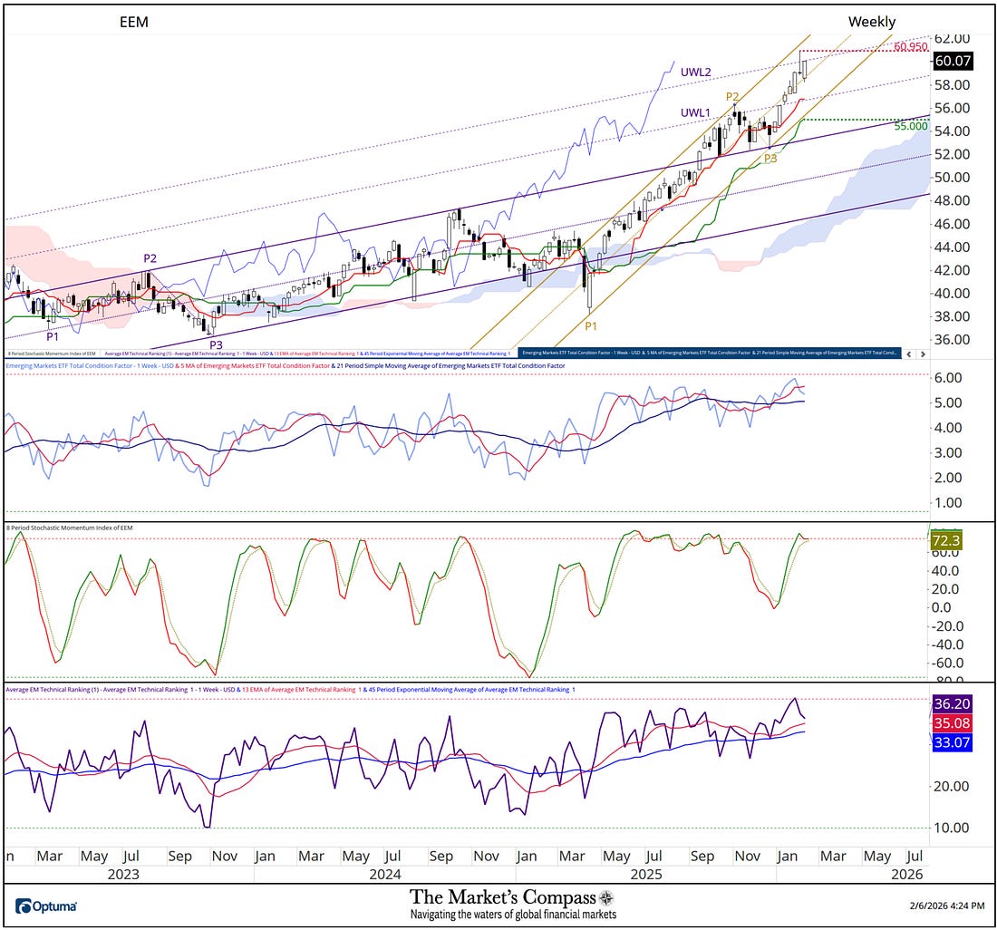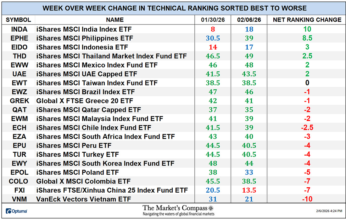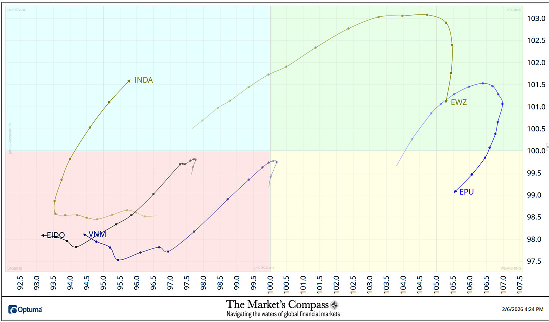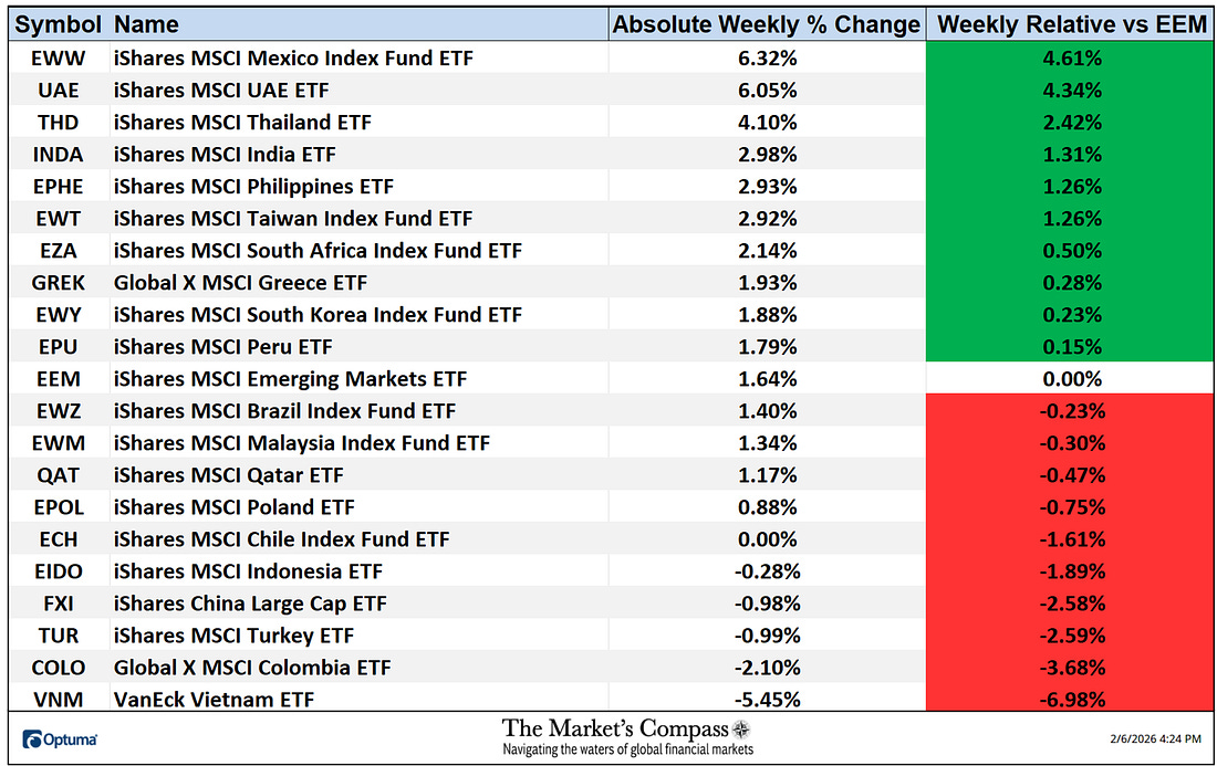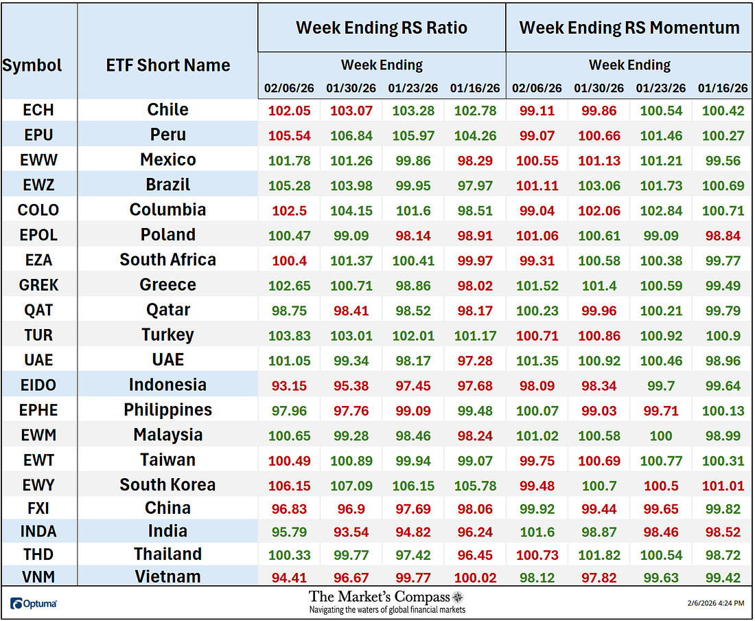 Welcome to The Market’s Compass Emerging Market’s Country ETF Study, Week #579. As always, it highlights the technical changes of the 20 EM Country ETFs that I track on a weekly basis and publish every third week. Paid subscribers will receive this week’s unabridged Emerging Market’s Country ETF Study sent to their registered e-mail. Past publications can be accessed by paid subscribers via The Market’s Compass Substack Blog. Next week I will be publishing The Market’s Compass Developed Markets Country ETF Study. On Sunday I published the latest edition of The Market’s Compass Crypto Sweet Sixteen Study which I publish on a weekly basis and tracks the technical changes of sixteen of the larger capitalized Cryptocurrencies. This morning’s Market’s Compass Emerging Markets Country ETF Study is being sent to free subscribers as well as my regular paid subscribers in a not so vailed attempt to lure free subscribers to support the work done in the three ETF Studies and the Weekly Crypto Sweet Sixteen Studies. This Week’s and 8 Week Trailing Technical Rankings of the 20 Individual EM Country ETFsTo understand the methodology used in constructing the objective EM Country ETF Individual Technical Rankings visit the mc’s technical indicators page at www.themarketscompass.com and select “em country etfs”. What follows is a Cliff Notes version* of the full explanation of the methodology I use… *The technical ranking system is a quantitative approach that utilizes multiple technical considerations that include but are not limited to trend, momentum, measurements of accumulation/distribution and relative strength of each individual 20 EM Country ETFs that can range between 0 and 50. The Total EM Technical Ranking or “TEMTR” is the sum of the twenty individual TRs and can be viewed as an overbought / oversold indicator as well as a confirmation / non-confirmation indicator. There is also a Total Ranking for each geographic region that can be viewed as a relative measurement on a week over week basis. This past week The Total EM Technical Ranking or “TEMTR” fell -3.27% to 724 from 748.5 the previous week which was down from the 825.5 reading three weeks ago for the week ending 2/23, which was the highest “TEMTR” since January 2021. The Total Lat Am EM Ranking fell the most of the three geographic regions, down -5.6% to 212 from 224.5 the week before. The Total EMEA EM Ranking fell -5.3% to 233 from 246. The Total Asia-Pacific EM Ranking rose slightly, up 0.4% to 279 from 278 the previous week. Six of the twenty EM Country ETFs I track in these pages registered a gain in their Technical Rankings or TRs over the past week; one was unchanged and thirteen had TRs that fell. Last week fifteen TRs were in the “green zone” (TRs between 34.5 and 50), four were in the “blue zone” (TRs between 15.5 and 34), and two were in the “red zone” (TRs between 0 and 15). The average TR loss was -1.23 vs the average TR loss the previous week of -3.85 when only two TRs rose and 18 moved lower. For the week ending 2/23, eighteen of the EM Country ETF TRs ended the week in the “green zone”, one was in the “blue zone”, and one was in the “red zone”. The Technical Condition Factor changes over the past week and previous 8 weeks*To understand the construction the of The Technical Condition Factors visit the Market’s Compass website www.themarketscompass.com and go to the mc’s technical indicators page and select “em country etfs”. A short version of the how the Technical Condition Factors are calculated follows… There are eight Technical Condition Factors (“TCFs”) that are a summation of the twenty ETFs TRs technical condition of each TCF question. The eight Technical Condition Factors do not ask the same number of questions. That is why it is calculated as a percentage. If a TCF individual reading is 100% that would mean that all Twenty ETFs fullfilled that particular TCF criterior. This past week a reading of 38.57% was registered in the Daily Momentum Technical Condition Factor (”DMTCF”) or 54 out of a possible total of 140 positive points. As a confirmation tool, if all eight TCFs improve on a week-over-week basis, more of the 20 ETFs are improving internally on a technical basis, confirming a broader market move higher (think of an advance/decline calculation). Conversely if all eight TCFs fall on a week-over-week basis it confirms a broader market move lower. Last week, two TCFs rose, five fell, and one was unchanged. Relative Strength and Weakness in the Emerging Markets ETFs vs. the EEM utilizing a Relative Rotation GraphThe Relative Rotation Graph, commonly referred to as RRGs were developed in 2004-2005 by Julius de Kempenaer. These charts are a unique visualization tool for relative strength analysis. Chartists can use RRGs to analyze the relative strength trends of several securities against a common benchmark, (in this case the EEM) and against each other over any given time period (in the case below, daily) over the past three weeks. The power of RRG is its ability to plot relative performance on one graph and show true rotation. All RRGs charts use four quadrants to define the four phases of a relative trend. The Optuma RRG charts uses, From Leading (in green) to Weakening (in yellow) to Lagging (in pink) to Improving (in blue) and back to Leading (in green). True rotations can be seen as securities move from one quadrant to the other over time. This is only a brief explanation of how to interpret RRG charts. To learn more, see the post scripts and links at the end of this Blog. Not all 20 ETFs are plotted in this RRG Chart. I have done this for clarity purposes. Those which I believe are of higher technical interest remain. After weeks of improving Relative Strength and Relative Strength Momentum both the iShares MSCI Brazil Index ETF (EWZ) the iShares MSCI Peru ETF (EPU) rolled over in the Leading Quadrant with EPU leading the char