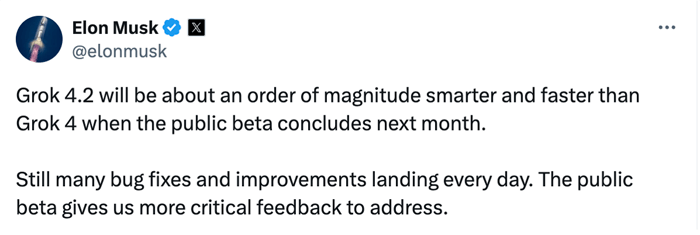 | | | | | Jeff is teaming up with Jason Bodner to discuss a group of "secret" AI stocks – plays that, on the surface, may not seem like they're connected to AI at all… but that are perfectly positioned to become the next trillion-dollar AI mega-caps… | | And next Wednesday, February 25, they're unveiling a system Jason's developed for spotting these unique stocks early. | | | The Maximum Truth-Seeking AI – A Magnitude Smarter | | | | It was yet another incredible week in high tech… | | The biggest happening of all was the release of xAI's Grok 4.2, which is now available in beta access (not yet available to the general public). | | At the moment, there is little to say other than that people are freaking out over how well its multi-agent architecture is working. | | Grok 4.2 has evolved into something so much bigger than what was originally planned. Shown below is Musk's comment that Grok 4.2 will be an order of magnitude smarter and faster than Grok 4… | | | | Will this be the moment? Will it become AGI? | | We'll find out very soon. We are on the cusp of it. And the acceleration is intense. One thing is certain, though… xAI's Grok model improves, every day, at an exponential pace. | | We're going vertical right now, which is why the world will be caught off guard when it happens. | | Buckle up, | | Jeff | | Bitcoin Bites the Dust? | | | Hi Jeff, | | Thank you for responding to my email to Brownstone. I appreciate your perspectives on many topics, but I'm concerned about your crypto services, which remain mostly underwater. | | You predicted BTC would reach 130K and ETH over 5K by 2026. Given recent market developments and BTC's dramatic failure to act as "digital gold," do you have an updated projection? | | Thanks. | | – Niles Y. | | | | Hi Niles, | | We continue to have success with our digital assets trading service, Neural Net Profits, but the impact on the broad crypto market has resulted in a lot fewer trades. | | Our signals have been significantly slower than last year, which makes sense given what is happening in the blockchain industry right now with respect to delayed regulations. | | To your point, however, it is a tough market for our Permissionless Investor portfolio, which isn't surprising considering what has happened to the entire industry in the last few months. | | One thing about the crypto market is that when it bounces back, it comes back strong. That's why being positioned in the highest-quality projects with large growth potential is so critically important. Those are the ones that bounce back the most. While we can't control the regulatory process, we can control the quality of the projects that we recommend. | | And I have been personally involved in Washington, D.C., advocating for regulations that will result in a healthy market for digital assets. I spend my time and travel explicitly for the benefit of my subscribers, in hopes that I can support industry regulations, if even in a small way. | | We'll get there. It's just taking a few months longer than what was originally planned. | | As for my prediction on BTC and ETH, I'm standing by it. The market structure bill will get signed into law, and all this fear, uncertainty, and doubt will pass. "Digital gold" has always been a popular meme, but the reality is that Bitcoin is the standard for a store of value in the digital assets industry. | | Bitcoin is a product of the energy and computational power required to produce it, and its monetary policy is code and cannot be changed. It is outside the control of the government, and in fact, the current administration continues to move forward with its Bitcoin reserve precisely because it has so much value. | | It's also worth keeping in mind that these kinds of pullbacks are not at all unusual for Bitcoin. | | Bitcoin pulled back 73% in 2018, 72.8% from its peak in 2021 through the end of 2022, and it is now down about 42% from last year's high. It may very well go lower. | | We're watching the $60K mark closely. But Bitcoin's climb will be sharp once it starts to run again. | | Recommended Links How To Be On The Right Side Of Trump's Biggest Move Yet Trump's moves in 2025 created massive winners and losers. Solar stocks lost $20 billion from a single announcement, while Palantir soared 140% when Trump made AI a national priority. Now Larry Benedict – who helped his readers profit during Liberation Day’s chaos – says Trump's preparing something even bigger. He calls it "Project 2026." Click here to discover the ONE ticker positioned to capture the gains… and get on the right side before Trump makes his move. Wednesday, February 25, at 8 p.m. ET: Two Investing Legends Are Revealing Their Next Big AI Picks Jeff Brown and Jason Bodner's AI picks have given their readers the chance to make as much as 2x, 3x, 11x, and even 320x their money. But they haven't used "traditional" AI stocks… They've used a "hidden" asset class that most people don't even know exists. During The Secret AI Stocks Summit, they'll reveal a system for spotting these plays. It's already pinpointed moves as high as 601%, 1,921%, 1,940%, and more during testing. They'll even each give away the name of a top pick – completely free. Register here… | | | Still Based, Still Optimistic | | | Hi Jeff, | | I'm happy to say that I've been subscribing to your newsletters ever since you began publishing just about 10 years ago, and I've always looked forward to learning from your insights and knowledge. It's been a wonderful journey… | | … Until now. | | Because in the last two pieces you published in The Bleeding Edge about Moltbook, I feel you express a sense of alarm for the first time ever about the impact of a new technology. | | Specifically, this concerns the explosive pace at which newly enabled agentic AIs are creating their own ecosystem, managing their own evolution (evolving their own code without human intervention), and urgently setting up mechanisms to defen