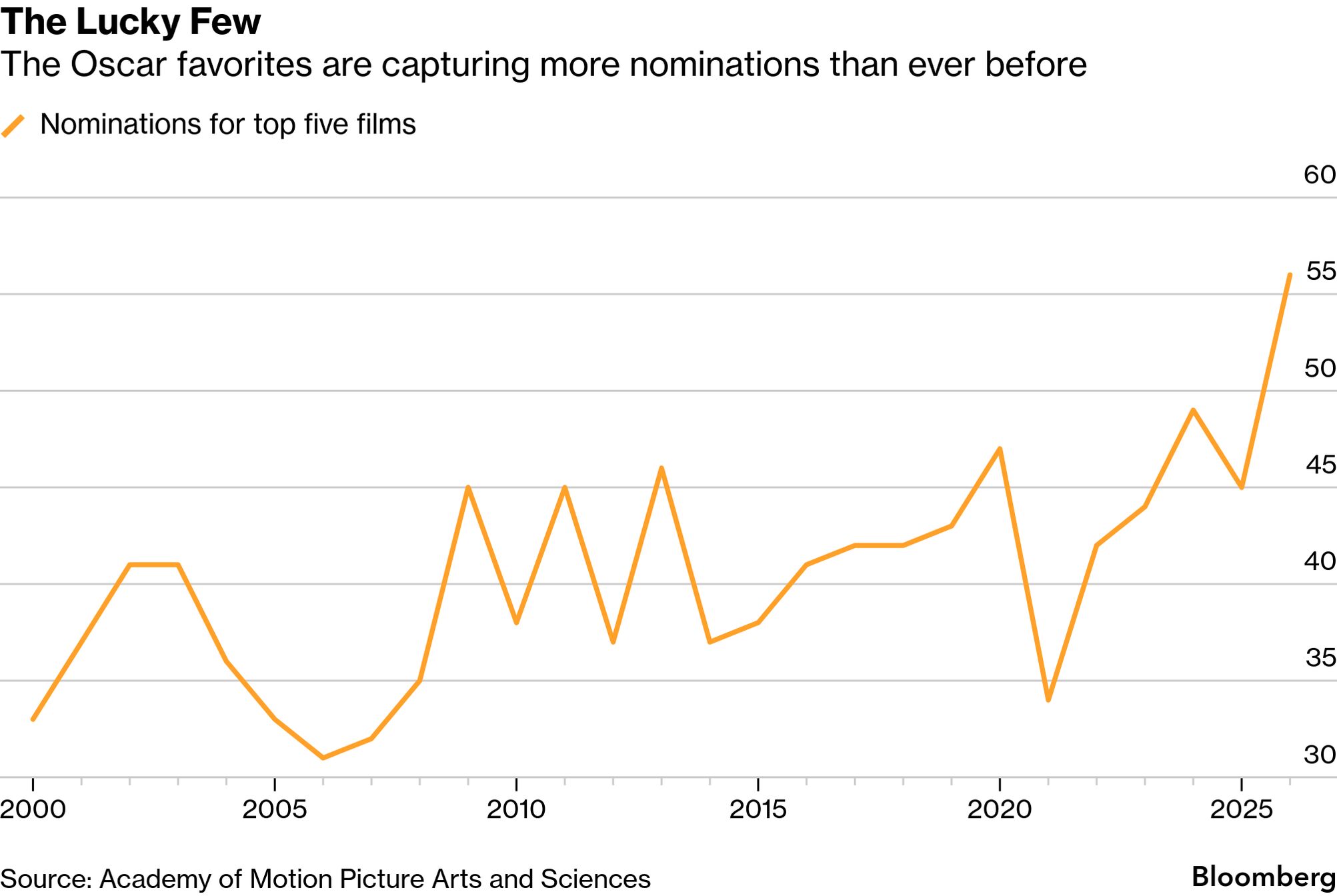 The Oscar race is shrinkingFewer movies are competing for more Oscars. Sinners earned 16 nominations at this year's Academy Awards, a record for an individual film. One Battle After Another earned 13 nominations, one shy of the previous record. All told, the top five nominees — a group that also includes Frankenstein, Marty Supreme and Sentimental Value — earned 56 nominations, making this the most top-heavy Oscars this century (if not ever). While this has been an exceptional year, it fits into a larger trend. The industry's biggest night is dominated by a shrinking set of pictures. Between 2000 and 2008, an average of more than 18 movies secured at least a couple nominations, and the top movies received an average of seven. In 2005, a high point for diversity, 22 different movies got at least two nominations. The best picture that year, Million Dollar Baby, received seven nominations. This year, six movies secured more than half of all nominations — and that's with an expanded field of best picture nominees, as well as a new category (best casting). ![]() The shrinking number of Oscar contenders reflects a couple major trends in the film business, according to industry experts. Major Hollywood studios release fewer films than they once did – and the movies they do make don't fit the Oscar mold. The number of films released by the six major studios has declined by about 35% since the 2000s, according to the Numbers, a research firm. 20th Century Fox, which used to be a major studio, is now a division of Disney and produces a handful of films a year. Paramount, which used to release about 15 movies a year, hasn't crossed 10 in almost a decade. (That will change this year.) Universal and Sony are the only studios that have maintained or increased their output. They are also two of the three studios that continue to operate specialty divisions known for taking greater artist risk: Universal's Focus Features and Sony Pictures Classics. ![]() The cut in production isn't as dramatic when you consider the total number of wide releases. They have declined 10% to 20%, per Comscore, another research firm. There has been a surge in independently produced cinema, as well as films for streaming that also screen in theaters. Netflix and Apple bankrolled three of this year's films with multiple nominations, though Amazon is the only streaming service giving most of its movies a more traditional theatrical run. The studio movies getting made today are either expensive blockbusters based on existing intellectual property or low-budget genre fare. Action and adventure movies accounted for more than half of all ticket sales in 2025, per the Numbers. Horror was the third-biggest genre. Most of the films that competed for awards in the 2000s were dramas released by a major studio or one of their sub-labels. Universal won for Gladiator and A Beautiful Mind. Warner Bros. won for Million Dollar Baby and The Departed. In 2005, all five of the best-picture nominees were released by a major studio or one of their labels. (Miramax was owned by Disney.) A year later, Universal had five different movies earn at least four nominations, including two by Focus Features. Some of those specialty labels, including Warner Independent and Paramount Vantage, disappeared during the great recession. Miramax is now a library owned by the Qataris. Focus Features has tweaked its mandate in recent years, though the brand endures, along with Searchlight and Sony Pictures Classics. Studios now make very few adult dramas — the films that have historically competed for Oscars. Dramas accounted for just 7% of ticket sales last year — a drop of about 50% from two decades ago. Comedy, though hardly an awards juggernaut, has fallen even more. ![]() Even Amazon and Netflix, which once stormed film festivals looking for awards contenders, have shifted toward commercial fare that appeals to more customers. Oscar consultants say a shift in priorities and membership at the Academy of Motion Picture Arts & Sciences has also influenced the awards. The group expanded the number of nominees for best picture in 2009 after snubbing The Dark Knight — an effort to create space for blockbusters. Instead, the academy has become even more enamored with the work of auteurs, handing awards to A24, Neon and other independents. Even the films from major studios that earn nominations tend to be those from major filmmakers like Christopher Nolan, Martin Scorsese and Guillermo Del Toro. More recently, the academy has also ushered in a lot of new members, many of them from outside the US. Four films with multiple nominations this year were made in a language other than English. The embrace of foreign films and indies is a common explanation for the shrinking audience for the annual Oscars TV show. The academy routinely honors movies that aren't broadly popular. Anora, last year's best-picture winner, grossed just $20 million in the US. Last year's show attracted an audience of about 20 million people, down more than 50% from the peak viewership in the late 1990s and early 2000s. Yet these criticisms aren't always reflected in the data. The average gross of the best-picture nominees has increased since the early 2000s. In the last three years, the average was north of $100 million thanks to hits like Wicked, Top Gun: Maverick and Oppenheimer. (Last year's Oscars actually hit a five-year high in ratings despite the lesser-known winner.) ![]() These numbers aren't adjusted for inflation, but that doesn't change the overall point. While it is true that many Oscar winners aren't mass-market films, expanding the list of best picture nominees has led to a mix of big studio releases and indies. Voters get very excited when a studio movie hits the sweet spot. Universal's Oppenheimer ran the table in 2024, as Sinners and One Battle are expected to do this year. This year features the least-popular grouping of Oscar nominees since 2014 (excluding the pandemic