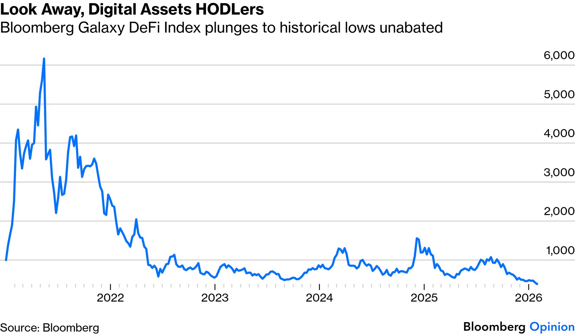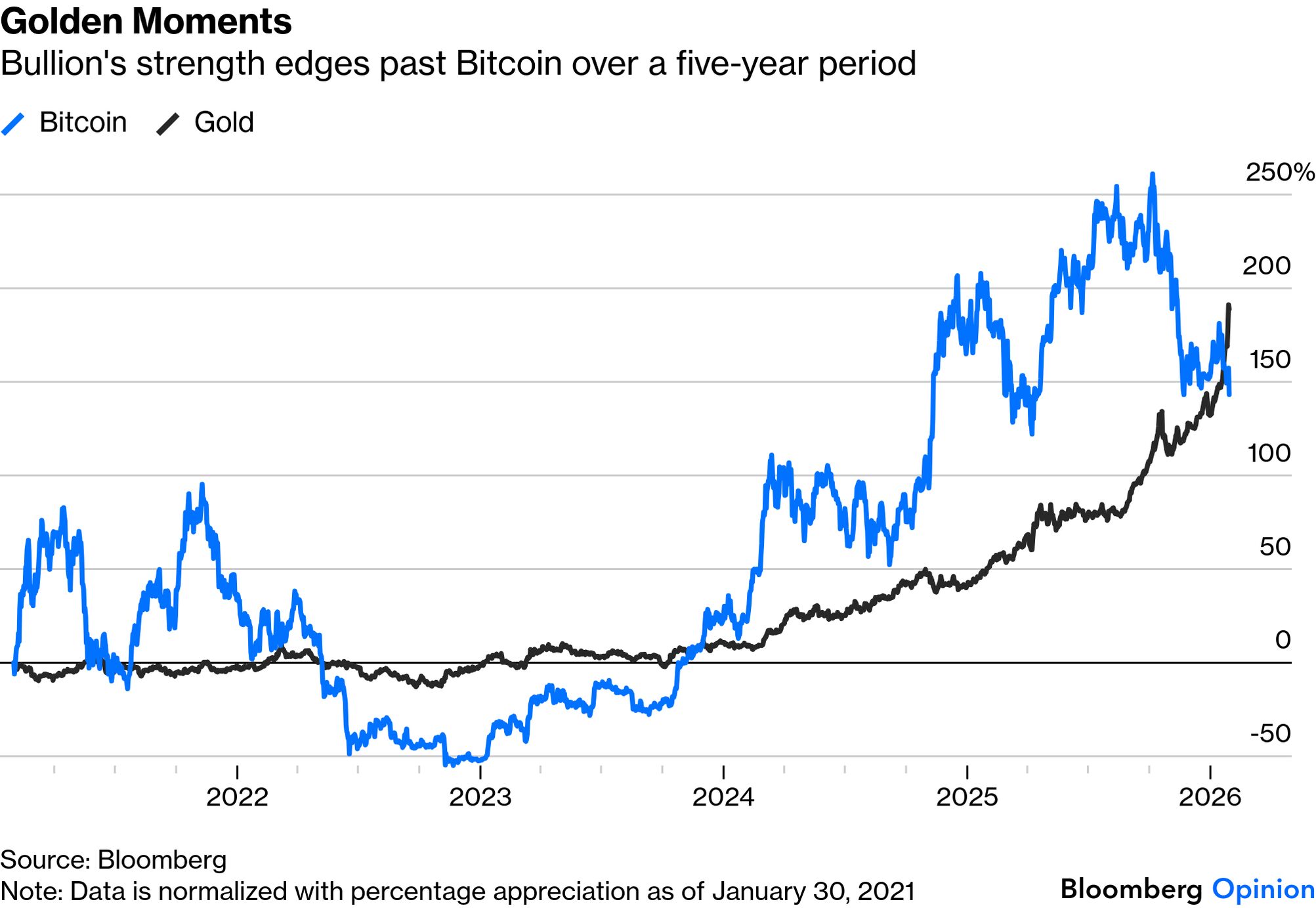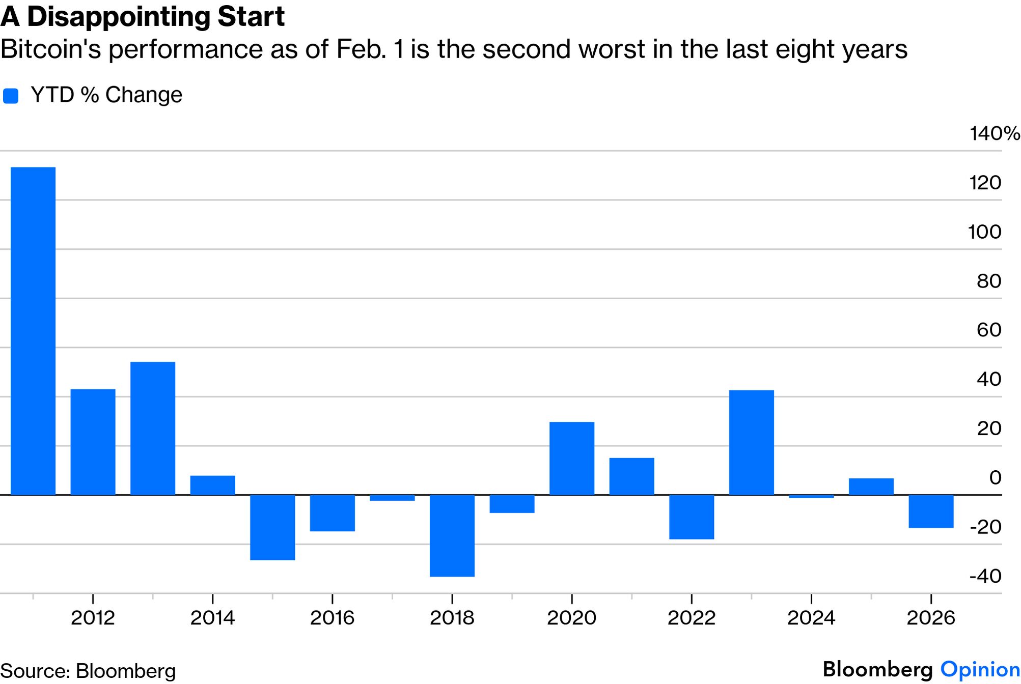 In other words, the people on the top bar of the K are helping to drive a cyclical rebound with the profits they have made. The equity tail, to use Peta's phrase, may be wagging the equity dog. Kevin Warsh's nomination to the Fed chairmanship hasn't caused much dismay in equities, which had a strong Monday. But he may need to keep it that way, as the economy looks ever more leveraged to the K-shaped equity rally. In the past, he has criticized the Fed for "prioritizing long-term growth over fleeting market stability, temporary stimulus and market manipulation." He also has a perhaps slightly alarming endorsement from the renowned bearish strategist Albert Edwards of Societe Generale SA, who once praised Warsh for his warning that the Fed had become "the slave of the S&P 500." Warsh, without doubt, wants to win the central bank's release from its obligation to prop up the stock market, but that looks very challenging. Meanwhile there's another intriguing exception to the appetite for risk in crypto… Bitcoin's recent record is the antithesis of its supposed status as the quintessential risk-on asset. Since its October peak, the so-called digital gold has plunged by more than 40%, bringing the rest of the crypto market with it. Its year-to-date loss of 10.5% — when enthusiasts had expected a regulatory tailwind — is a source of deep frustration. It hasn't started a year so badly since 2022, when the Fed was readying one of the most aggressive tightening cycles in its history: Bitcoin's cough has infected other digital assets with a terrible cold. The poor run, especially when set against gold's performance, is striking. It's hard to draw parallels between the two assets as credible hedges against currency debasement. The shiny metal may have just taken a plunge, but it has still fared far better than Bitcoin, which was invented for uncertain times like these: Why is this happening? Gavekal Research's Louis-Vincent Gave points to differences between the US and Asian liquidity environments when talking about the divergence between crypto and precious metals. Crypto is more sensitive to shifts in US liquidity while precious metals benefit from the recycling of Asian capital, particularly in China, where Bitcoin trading and mining have been prohibited since 2018. That money has to go somewhere, and so it is poured into gold: Until Warsh's Fed chair nomination, gold and Bitcoin were headed in different directions as traders retreating from the token reallocated to precious-metals funds. Such funds absorbed $1.4 billion in fresh inflows, while Bitcoin-linked products suffered roughly $300 million in withdrawals on Thursday as the selloff gained strength. Perhaps more alarmingly, the post-Warsh rout in gold and silver might by this logic have released money back into crypto, but Bitcoin disintegrated further over the weekend. Bitcoin has already been through several winters, and summer always returned. Arca Investments' Jeff Dorman laments that "the good years for crypto investing seem like ages ago." He doesn't offer any great reassurance for crypto enthusiasts: Back in 2020 and 2021, it seemed like there was a new narrative/sector/use case and a new type of token every month, and positive returns came from many corners of the market. While blockchain's growth engine has never been stronger (on the heels of Washington legislation, the growth of stablecoins, Decentralized Finance (DeFi), and real-world assets tokenization), the investment environment has never been worse.