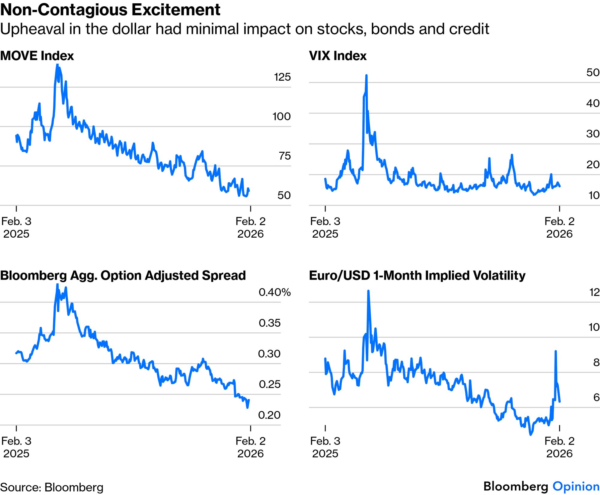 And indeed, making more money has been easy of late for those who already have some. Equities have steadily beaten bonds (as proxied by the main exchange-traded funds for the asset classes) while a boring diversified portfolio of 60% stocks and 40% bonds has done just fine: This isn't, evidently, how it feels for miserable consumers. It's also hard to square with a remarkably hectic month that brought the capture of Venezuela's Nicolas Maduro, insurrection in Iran, the attempted annexation of Greenland, and death on the streets of Minneapolis, and concluded with the biggest one-day crash for precious metals in history. But outside of the dollar and gold, where volatility has spiked, other asset classes have been serene. Volatility in bonds (shown by the MOVE index) has fallen steadily since Liberation Day, credit spreads are at their tightest since the Global Financial Crisis, and equity volatility remains contained: It seems as though the burst bubble in gold and the dollar meltdown, lynchpins of the global financial system, have been treated like trees that fall in the wood and nobody hears them. This is in part because buying from China has driven gold. It's also because for now the US economy is growing in a way that supports corporate earnings beautifully. With growth like this, Fed interest-rate cuts seem a little less urgent, and credit and equities can continue cruising swan-like across the surface, even with much effort going on beneath. A problem with this is that we need the swan-like glide to continue. Doug Peta of BCA Research warns that consumption growth has outpaced the rise in disposable household income (and triumphed over the negativity in the confidence surveys). It's hard to attribute that to anything other than the portfolios of those who hold assets: The hoi polloi are not borrowing to bridge the gap, consistent with consumer credit's lessened sensitivity to interest rates following the financial crisis. Although the concentration of equity ownership continues to increase, our analysis of disaggregated household balance sheets suggests that brokerage accounts are the most likely funding source.