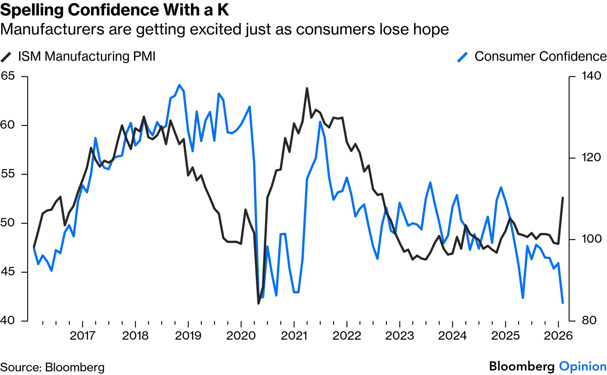 | Nobody's perfect. But taken in isolation, the latest US economic numbers look pretty close. The Institute for Supply Management's survey of manufacturing, long a reliable economic leading indicator, has been signaling for years that the sector is slumping. It came as a bona fide surprise to see its measure for new orders shoot up last month, putting it now far ahead of inventories. It's one month's data point, but it certainly looks like the beginning of a true cyclical restocking boom: The overall number was the strongest since the Federal Reserve started tightening early in 2022. Earnings and the entire global stock market have been suggesting something like this is afoot; this is one of the clearest confirmations yet from the mainstream data. That said, it maintains another trend — the views of manufacturing executives and consumers (as measured by the Confidence Board) are diverging and forming a perfect K-shape: There are caveats. The Conference Board suggests that consumers feel even worse than they did during the worst of the pandemic lockdowns, which is startling to say the least. Other surveys, such as the University of Michigan's, show poor confidence, but nothing as bad as this. The notion of a recovery that many don't feel — with gains for some balanced by a downturn for others — seems stronger than ever. Peter Atwater, the behavioral economist who originated the K-shaped economy during Covid to signify a bifurcated recovery, suggested that the latest data might be distorted by ripple effects from last year's government shutdown. But the overall picture emerging makes sense: This reflects the relative confidence of business managers and asset owners versus folk who don't own assets. If you looked at portfolios in January, more or less everything was at records. If you owned anything you felt great.