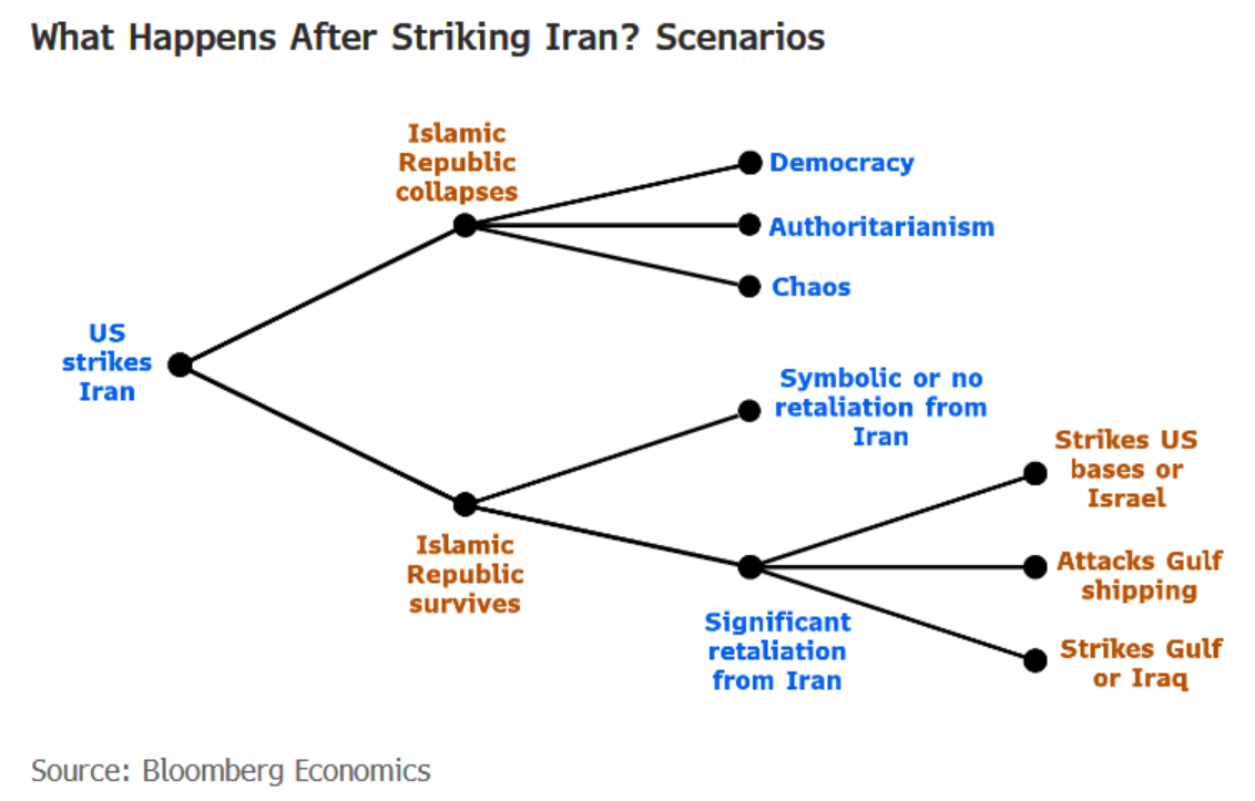 ![]() As a subscriber to Balance of Power, Economics Daily, Brussels Edition or Supply Lines, you're getting this special edition of the Balance of Power newsletter. To continue receiving Balance of Power, sign up here. Ordering strikes on Iran on Saturday morning, US President Donald Trump completed an about-face from the populist America-first candidate who rose to prominence a decade ago, propelled by Americans' distaste for foreign military campaigns. Trump's second term has been marked, instead, by a fresh imperialist streak. He's strained ties with longtime US allies with threats to takeover Greenland from Denmark and a swathe of military actions. Those have included last month's ousting of Venezuelan President Nicolas Maduro, the June attacks on Iran's nuclear facilities and Christmas day strikes on Nigeria. Saturday's joint strikes with Israel against Iran cement the 180-degree turn from the 'Make America Great Again' orthodoxy to a more interventionist bent. The also pose a huge risk for Trump ahead of mid-term elections in November. Iran could withstand the strikes for weeks, leading to potential US casualties — which Trump himself acknowledged — and a spike in energy prices. ![]() "The Iranian regime seeks to kill," a tieless Trump, wearing a white 'USA' baseball cap, said in a video released in the dead of night on Saturday morning. "The lives of courageous American heroes may be lost and we may have casualties. That often happens in war, but we're doing this not for now, we're doing this for the future and it is a noble mission." Even before now, Trump's focus on foreign matters had shown signs of fraying parts of his base, especially with many Americans feeling squeezed financially. Polls predict the US president faces a daunting challenge in the November elections, which could see his Republican party lose control of at least one chamber of Congress. Iran reacted almost immediately by launching missiles at US bases in the oil-rich Persian Gulf, including in Qatar, Bahrain and the United Arab Emirates. There was no immediate word on whether anyone was hurt. Oil's already up almost 20% this year, mostly because of the US-Iran tensions. Any further jump will probably raise US gasoline pump prices, further squeezing Americans. For now, Trump's relying on air strikes to carry out what looks like a regime-change campaign, with him urging Iranians to take over the government. There's no indication that he will deploy ground troops. ![]() Smoke following a missile strike, where the headquarters of the U.S. Navy's 5th Fleet is based, in Manama, Bahrain, on Feb. 28. Photographer: Anadolu/Anadolu Last May, Trump delivered a speech in Riyadh, Saudi Arabia, lamenting past US actions in the region. "The so-called nation builders wrecked far more nations than they built and the interventionists were intervening in complex societies that they did not even understand themselves," Trump said. "In recent years, far too many American presidents have been afflicted with the notion that it's our job to look into the souls of foreign leaders and use US policy to dispense justice for their sins." In Saturday's video, Trump struck a completely different tone. "When we are finished, take over your government," he said to Iranians. "It will be yours to take. This will be probably your only chance for generations." Global Must ReadsThe unprecedented US and Israeli attack against Iran has already surpassed previous strike-and-retaliation cycles as Tehran treats the conflict as an existential threat. Israel and Gulf states closed their airspace on Saturday after the start of strikes on Iran. The Iranian government also shut down its airspace. Emirates, the biggest carrier in the Middle East, said all flight operations in Dubai were suspended. OPEC+ will consider the option of a larger oil-supply increase when key members meet on Sunday, according to a delegate. The group, led by Saudi Arabia and Russia, was expected to resume modest production increases from April after a three month supply freeze, several delegates said earlier this week. In the fourth quarter, they had added monthly increments of 137,000 barrels a day. ![]() Bitcoin and other digital assets fell sharply after the strikes. Bitcoin dropped as much as 3.8% to $63,038, while Ether, the second-largest token, slid 4.5% to $1,835. Roughly $128 billion in market value was erased across digital assets in the immediate aftermath of the news, according to data from CoinGecko. Iran has faced suspicion for decades over its nuclear ambitions and whether it's developing the capability to fire an atomic weapon. Here's what we know about about Tehran's atomic capabilities. Sign up for the Washington Edition newsletter for news from the US capital and watch Balance of Power at 1 and 5 p.m. ET weekdays on Bloomberg Television. Chart of the Day![]() The central risk for the global economy is oil, say Dina Esfandiary and Ziad Daoud of Bloomberg Economics. Iran produces about 5% of global oil supplies. More importantly, about one fifth of global oil flows go through the Strait of Hormuz, which Iran has threatened to close. If it carries through its threats, oil could climb as high as $108 per barrel. Read the full research on the Bloomberg Terminal. And FinallyUS involvement in, and conflict with, Iran is complicated and can be traced back decades — here's our visual timeline. ![]() Ayatollah Ruhollah Khomeini returns to Iran in 1979. Source: Bettmann/Bettmann More from Bloomberg