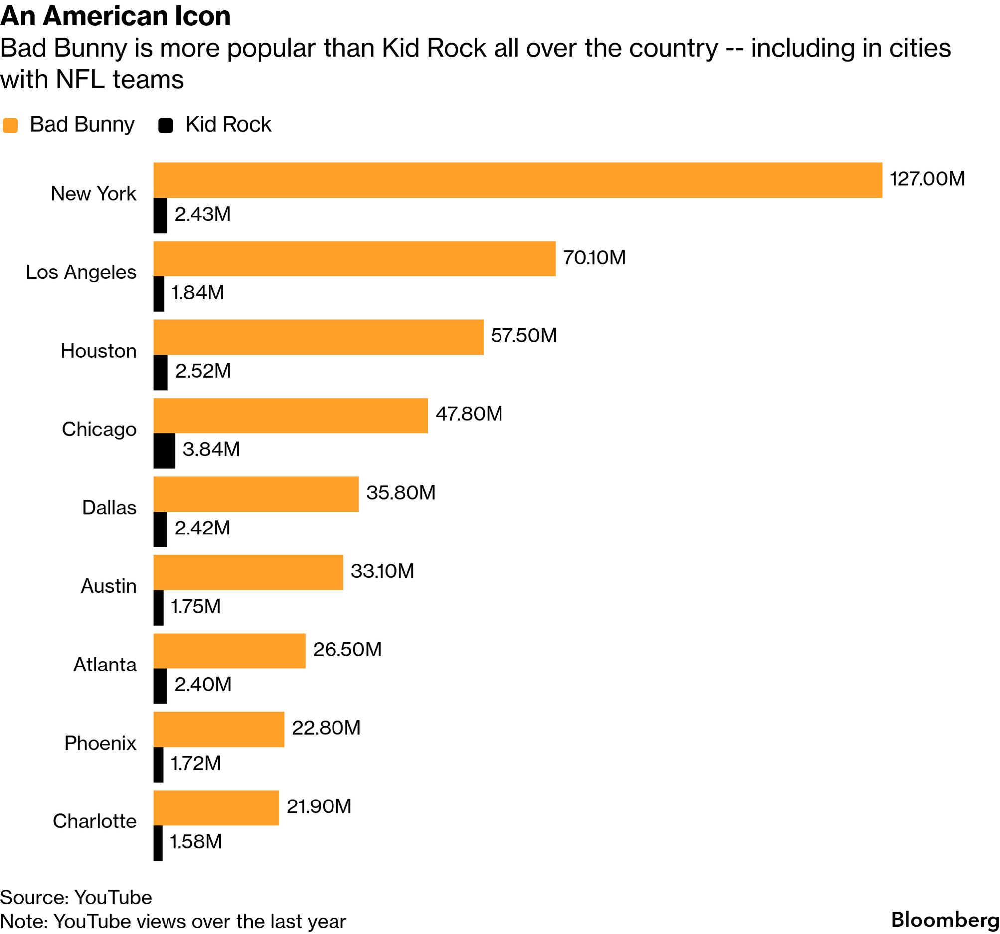 Weekly playlistI am going through a lot of old playlists and stumbling on songs I haven't heard in a while — Charlotte Gainsbourg, Caribou, Beck, Jenny Lewis and Charles Bradley all got me through a week of illness. Having written about Bad Bunny for a long time, I am eager to see his Super Bowl halftime performance. (Topping Kendrick Lamar is going to be tough.) The backlash to his performance — from people upset that someone who performs in Spanish is headlining the most American of sporting events — is confusing. He is not a niche artist, or a coastal artist. His music videos on YouTube over the last year generated 1.56 billion views — compared to 158 million for Kid Rock, who is performing the alternate halftime show. If you look at the markets where his music is most popular, it looks like a list of the biggest cities in the country: New York, Los Angeles, Houston, Chicago and Miami are the top five. The northeast (New York), mid-atlantic (Philadelphia), midwest (Chicago) and southeast (Orlando) all appear in the top 10, as do San Francisco and three cities in Texas. ![]() Bad Bunny isn't just the most popular artist in the world (per Spotify). He's one of the most popular acts in the US — all over the country. If you don't yet subscribe to this newsletter, fix that. More from BloombergGet Tech In Depth and more Bloomberg Tech newsletters in your inbox: