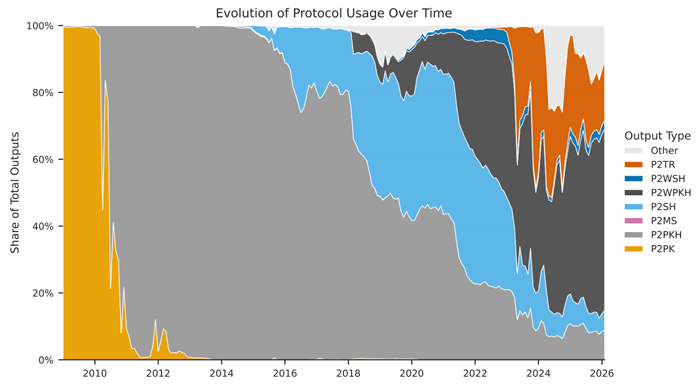 | Above, we can see the evolution of the Bitcoin blockchain protocol as it pertains to transaction output scripts, which are used to transact on Bitcoin's blockchain. |