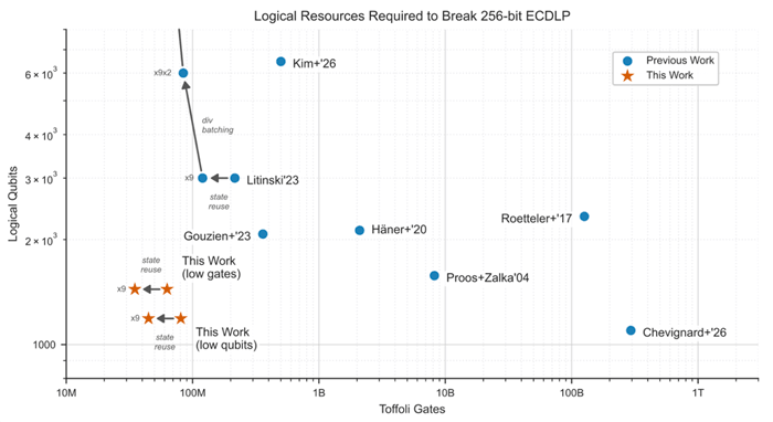 | Quantum computing systems that are low and to the left of the chart (the red stars) require far less quantum computational resources to break ECC. |