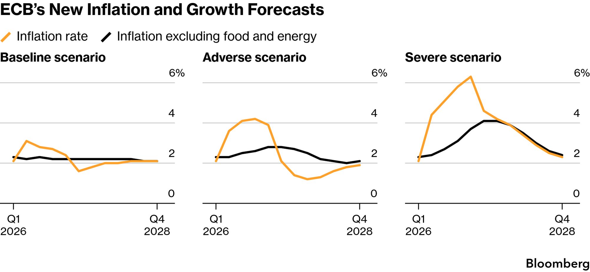 Seen and Heard on Bloomberg ![]() ECB Governing Council member Gabriel Makhlouf didn't rule out an increase in interest rates next month should data signal the need for such a step, though said it's impossible to commit with uncertainty so high. "If the facts point to us having to take action, we will absolutely take action," he told Bloomberg TV. "But in the end it depends on the evidence and quite clearly, we are six weeks away from having to make another decision. Chart of the Day![]() As markets absorb the ramifications of the attacks on key energy infrastructure in the Middle East, the ECB warned that inflation could peak at 6.3% in the first quarter of 2027 under a severe version of how events in Iran may play out. The ECB said Thursday that its extreme scenario — published alongside quarterly economic projections — would also trigger a short recession in the 21-nation bloc. Coming up