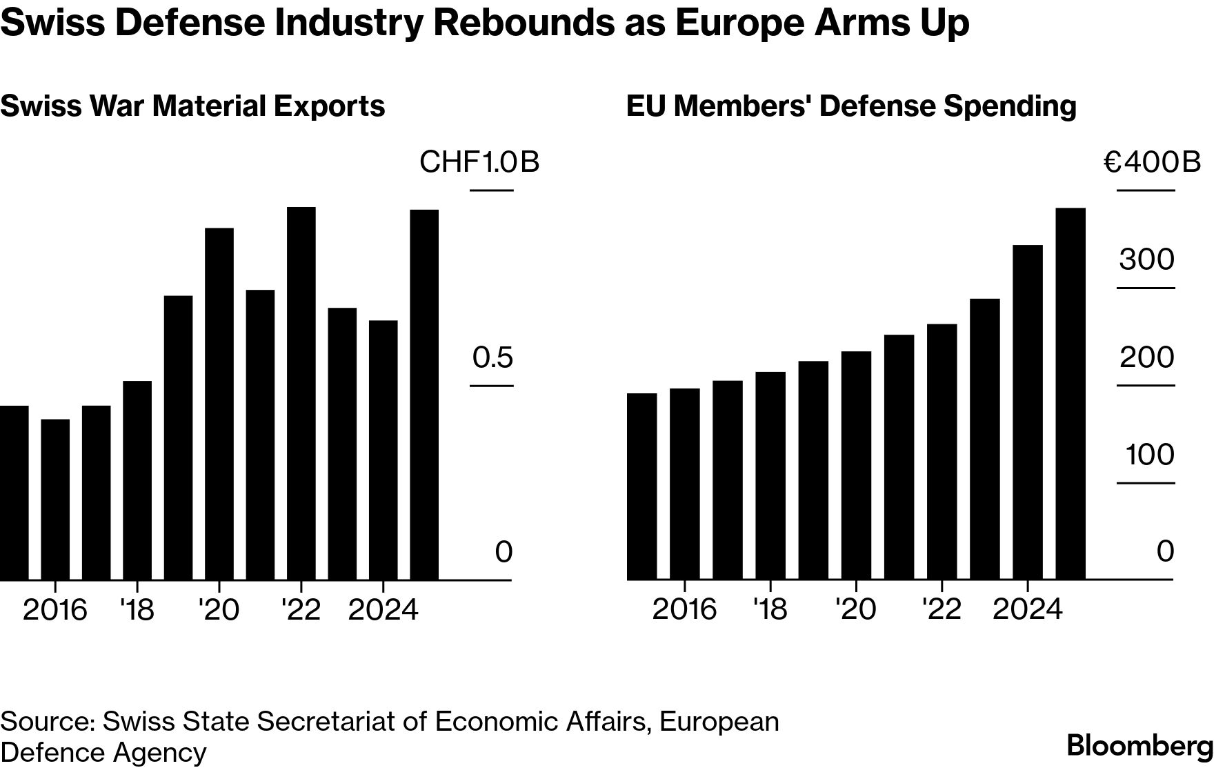 Seen and Heard on Bloomberg![]() Volkswagen is targeting more cost reductions to protect profitability under pressure from competition, tariffs, and electric vehicle development costs. "The next step should be drawing even more on group synergies, reducing complexity in the group," Volkswagen CFO Arno Antlitz told Bloomberg TV. "We have to prepare for a more challenging competition also in Europe." Europe's largest automaker forecast an operating return in a range of 4% to 5.5% this year. Chart of the Day![]() Swiss arms shipments abroad neared an all-time high last year as European defense spending boomed, a rebound for an industry that feared extinction over the country's strict export rules. War material exports surged 43% to 948 million Swiss francs ($1.2 billion) in 2025 from the previous year, according to the State Secretariat of Economic Affairs. Coming up