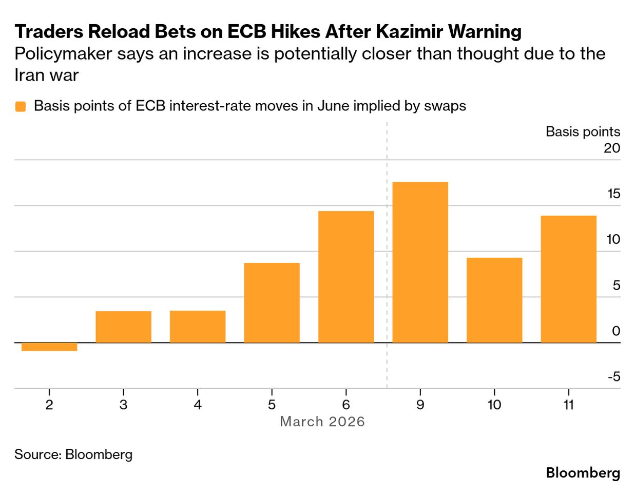 Seen and Heard on Bloomberg![]() The ECB should "just sit tight for now and make reassuring noises" despite the rise in energy costs resulting from the Iran war, according to Janet Henry, global chief economist at HSBC. "This is the difficulty with oil prices if inflation expectations are not anchored," Henry told Bloomberg TV. "Now, they absolutely are in the case of the eurozone, because if oil prices go up and gas prices go up and all these other costs go up, you're spending more on those goods, that should squeeze your spending on other areas and other areas of demand and other prices should fall." Chart of the Day![]() ECB Governing Council member Peter Kazimir suggested the Middle East conflict and its impact on inflation could nonetheless force the ECB to raise interest rates sooner than anticipated. "For the time being, we need to stay calm," even though "I'd say a reaction by the ECB is potentially closer than many people think," Kazimir said yesterday in an interview in Frankfurt. "I don't want to speculate about April or June. But we will be ready to act if needed." Coming up