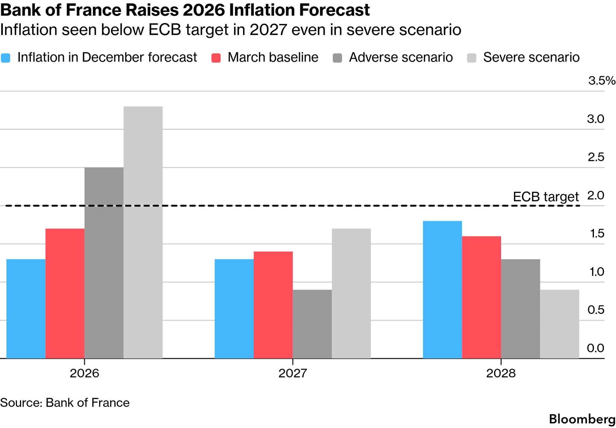 Seen and Heard on Bloomberg ![]() Canada wants to play a role in the current diplomacy involving the Middle East, its foreign minister Anita Anand told Bloomberg TV on the sidelines of the G-7 Foreign Ministers' meeting in France. She spoke with her US counterpart Marco Rubio yesterday. "I indicated that Canada wants to play a role in this diplomacy," she told Oliver Crook, noting the importance of "de-escalation and preservation of civilian life." Chart of the Day![]() The Bank of France reduced its 2026 economic-growth forecast and lifted its inflation prediction as it registered the impact of surging energy prices caused by the Iran war. Still, the projections suggest less acute inflation than the ECB's estimates, envisaging consumer prices rise less than 2% next year even in the severe eventuality. For growth, the Bank of France's adverse scenario shows a larger drag this year but an alignment with the baseline forecast from 2027. Coming up