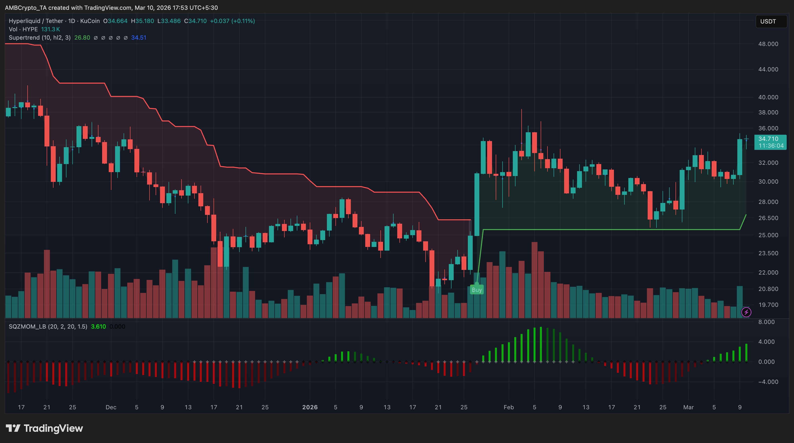 HYPE approached the $35 region after extending its recovery from late-January lows near $26, with rising platform activity boosting sentiment. Price held above the Supertrend support while the Squeeze Momentum indicator turned positive and volume strengthened during the rebound.