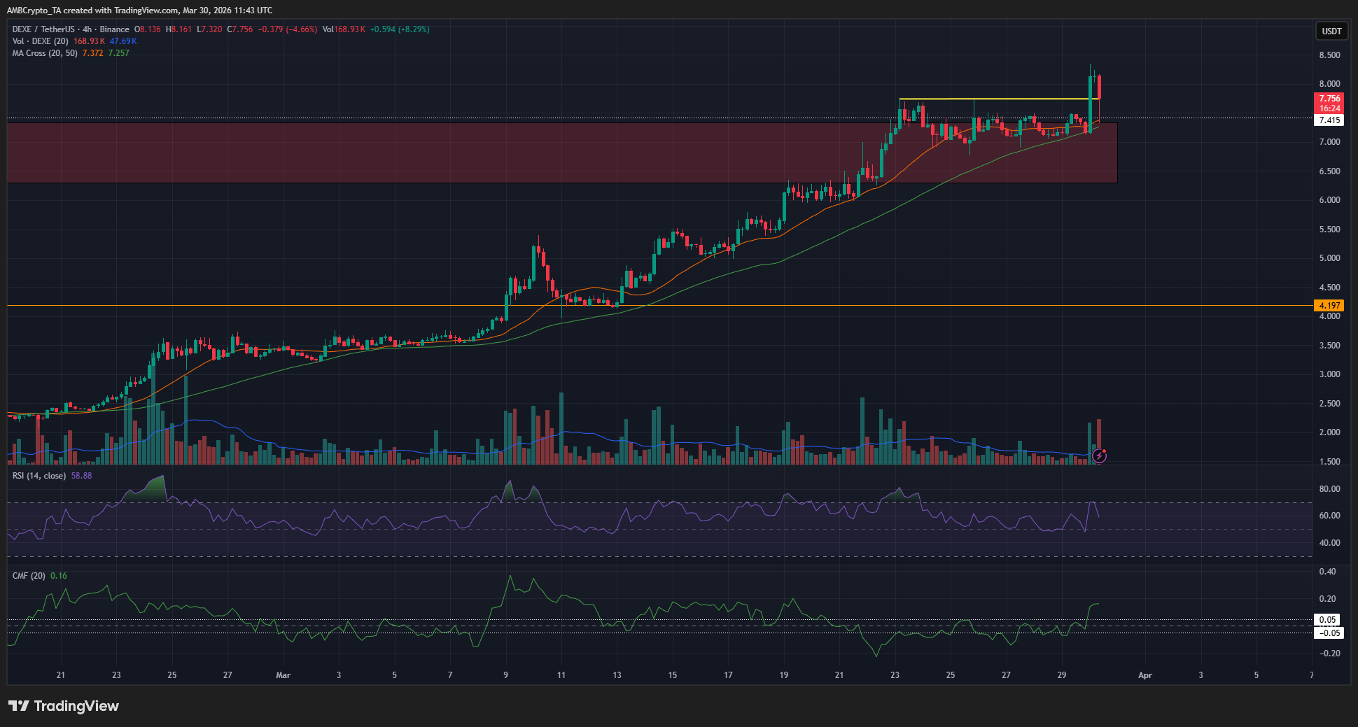Since the market-wide crash on February 6, DEXE has rallied 346% in under two months. It was an impressive performance from an asset with a $644.8 million market cap. The sustained buying pressure has pushed the AI token above the $7.4 resistance area from October 2025. The moving averages and the RSI showed strong bullish momentum on the chosen timeframe. Another significant development was the high trading volume breakout past the $7.7 local resistance from last week. The CMF spiked above the +0.05 level to show increased buying pressure. This breakout is likely to send DEXE on its next leg higher to $8.6. |