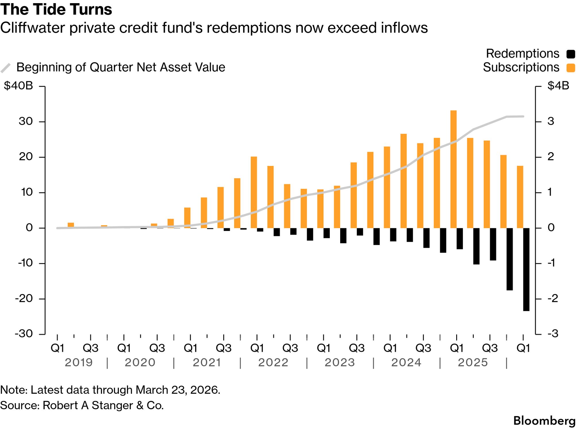The Big TakeCliffwater's father-son team built a giant $33 billion private credit fund that's at risk of falling hard as investors rush for the exits. The firm's unusual business model is being closely watched as the whole industry faces a liquidity squeeze and redemption pressure. ![]() OpinionThere are no reliable safe havens for investors seeking refuge from the Iran war, Marcus Ashworth writes. Gold has lost a quarter of its value, Bitcoin is down by over 40%, and even the dollar has made only modest gains. ![]() More Opinions Play Alphadots!Our daily word puzzle with a plot twist. ![]() Today's clue is: Field goal? Before You Go![]() Illustration: Danielle Del Plato/Bloomberg Red Lobster once defined American casual dining, but a surge of competition since the early 2000s steadily eroded its market share. While its new CEO is pitching a turnaround, behind the scenes the chain is still treading water. A Couple More More From BloombergEnjoying Morning Briefing Americas? Get more news and analysis with our regional editions for Asia and Europe. Check out these newsletters, too: