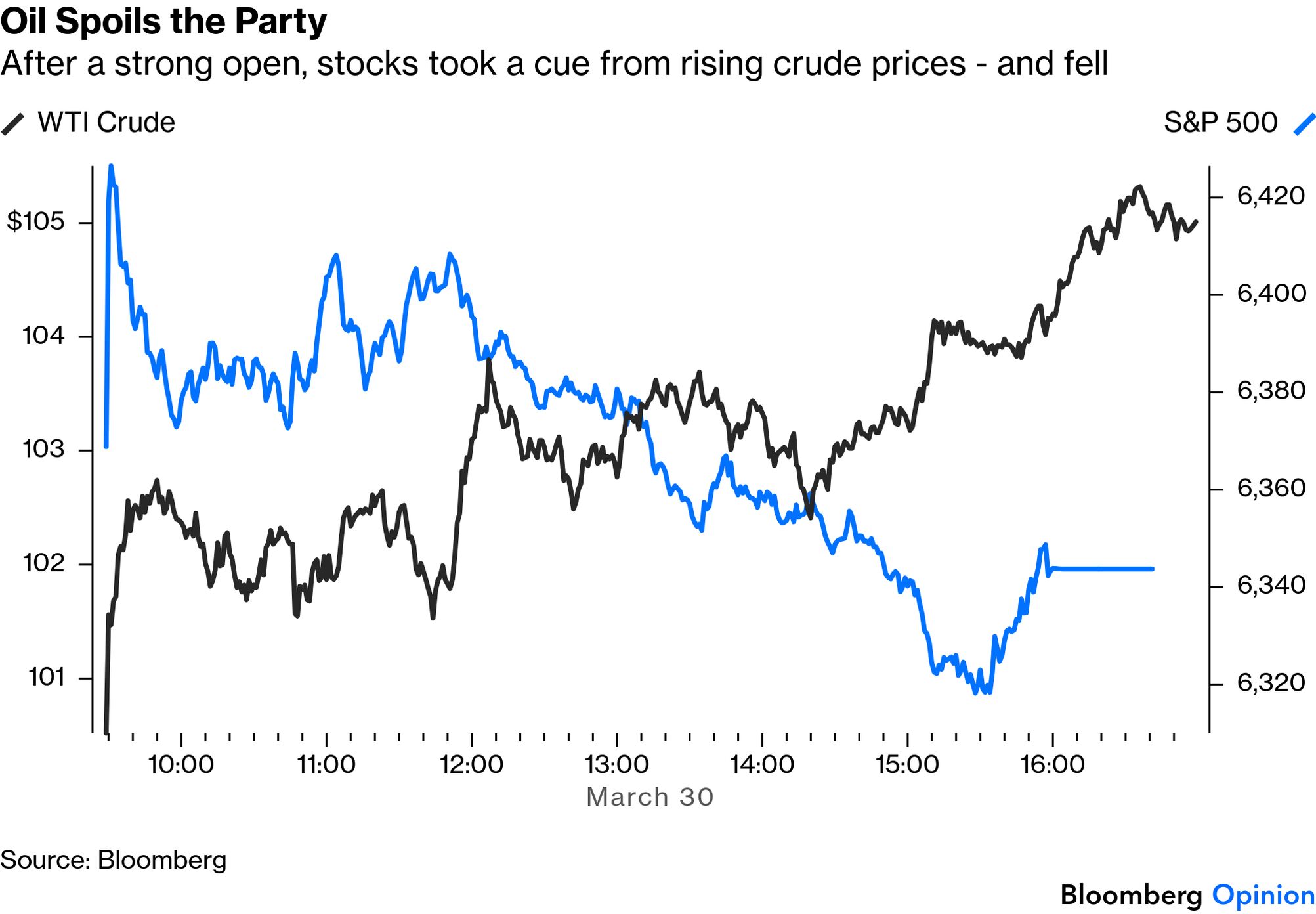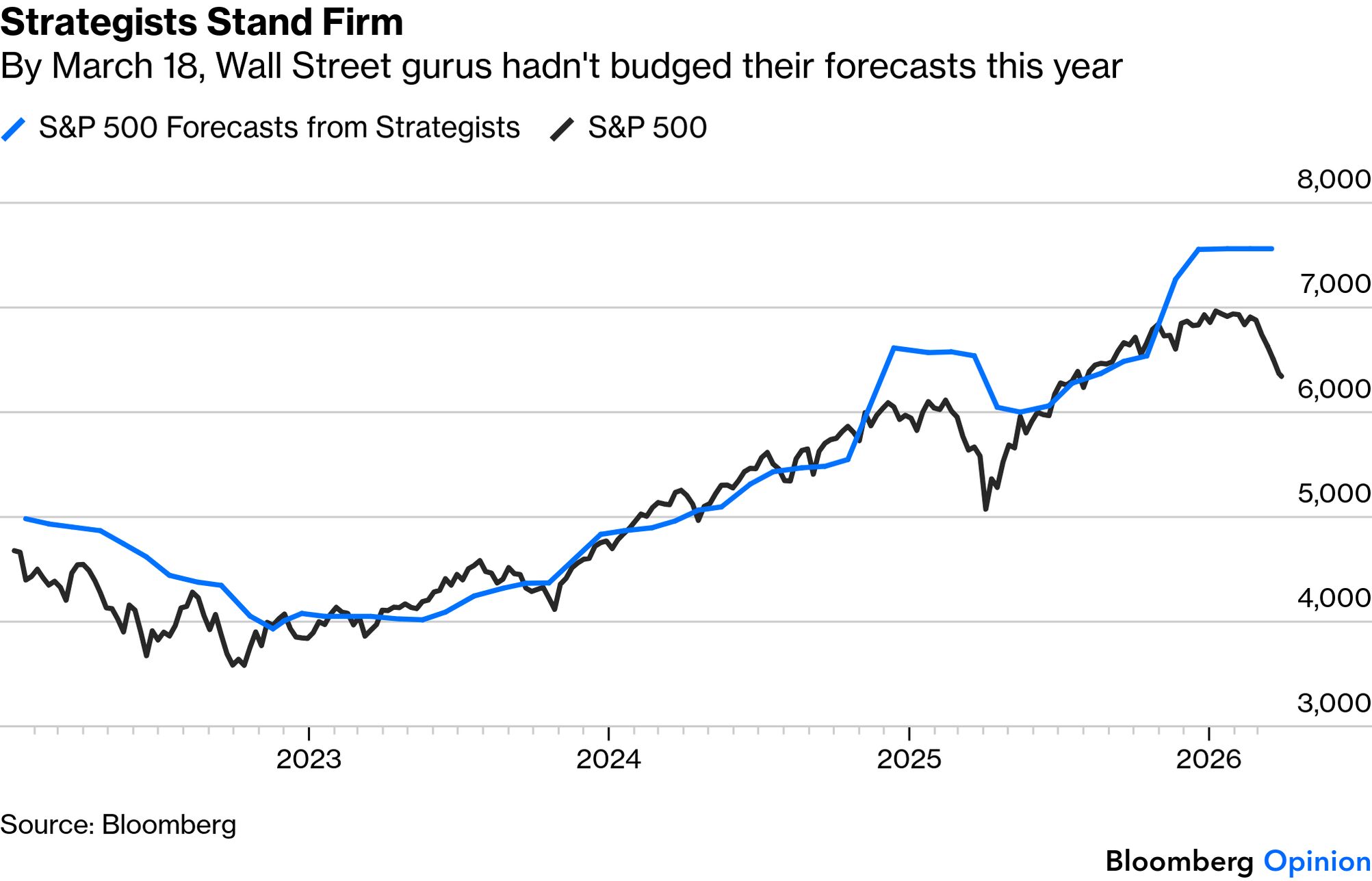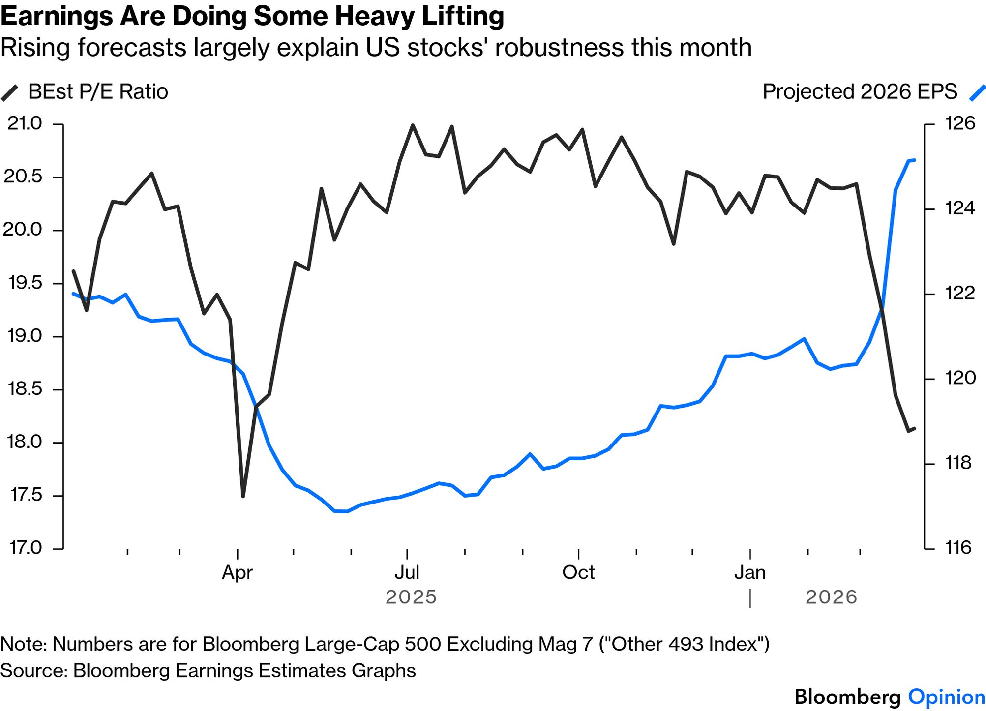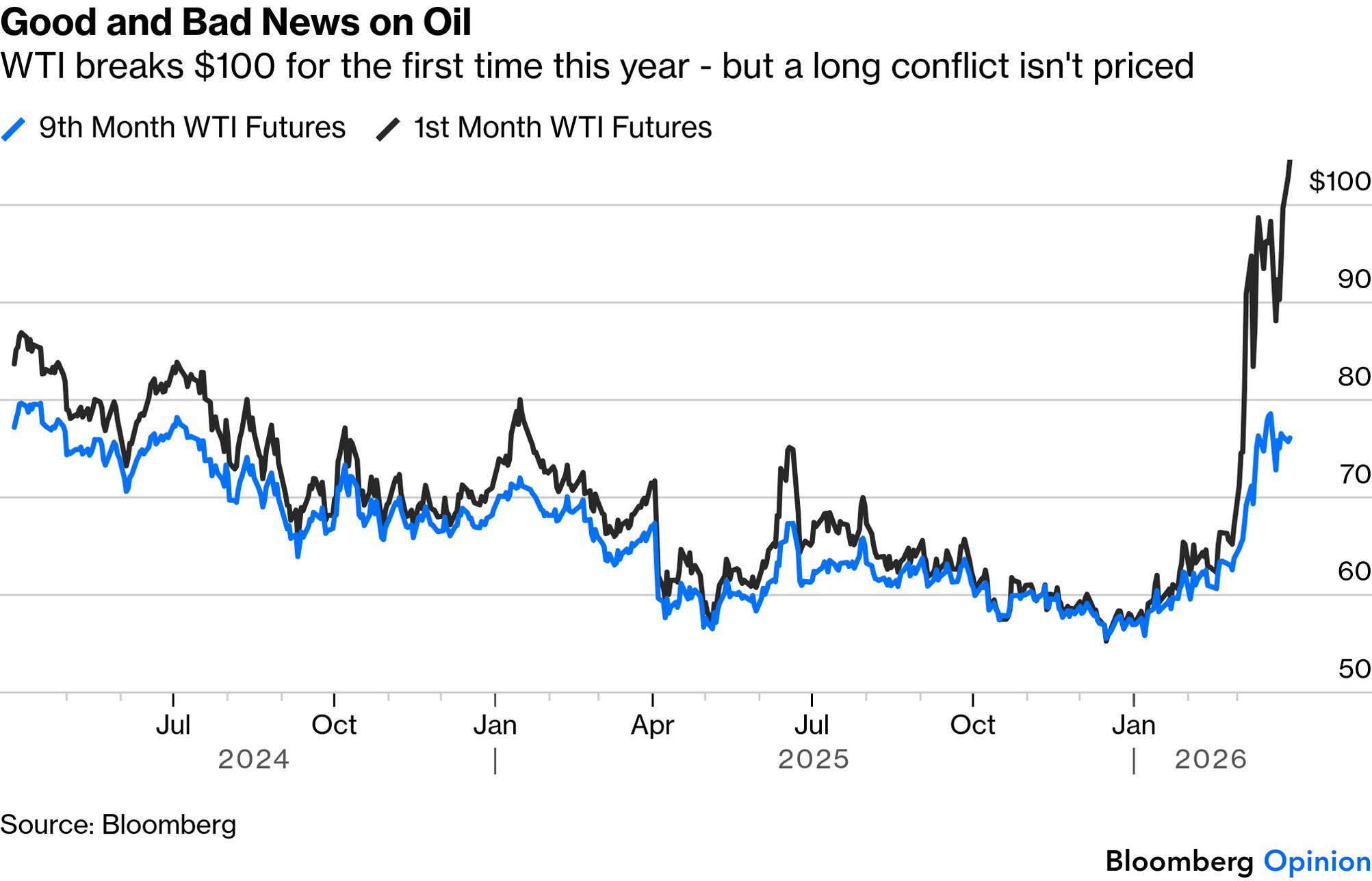 Put differently, stocks are almost in the textbook world where they follow a "random walk" incorporating all news as soon as it is known. Usually, waves of sentiment ensure that moves aren't truly random. But now, we need to keep watching the news and be prepared to react. It's the uncomfortable reality of the moment. Market catharsis — the moment when fear finally overcomes greed and share prices stage a big fall to catch up with bad news — is surprisingly elusive. Because it depends on mass sentiment as well as the news, hope can delay it, but not indefinitely. The relevant example for today is, yet again, the Yom Kippur War of 1973, the oil embargo that ensued, and the subsequent bear market in stocks. The conflict had a worse impact on the US equity market than either of the world wars, but it took a while for markets to grasp that. A coalition of Arab nations led by Egypt and Syria attacked Israel on Yom Kippur, the Jewish Day of Atonement, which fell on Oct. 6. In response, US President Richard Nixon organized an airlift of arms to Israel, which prompted the world's most important oil exporting countries to impose an embargo Oct. 19. The UN-negotiated ceasefire followed on Oct. 25; the embargo remained in place. The S&P 500 peaked the next day, at which point it had gained 2.3% since the outbreak of hostilities. Only then did catharsis ensue: Even after the embargo was lifted the following March, US stocks had almost 40% further to fall before reaching their 1974 low. The gas lines and trauma to public sentiment didn't immediately dissipate. If this seems baffling in hindsight, bear in mind that history at that time gave no useful guidelines. For the first quarter-century after World War II, the oil price was stable and controlled. It began to pick up after the end of the dollar's peg to gold in 1971, but nothing prepared traders (or the broader population) for what would happen once the embargo came into force: If the oil price were to repeat its 277% rise in the six months following Yom Kippur, that would imply a price for Brent crude of $275 by the end of this year. That seems almost unimaginable today — just as nearly $12 oil was in 1973. What is perhaps worrying is that crude futures show that traders are behaving as they did in the 50 years that followed the Yom Kippur War, and working on the assumption that any spike will be reasonably short-lived. WTI futures for nine months ahead are still below their level of two years ago, even as short-term prices move far ahead: The futures market may well be right, but if it isn't, the bad news will have to be incorporated into oil and stock prices. Hard economic impacts of big geopolitical shocks take a while to have an effect, while market prices, refracted through human emotions, take even longer. For now, traders are guarding against the considerable upside risk that the Iran conflict is resolved without significant long-term effects on oil supply. If the major interruption to supply actually happens, then stock market catharsis still lies in the future. Good Reasons to Postpone Catharsis... | The value of stocks, textbooks will tell you, ultimately depends on the discounted present value of the future cash flows they will generate. If the discount rate goes down — as it did when bond yields dipped Monday — that will help increase the value. More importantly, and harder to track, higher estimated earnings will tend to push up the price we should pay now. So far, the conflict has had minimal effect on earnings estimates. If we exclude the Magnificent Seven platform stocks, indeed, we find that 2026 earnings per share estimates for Bloomberg's index of the "other 493" of the 500 biggest US stocks have risen sharply this month: That gives greater reason to hope for the future, but also casts stocks' resilience in a different light. The Iran war's hit on forward earnings multiples has been almost as serious as last year's selloff around the Liberation Day tariffs drama. The loss of confidence in stocks looks less severe because of the earnings momentum, but the hit has been serious. That momentum might also help to explain why Wall Street strategists have reacted with calm to the conflict. Last polled by Bloomberg News colleagues led by Lu Wang on March 18, they haven't budget their end-year estimates at all. That mirrors how they behaved during the Liberation Day selloff last year, and it worked then: The first quarter is about to end. If companies have bad news to get off their chests about the effect the war is having on the bottom line, they'll probably start pre-announcing once the long Easter weekend is over. Until such a time as that happens, what remains a positive earnings outlook remains a good reason for delaying catharsis. If profits are really growing like this, it's invidious to get out of stocks now and let someone else buy them cheap. |