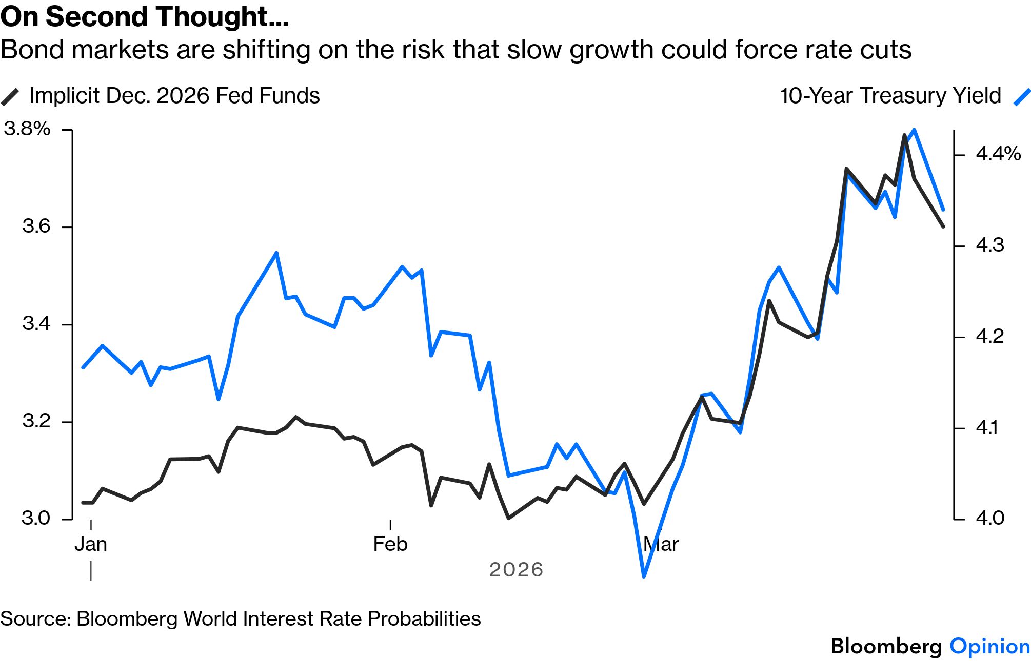 | Assumptions were made to be broken. An oil price spike automatically raises prices, so it's bad for inflation. That generally causes bond yields to rise, as the assumption is that central banks will have to raise rates to combat the higher prices. But it also acts like a tax hike, forcing consumers and companies to spend less on things other than oil. All else equal, that justifies a rate cut, and lower yields. Further, the logic of bonds is that they act as a shelter in times of stress — which means investors buy them during extreme uncertainty and conflict, like the past month. Thus it's always been strange that the bond market unambiguously reacted to the Iran war's inflation risk, but not to the threat to growth, and sent yields higher. Until now. Both yields and rate expectations for the Federal Reserve suddenly dipped Monday: It's not obvious why this happened when it did. Traders entered the crisis with leveraged positions, meaning that some of the rise in yields since then has come through a classic trading squeeze. Also, comments by Fed Chair Jerome Powell in the US morning helped further dispel the notion that rate hikes were a certainty. The immediate effect was to spark a sudden recovery in equities despite another dispiriting weekend of news from the Gulf. To quote one macro strategist: Interesting. Equities trading much better because Fixed Income is trading much better. Fixed Income is trading much better because we suddenly chose to fear growth more than Warflation.