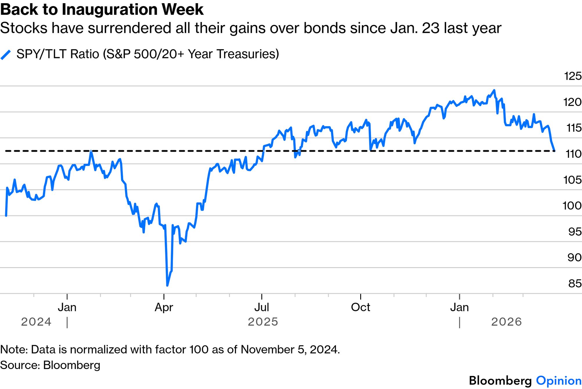 The classic measure of a growth scare is to track the performance of stocks relative to bonds. On that basis, although nothing like last year's Liberation Day selloff, the fall in stocks has now brought them back to their level of inauguration week in January 2025. Since then, stocks and long bonds have exactly matched each other: The bond market did allow a nice lift for stocks at the US opening, but it didn't last. Even when handed an excuse for a rally, equities didn't take it. That was mainly because of the oil price, with West Texas Intermediate, the main US benchmark, closing above $100 for the first time since the attacks on Iran began. (It fell later after the Wall Street Journal reported that Trump was considering ending the war without reopening the Strait). As Points of Return has covered, the markets remain on alert for a relief rally, and this is deterring many from selling. Measures that normally gauge extremes of risk appetite suggest that people are now negative enough for a rally to start — but the problem is that this selloff isn't a question of risk appetite. To quote Harry Colvin of Longview Economics: Equities are in an environment when you have all these technical and sentiment risk appetite models that really suggest you should get involved and buy again. But markets aren't really driven by risk appetite so much as news flow. If it does rally it's probably an opportunity to unload more risk, absent some sort of resolution of this conflict.