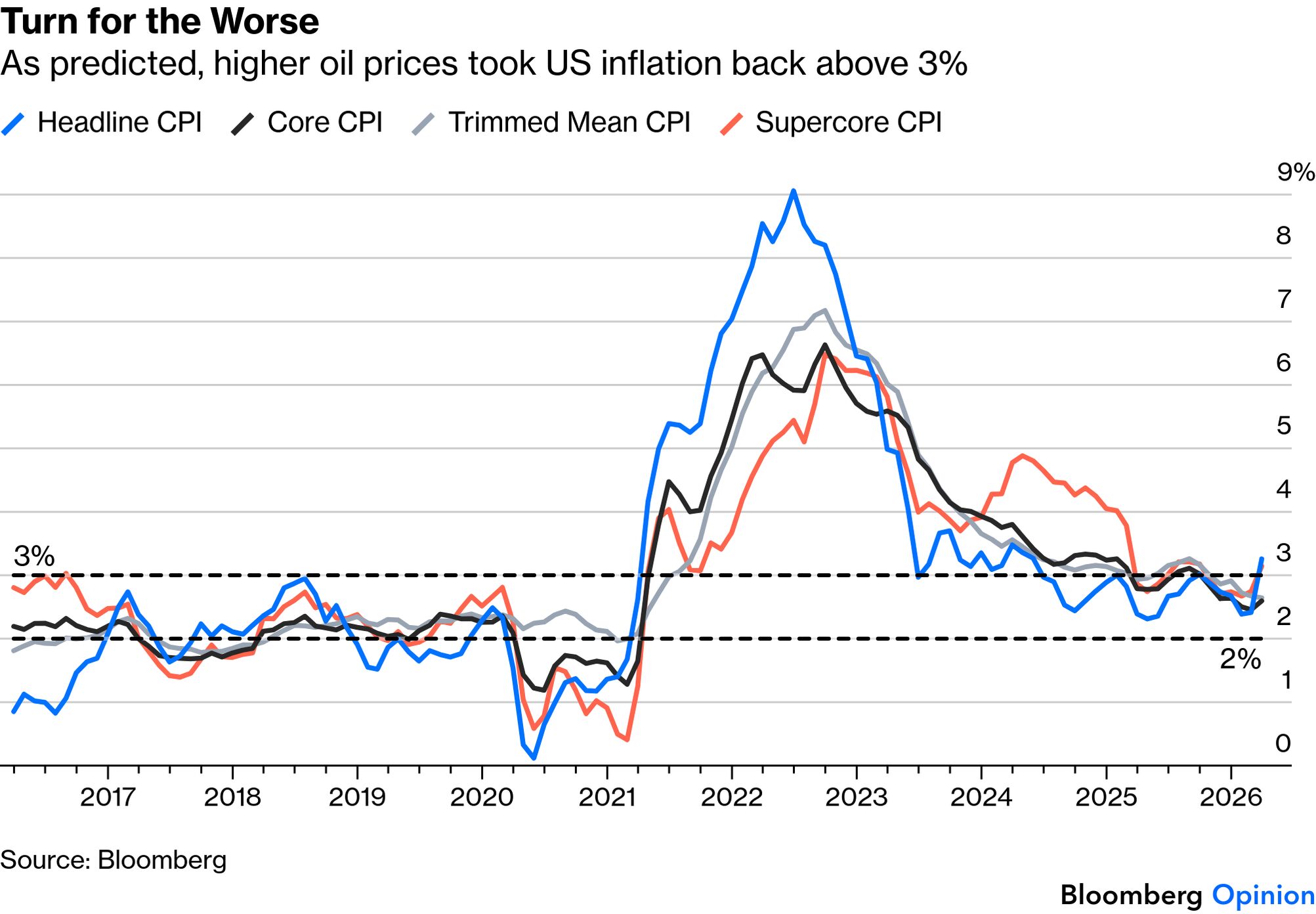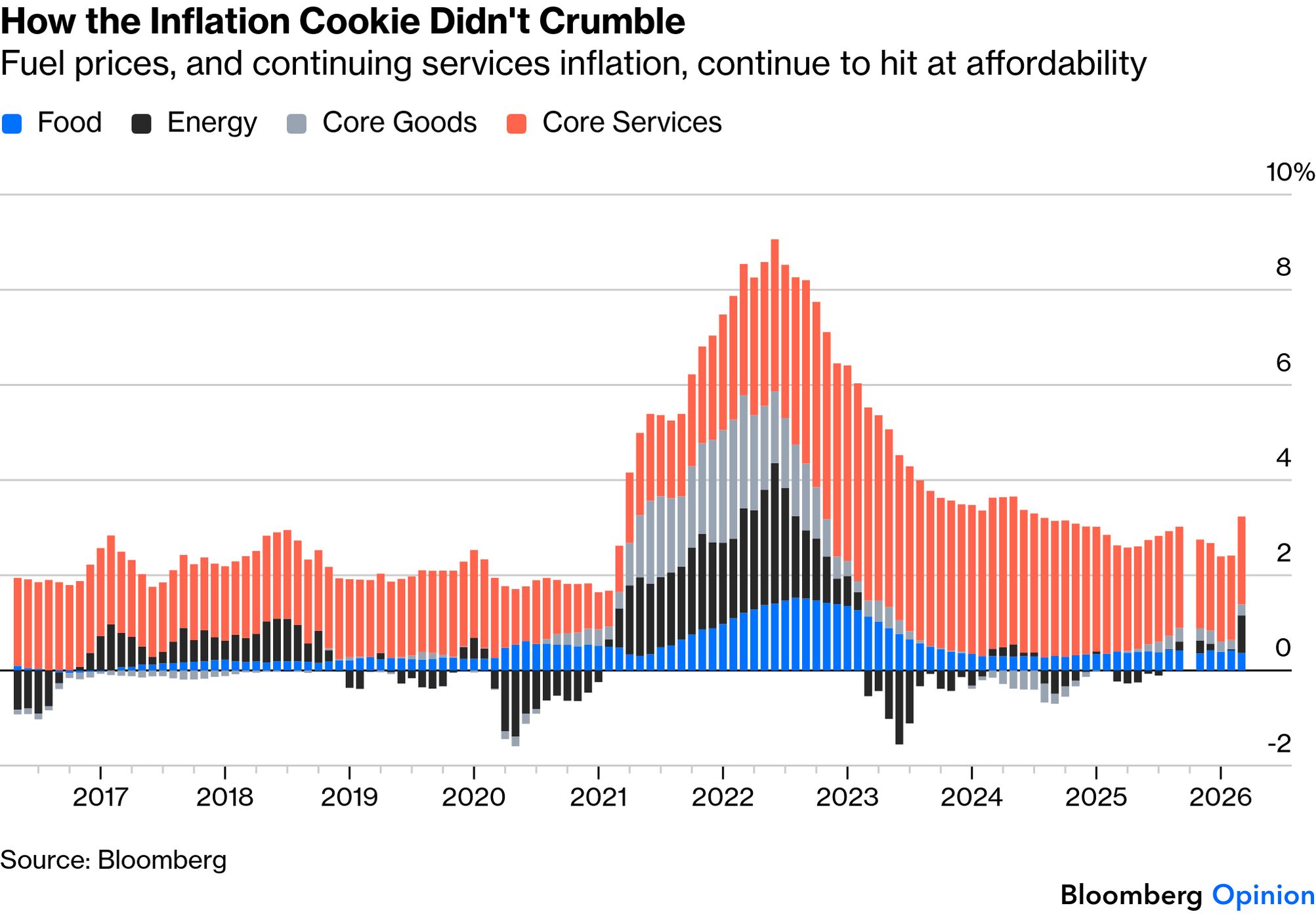 Neither the trimmed mean CPI (where the biggest outliers are stripped out and the rest are averaged) nor the core, excluding food and fuel, topped 3%. Tariffs are still not having anything like the severe effect on goods prices that many of us expected, and higher oil is not yet having a secondary impact on other prices. But the Fed’s own “supercore” (services inflation excluding shelter) has also ticked up, which is unwelcome. And a standard breakdown of inflation into its four main components reveals that all are rising. This isn’t disastrous, but it’s certainly not good: