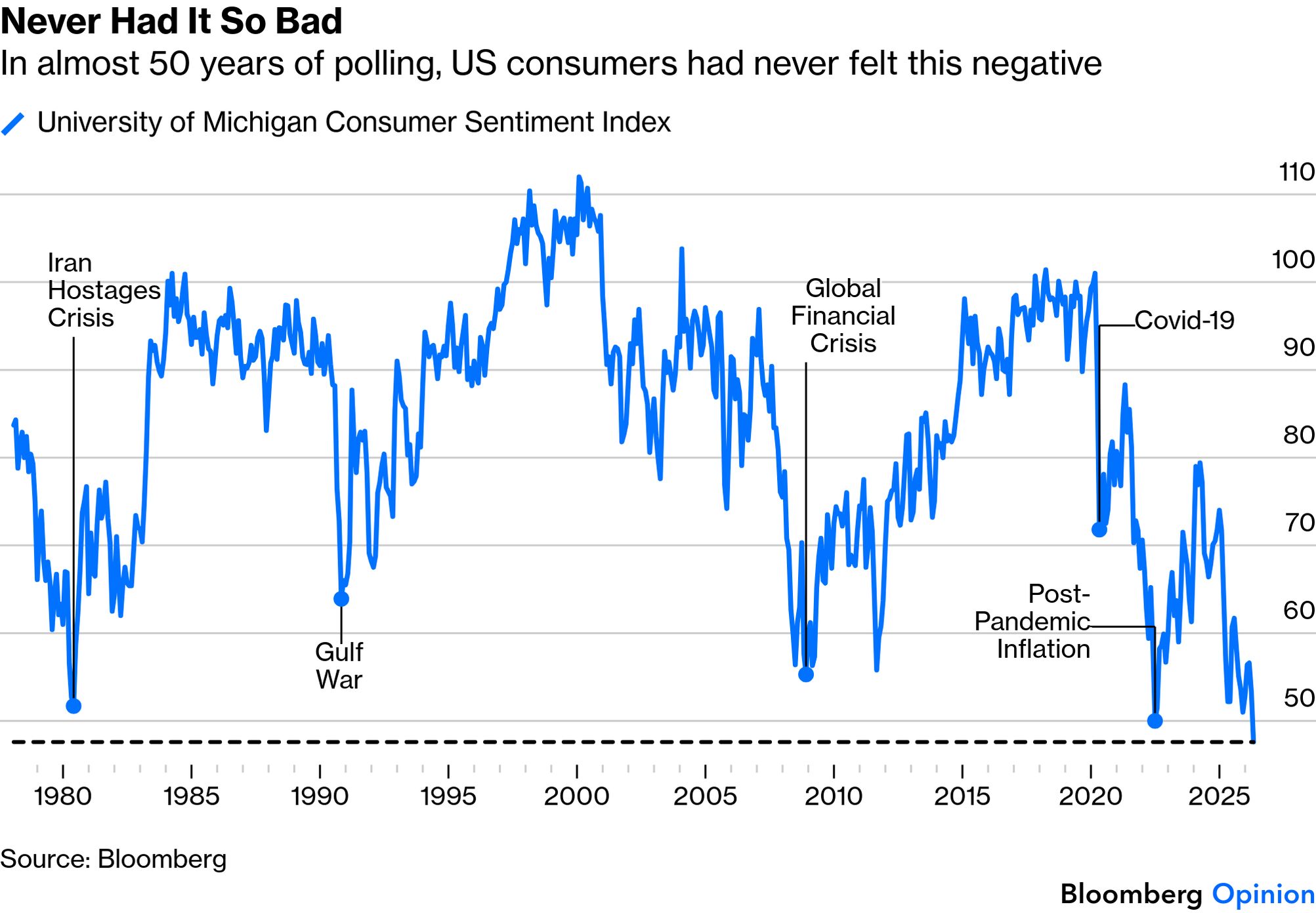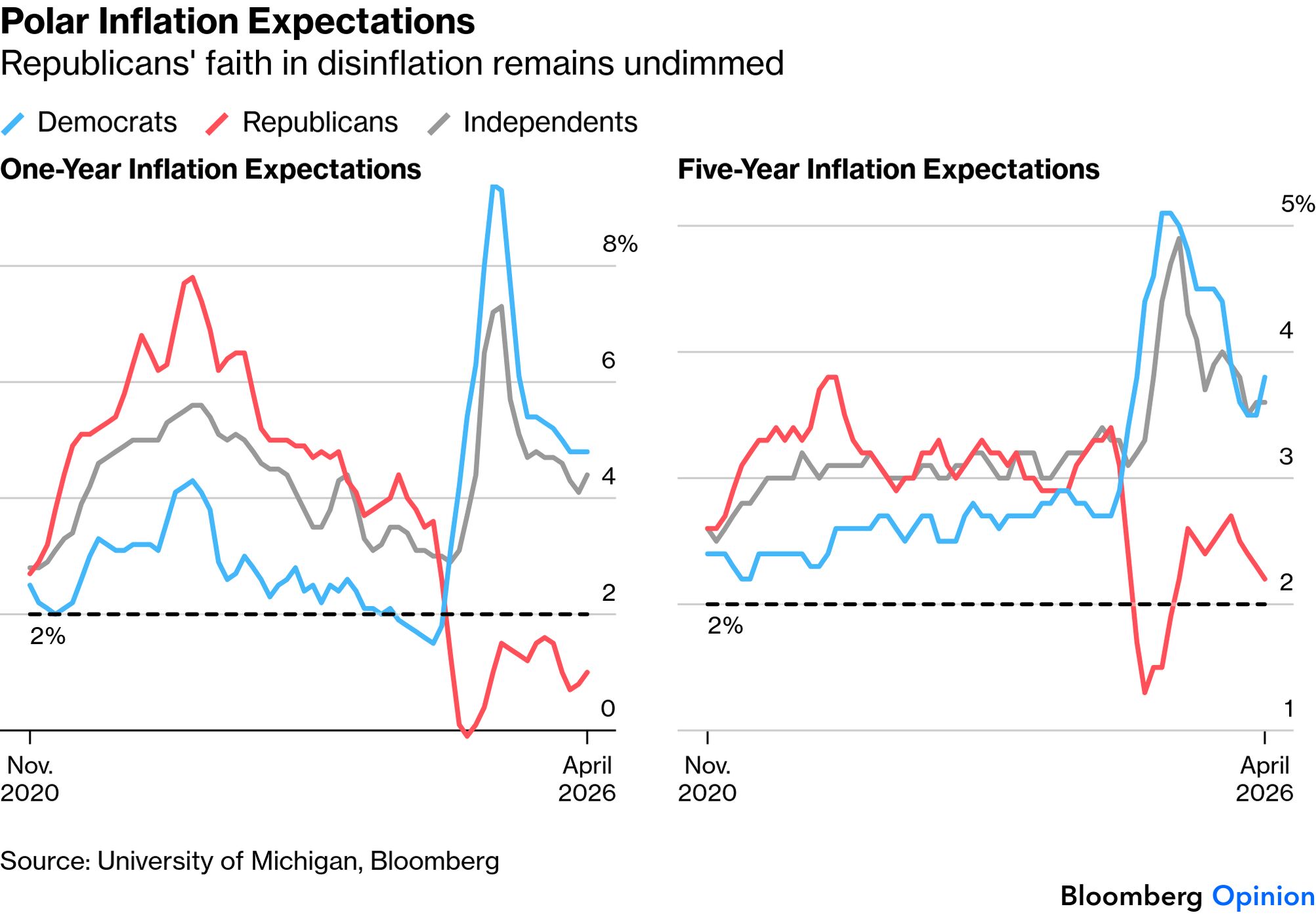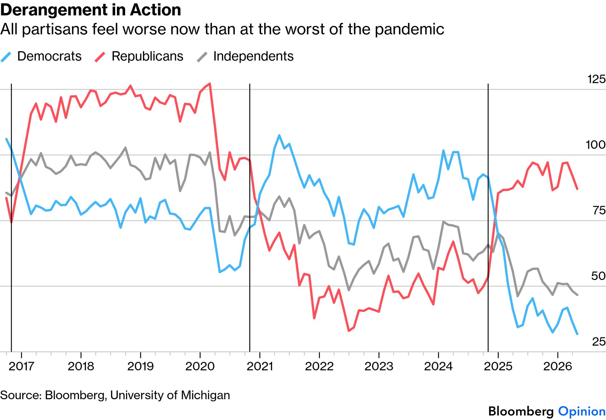 Despite many measures of the economy remaining robust, apparently people feel worse than they did during the hostage crisis of 1980 or the Iraqi invasion of Kuwait 10 years later, two previous occasions when the Gulf came to dominate debate. They’re more morose than at any time during the Covid pandemic. Some of this can be attributed to political polarization, the curse of the age. Michigan has been tabulating results by political identity since 2016, and both Democrats and Republicans obviously allow their ideology to color their assessment of the economy. The negativity is extreme among Democrats, but as Republicans say they feel worse than at any time during the pandemic — until Joe Biden won the 2020 election — there’s little comfort for the administration: